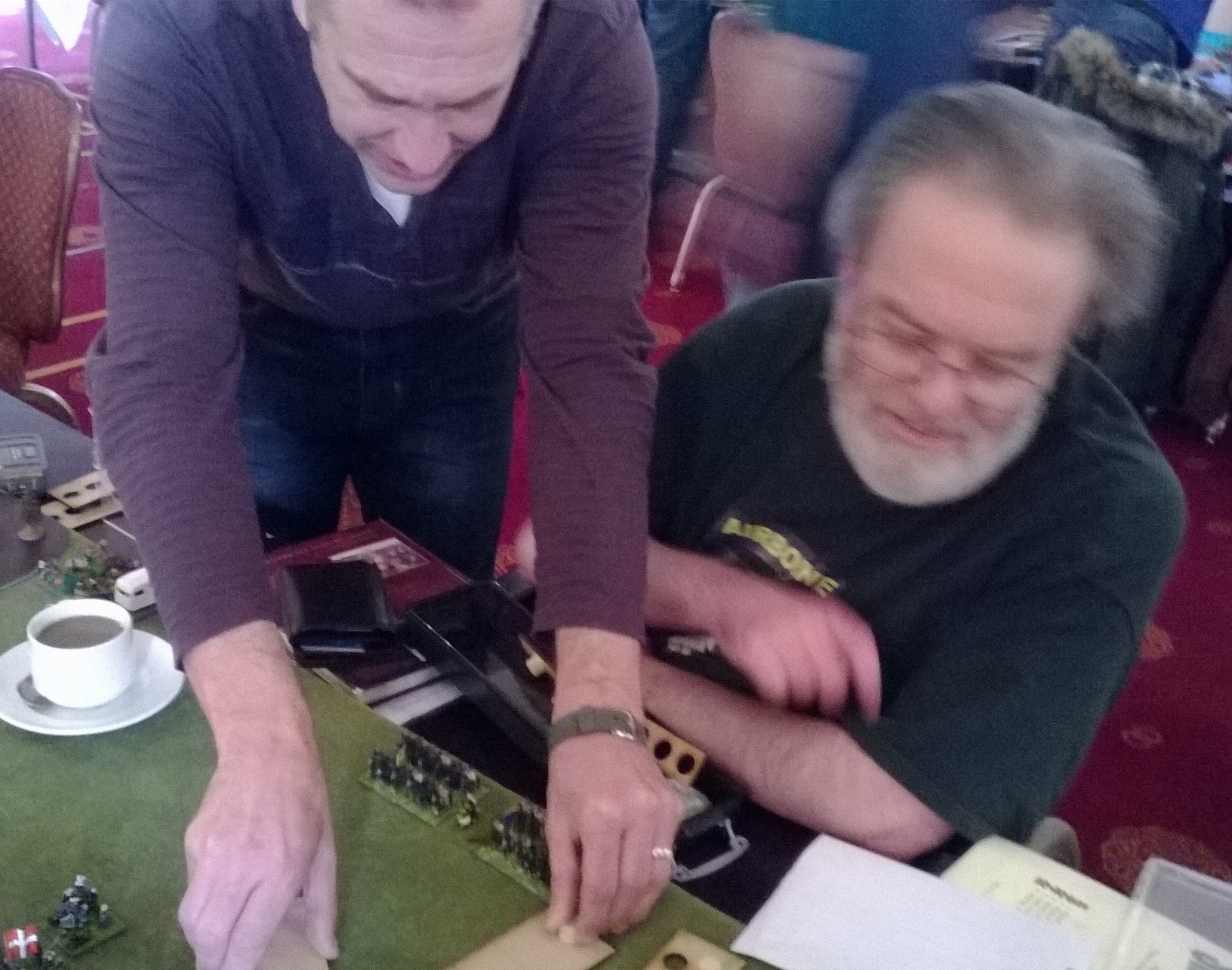 The climax of any visit to any wargames show must surely be an interview with his highness, Mr. Keith McGlynn. To the casual passer-by, he might be dismissed as a cider stained loon but there is more to the man than that. Just look at the action shot below where Keith is forced to retract a number of “ambitious” moves by an irate umpire.
