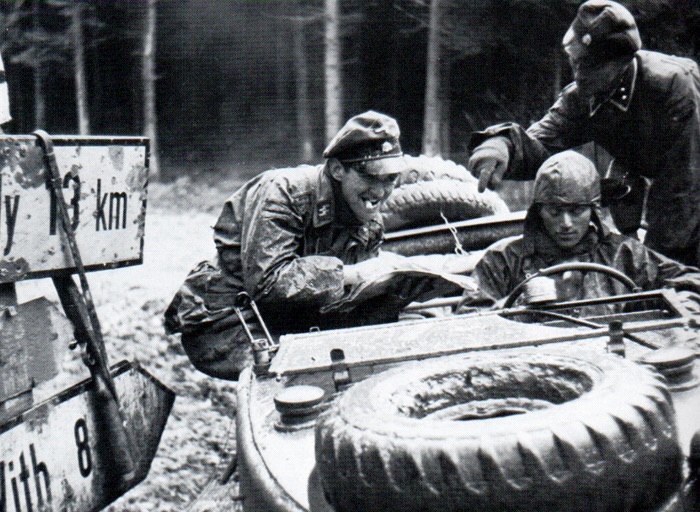 Pumas of the first recce section of the 1st SS battalion move cautiously through the Winter rye. The morning mist masked their shape but the defenders could not mistake the tell-tale roar of the advancing panzers moving towards the Chateau.