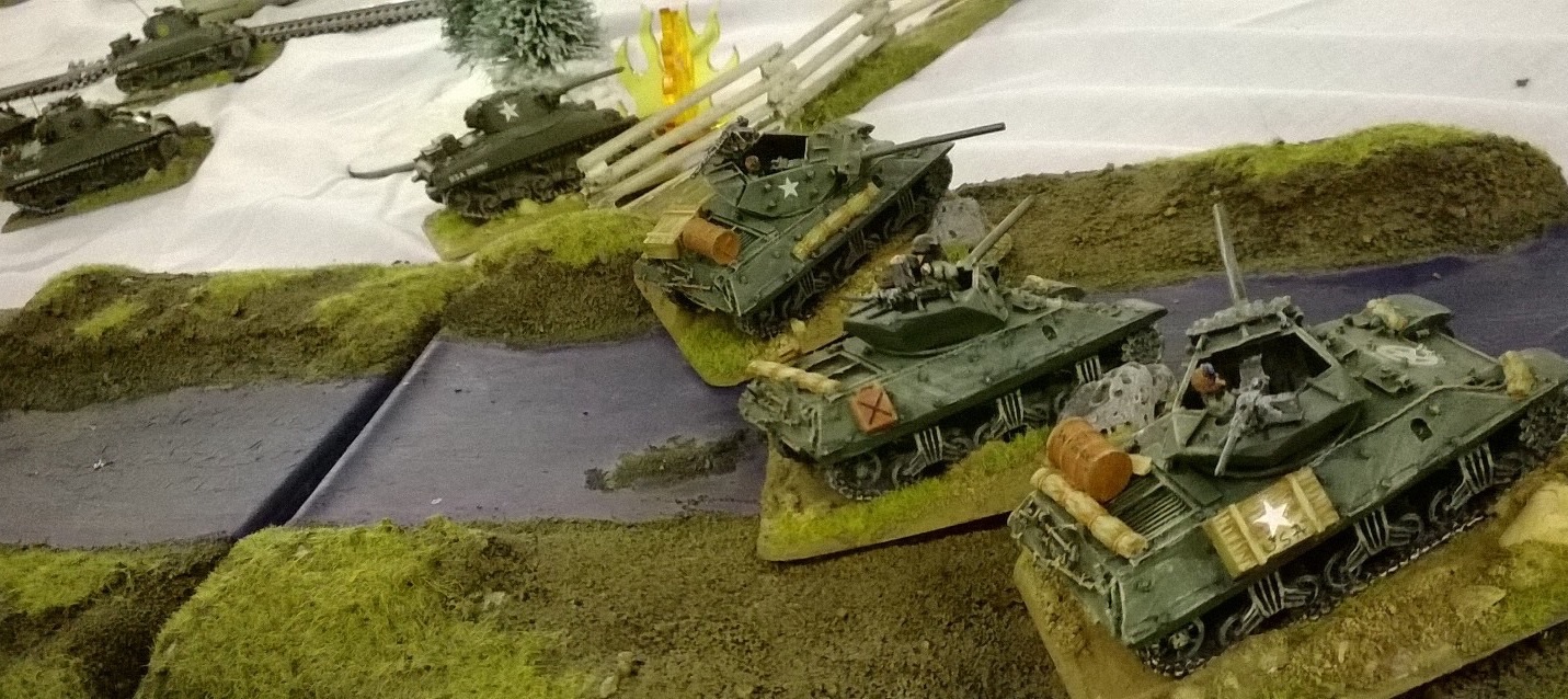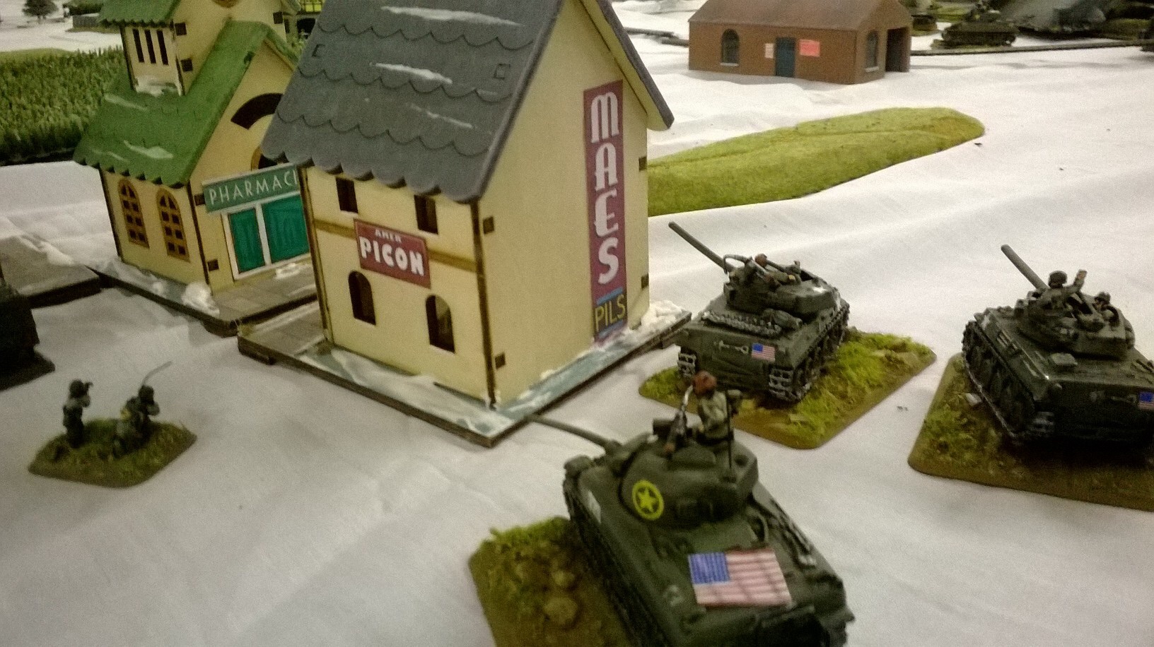 Cetus Ledice was not going to let ” some-Kraut-piece-of-crap” push him off this “goddam piece of US real-estate.” His super-powered Shermans raced forward, guns blazing. If the M10s on the right could flank the advancing German column then he could manoeuvre to the left and flank the heavy armour to the East of the ville.