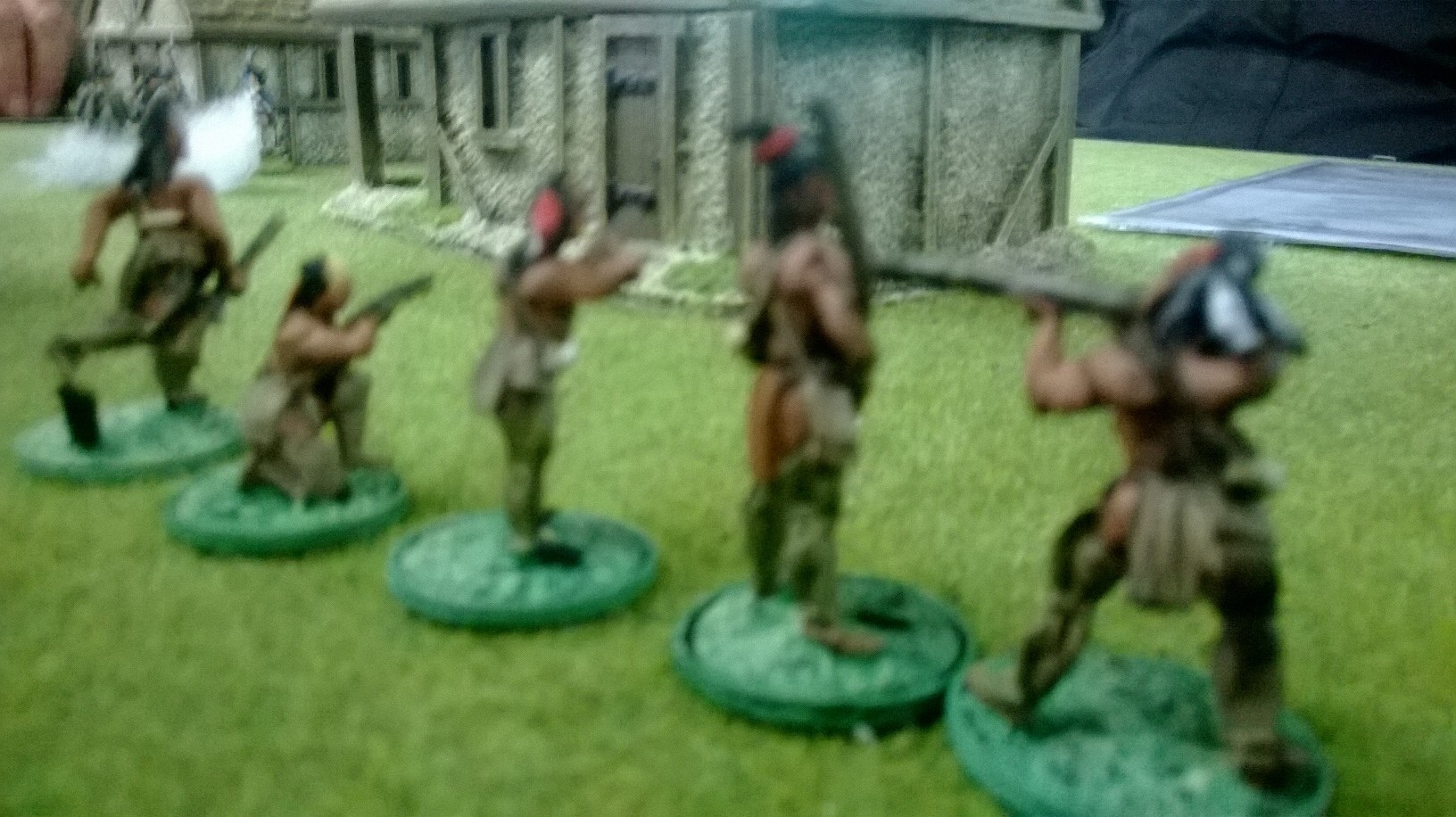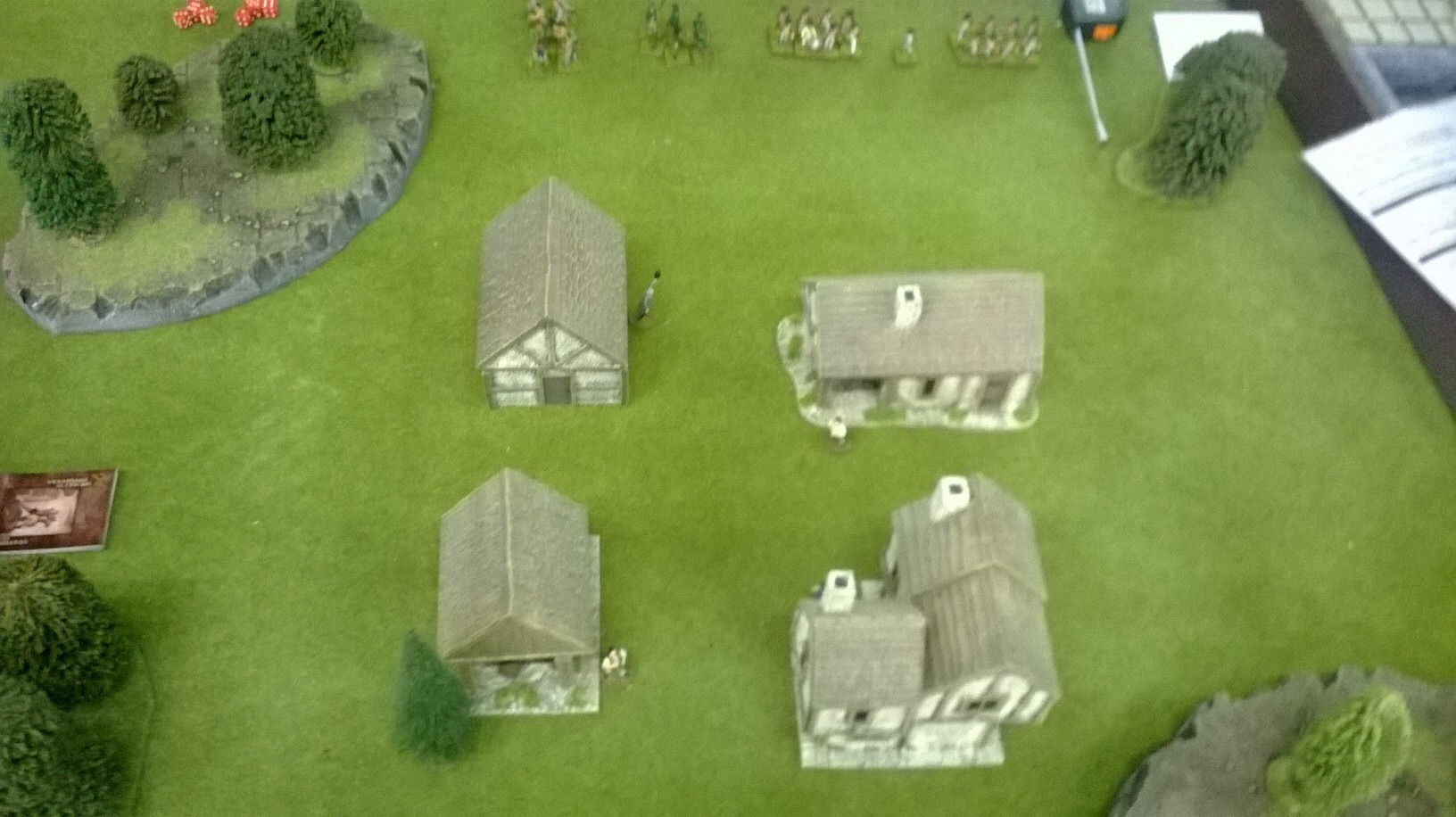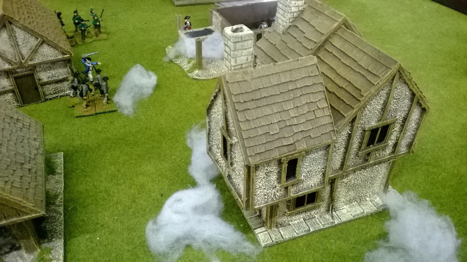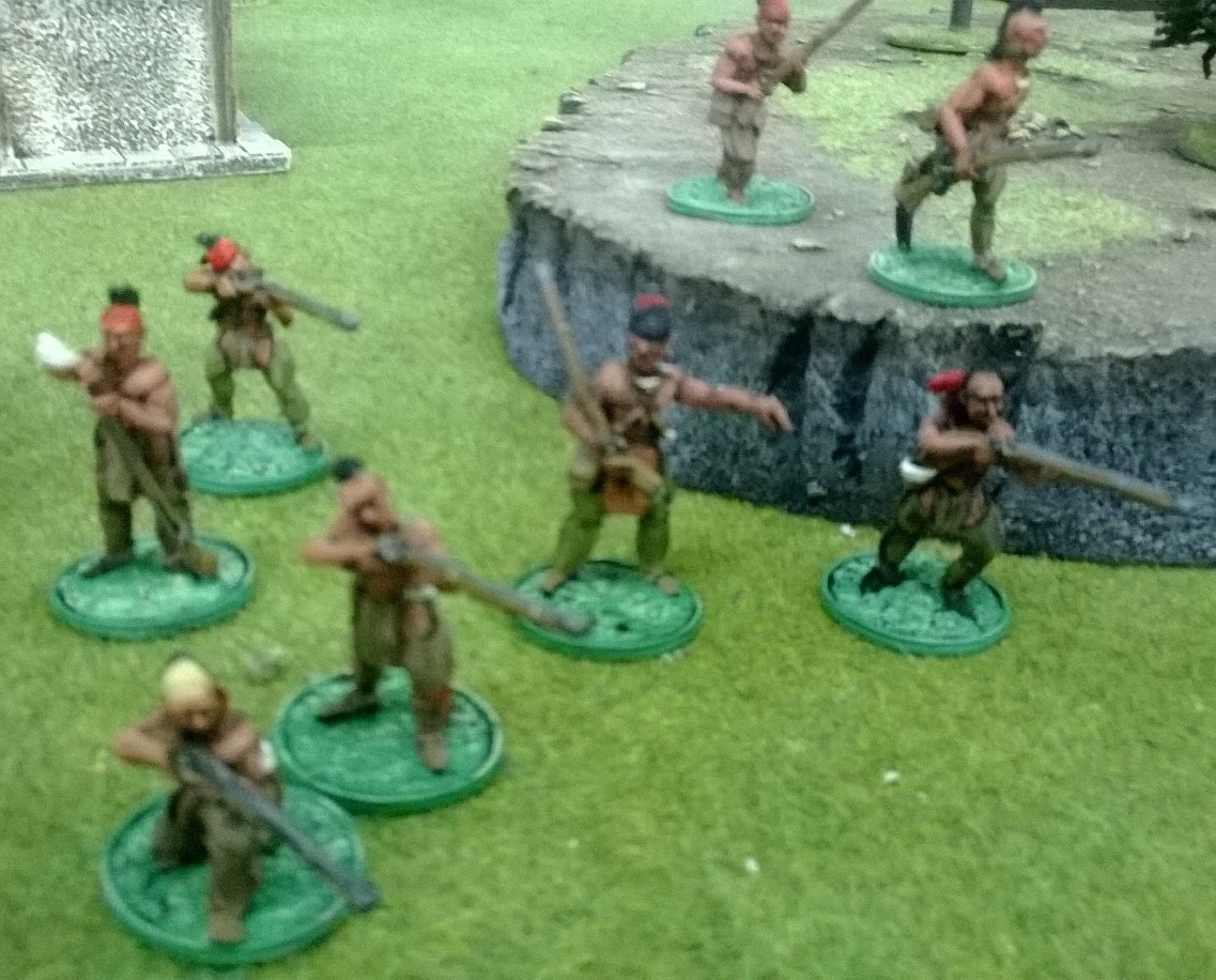 My militia were falling back on my left in the woods. Graham didn’t follow up but shifted his irregulars to the centre. My musketry kept the Tavern’s defenders’ heads down but no progress was being made. Hope lay with my sneaky Redskins……