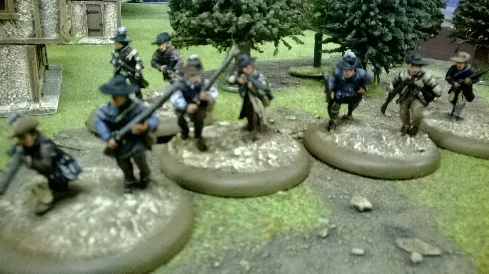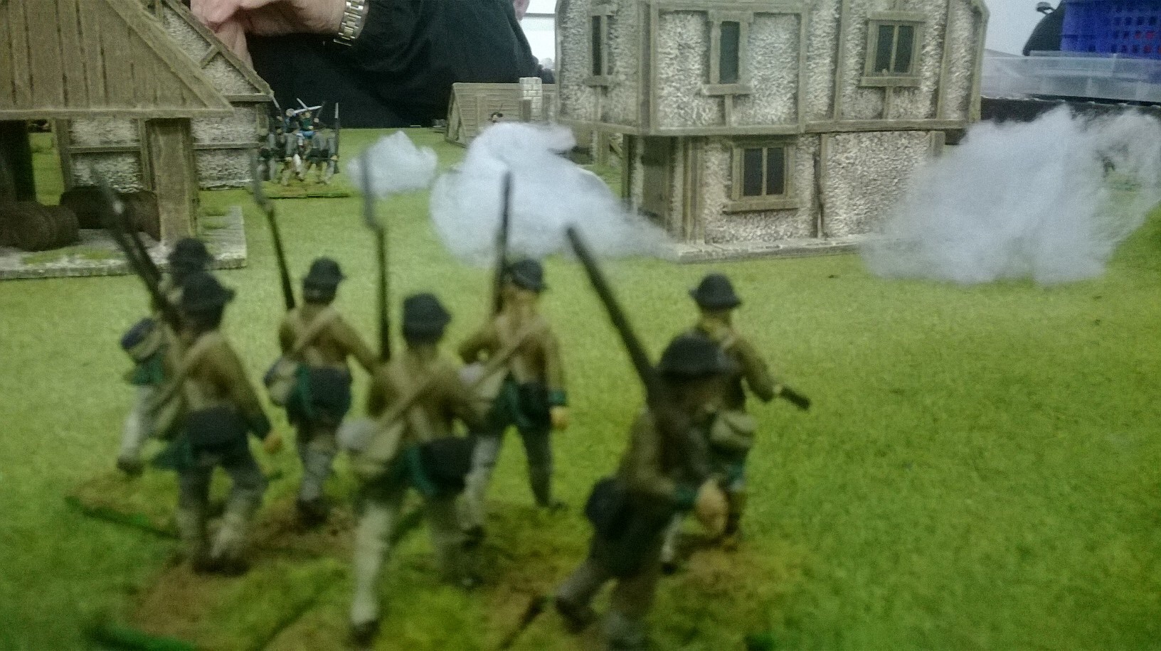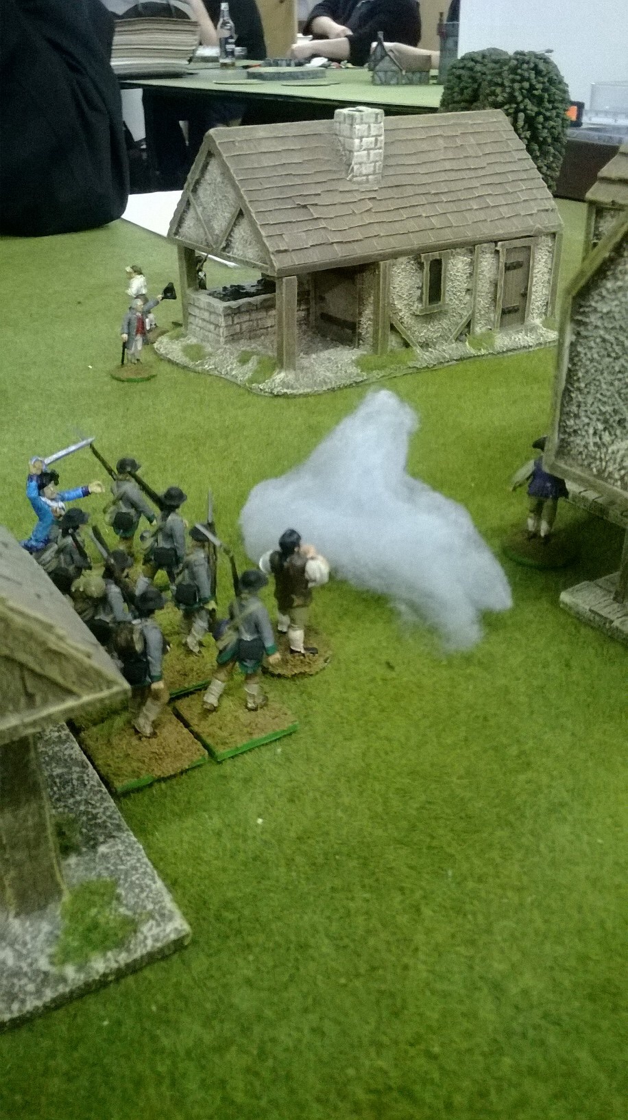 My militia were falling back on my left in the woods. Graham didn’t follow up but shifted his irregulars to the centre. My musketry kept the Tavern’s defenders’ heads down but no progress was being made. Hope lay with my sneaky Redskins……