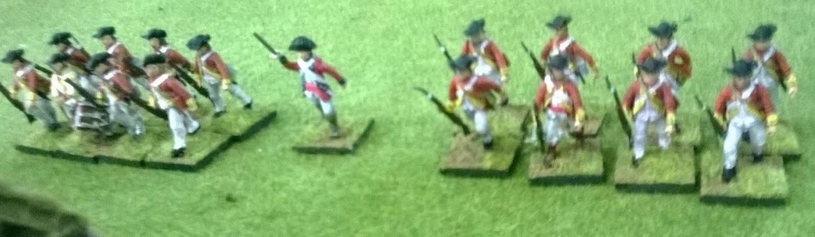 My Indians sought to avoid the centre of the village. It turned out that sending ‘natives’ into the settlement would of sent all informants into allegence to the opposing side. My regulars were less subtle. Two platoons formed firing lines and sent lead towards the redcoats. After two volleys, the leading British platoon sought cover in the nearest building. Unfortunately for me, this is where the secret agent was hiding(along with his “friend”)