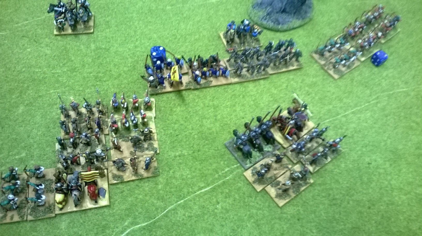 The English army was quite equally divided into three commands. Ken went for a right wing with lots of punch ( four dismounted and two mounted Knights). In the French centre was a bombard and four units of pavisiers. He refused his left wing on the hill , with two elite Knights and three mediocre crossbow units. Bidets skirmished between the French ‘battles’.