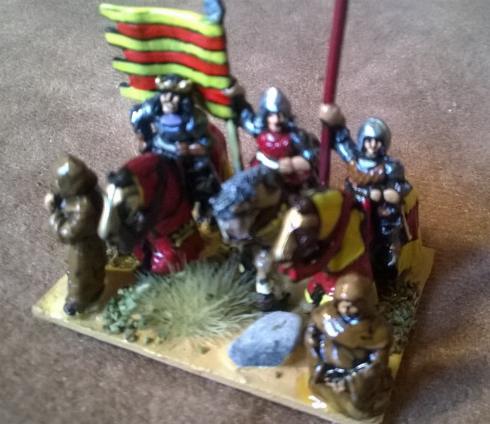 The initial part of the campaign is set in Iberia but that doesn’t mean all the forces are Spanish. Three Christmases ago I helped out Damian of Donnington miniatures and, never one to forget a debt, I was presented with these at Devizes for services rendered. They are superb miniatures and a joy to paint. Also many years ago, the original inspiration for my medievals were those fantastic coloured woodcuts of the time. The plan was to keep to those colours; bright green, red, blue and yellow, with black armour.
