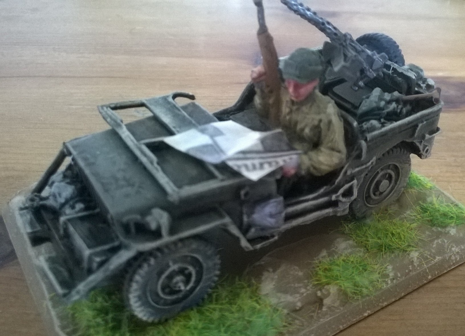 During July I have been desperately trying to finish projects off. My attempt to put together plastic WW2 infantry was a disaster! The finished miniatures looked like relatives of Quasi Modo! All I could salvage was a forward air controller and a jeep. I even managed to mess up the construction of the jeep and had to mask the absence of a steering wheel with a strategically placed map.