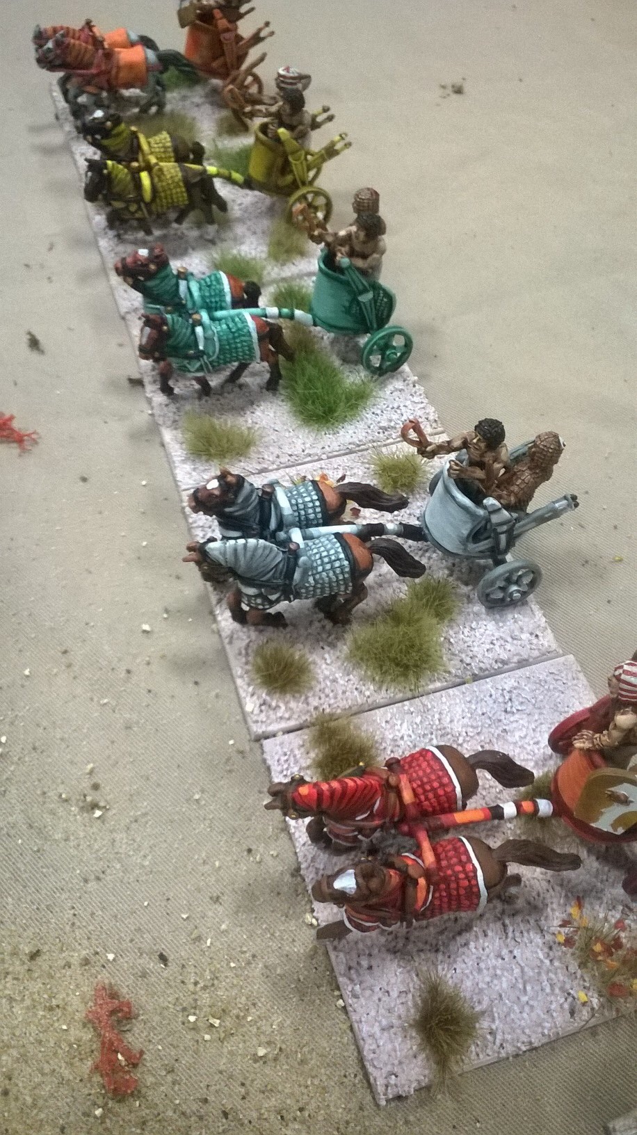 I placed my subject spear and javelinmen in a strong position between a hill and some rough ground. My knights I should have sent on a flank March but instead I decided to face off the Egyptian chariots.