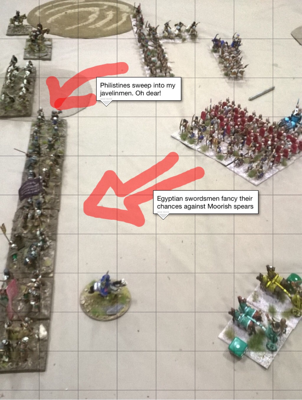 Well much to my surprise, and Jimmy’s consternation, the elite knights sent the skirmishing horse off the table and scattered the Pharoah’s go-carts. However, it was on my left where the action was decided….