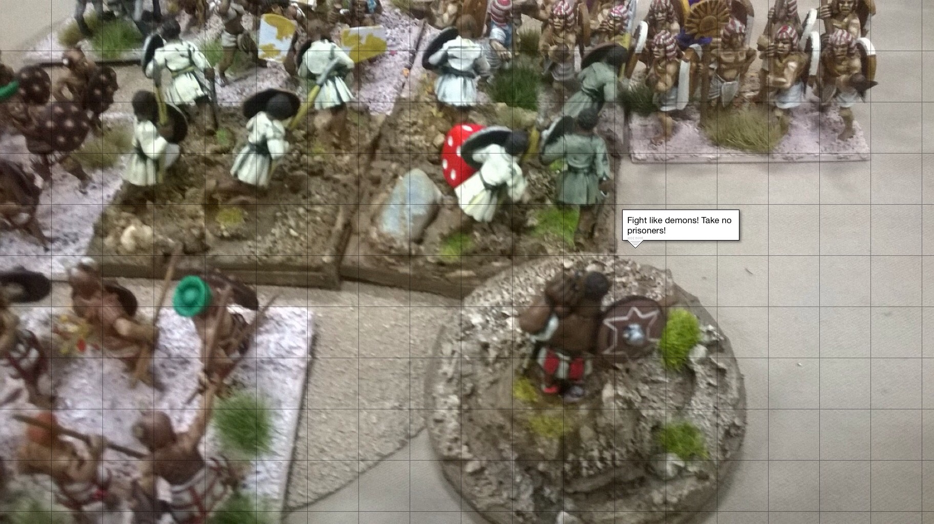 On the right of the Spanish line, my crossbows and javelinmen prevented the chariots closing. In the centre, the Greeks were losing quite heavily and were a few units away from being broken. But then…