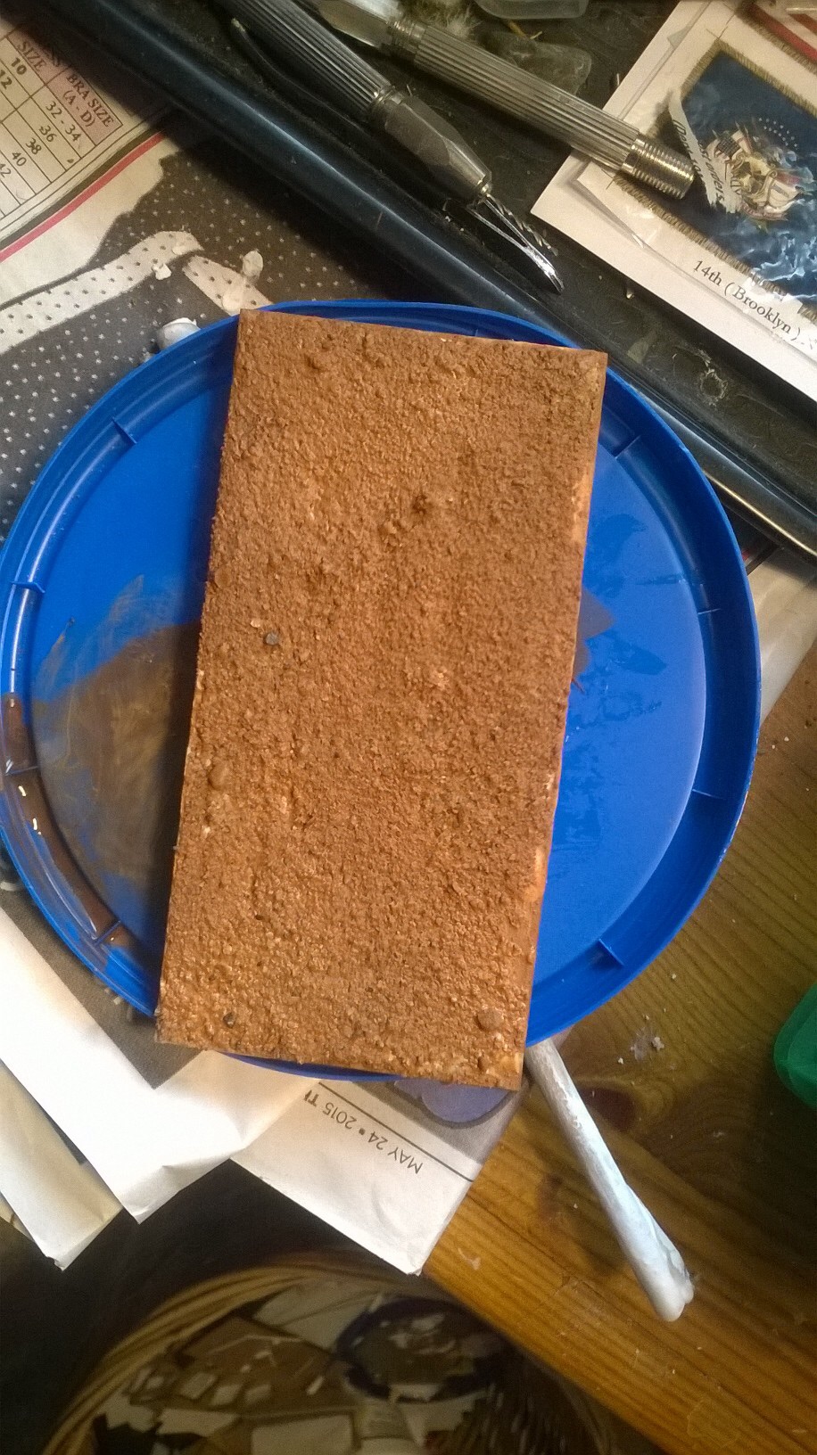To help the sand stick, score the MDF in a criss-cross pattern. Cover the pieces of MDF in wood glue or PVA, then sprinkle builders’ sand or grit from the cactii growing section of the local garden centre. Remember to steal samples of artificial grass for another project. You may need to spread some more watered down PVA over the sand to get a good grip.
