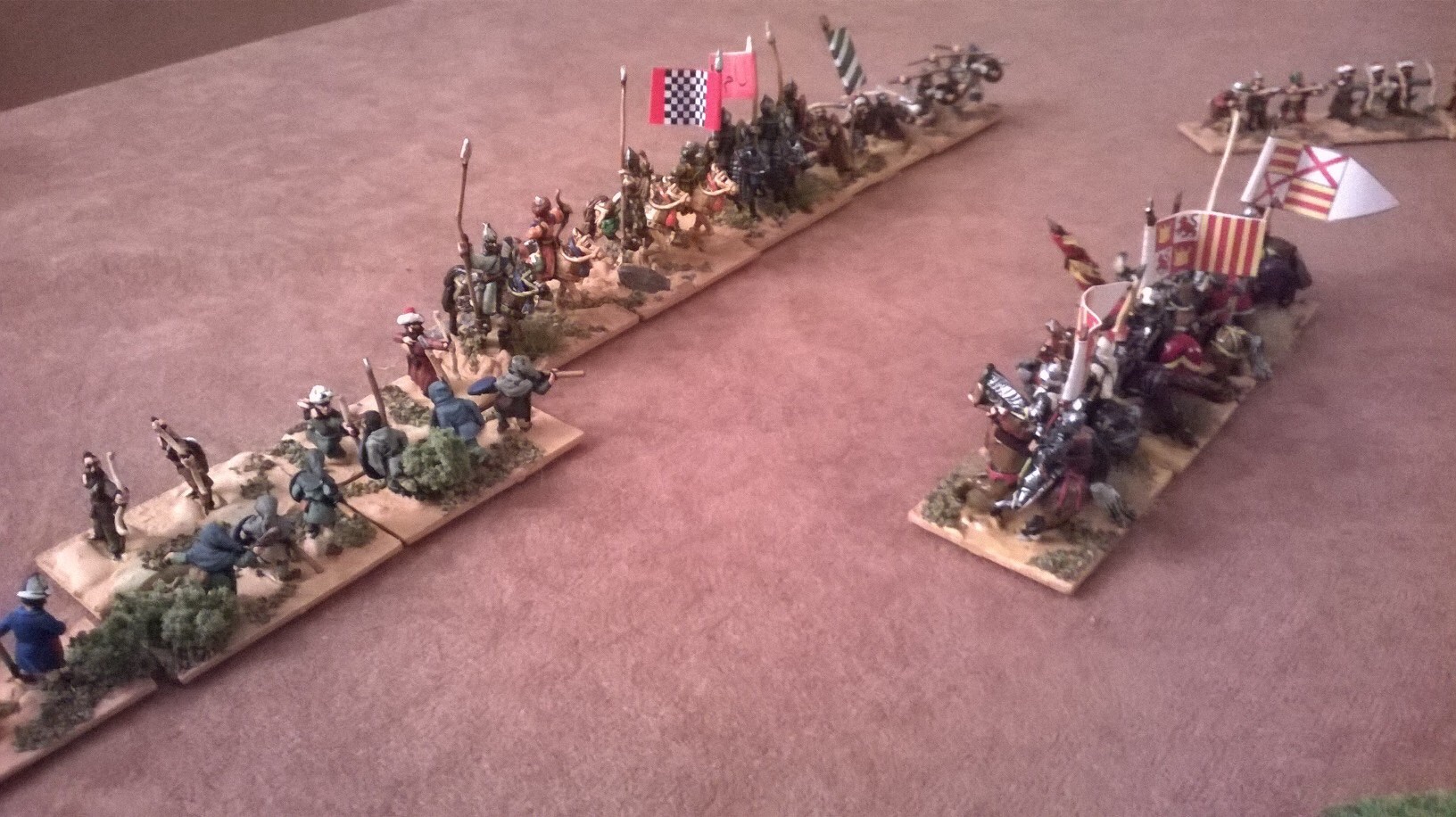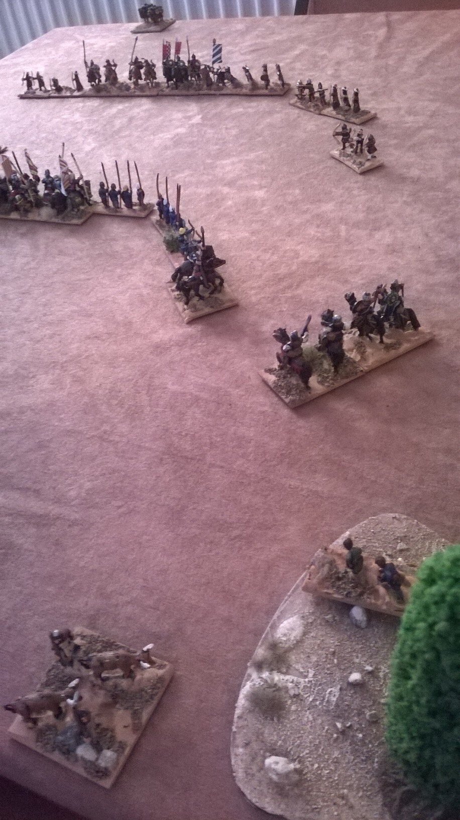 Jon was using the new DBA version 3 command radius to full effect. Thankfully my spearmen were ready to refuse the right flank. Skirmishers with slings and crossbows prepared to sell themselves dearly against the Moslem horsemen.