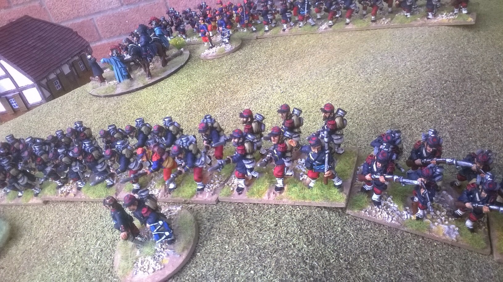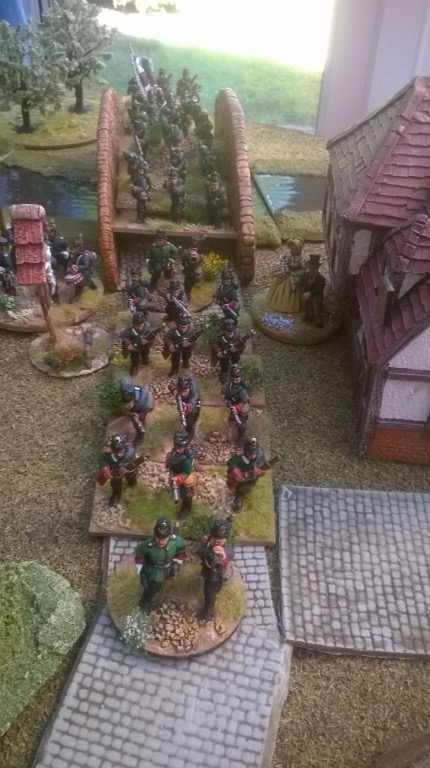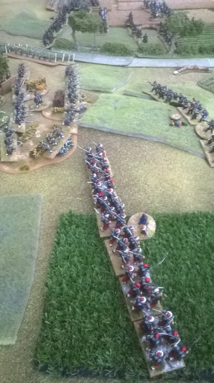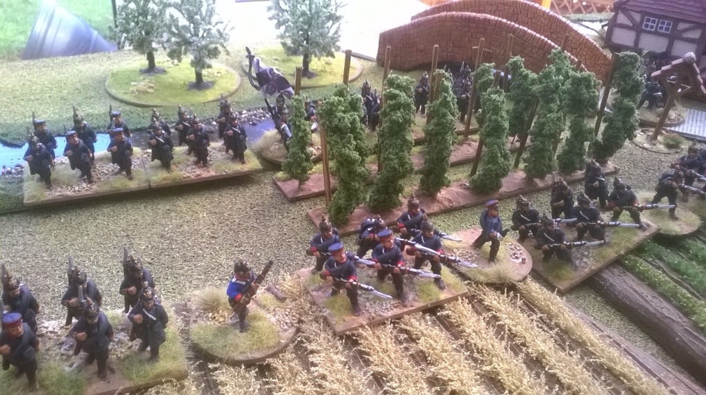 We used Mike’s skillfully amended Regimental Fire and Fury rules. The amendments allow the Prussians to thicken their skirmish line whilst retaining a formed line and a reserve. The French looked nervous as the Prussians arrive at the Sauer River.