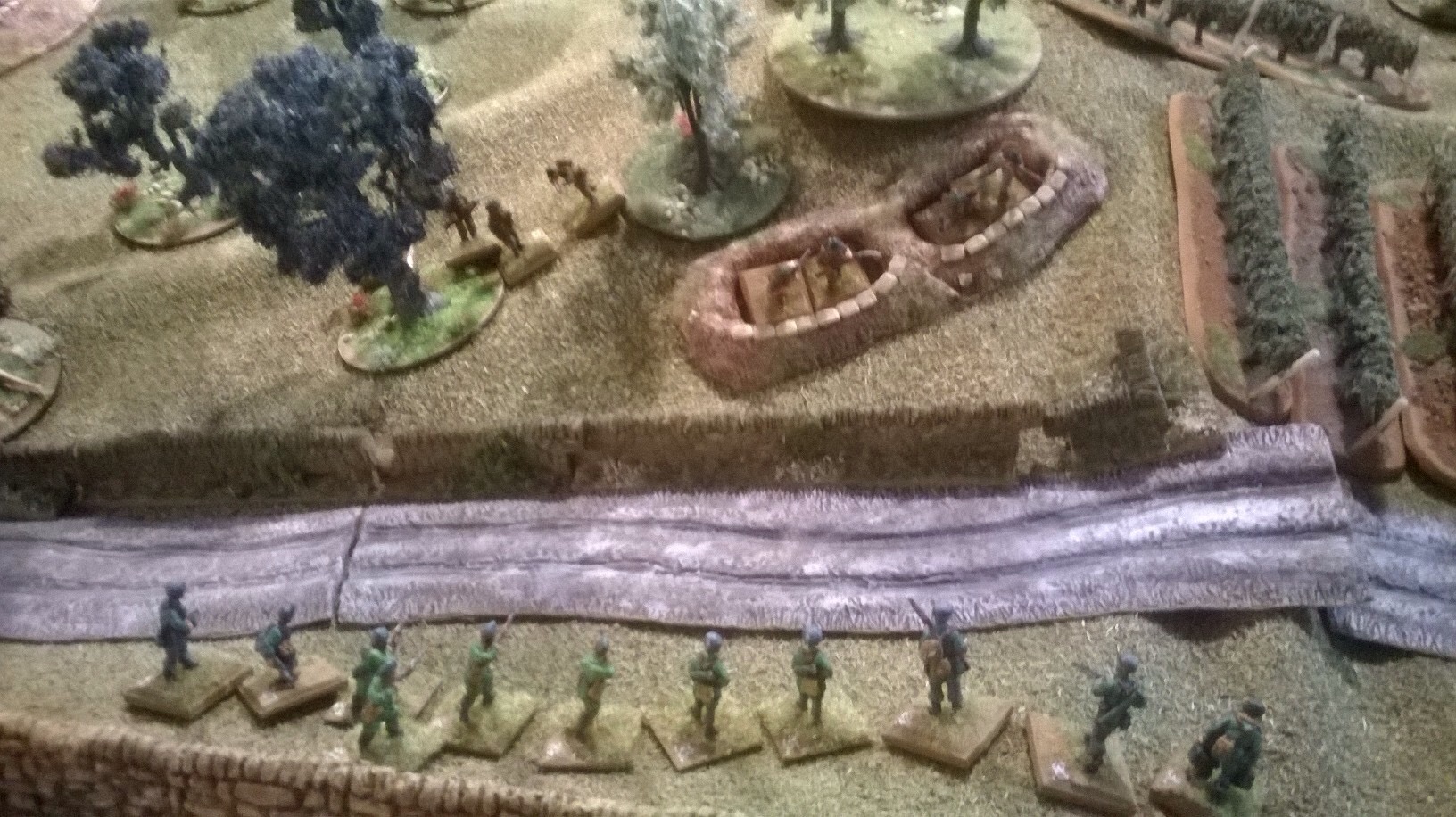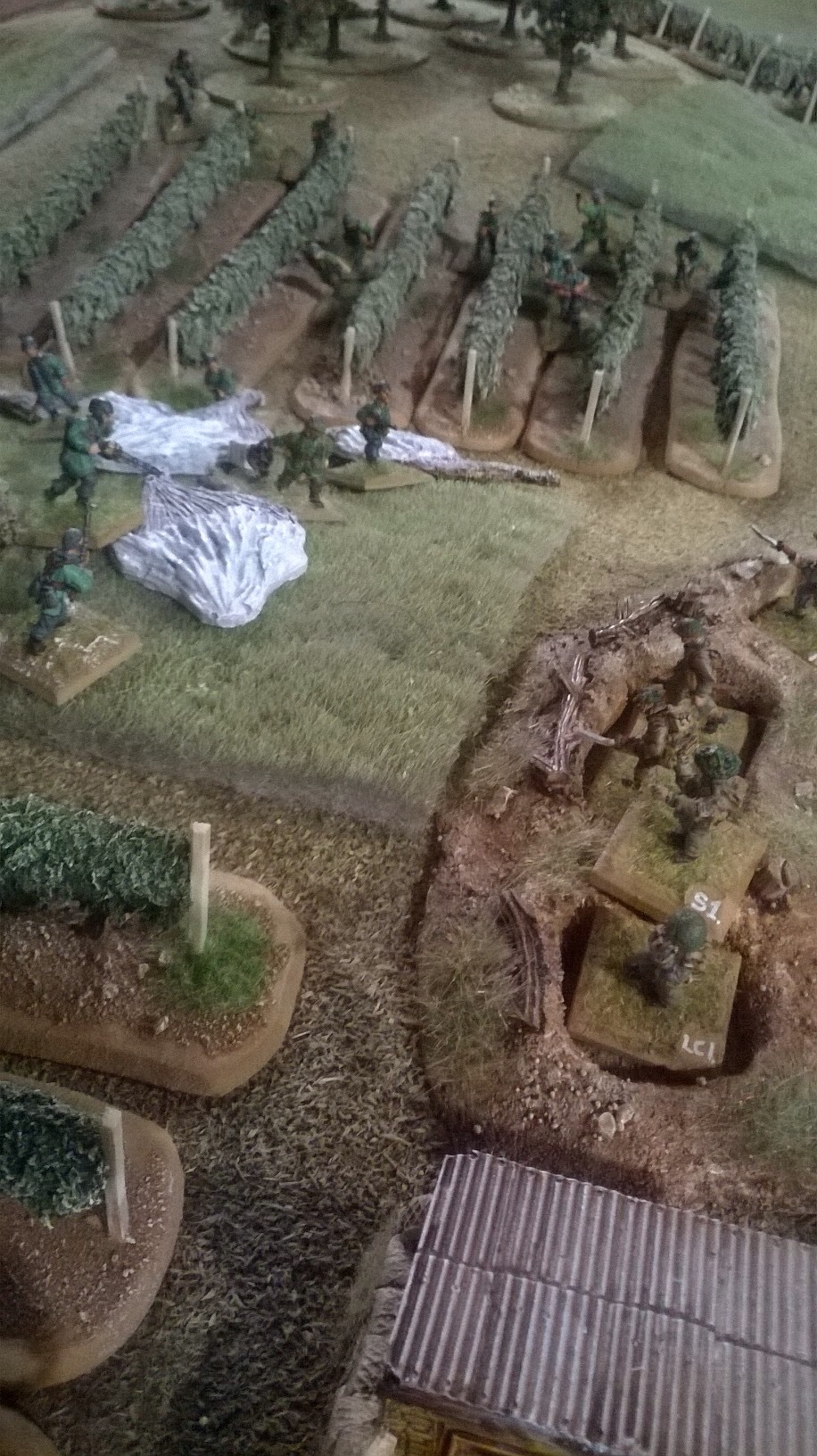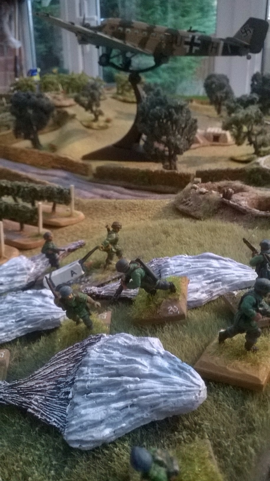 I chose the Fallshirmjager and elected to take a flight path along a low ridge that I calculated would save me from the Bofors below. My first section made a perfect descent and then took up position to cover the entrance to the ravine. My platoon headquarters were made of sterner stuff and landed almost right on the entrenched Tommmies at the road junction. Unfastentening belt buckles and finding the drop canisters wasn’t easy with rapid fire from the trenches.  With support from the first section in the orchard, we had a foothold. Third section vaulted the stone wall and charged Mikes dazed and battered defenders. We called it today or rather the night at this point. The battle was still in the balance even after two hours and the chip break that Mike insisted on.