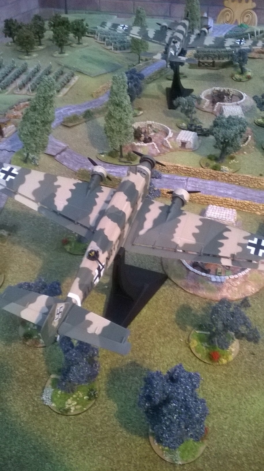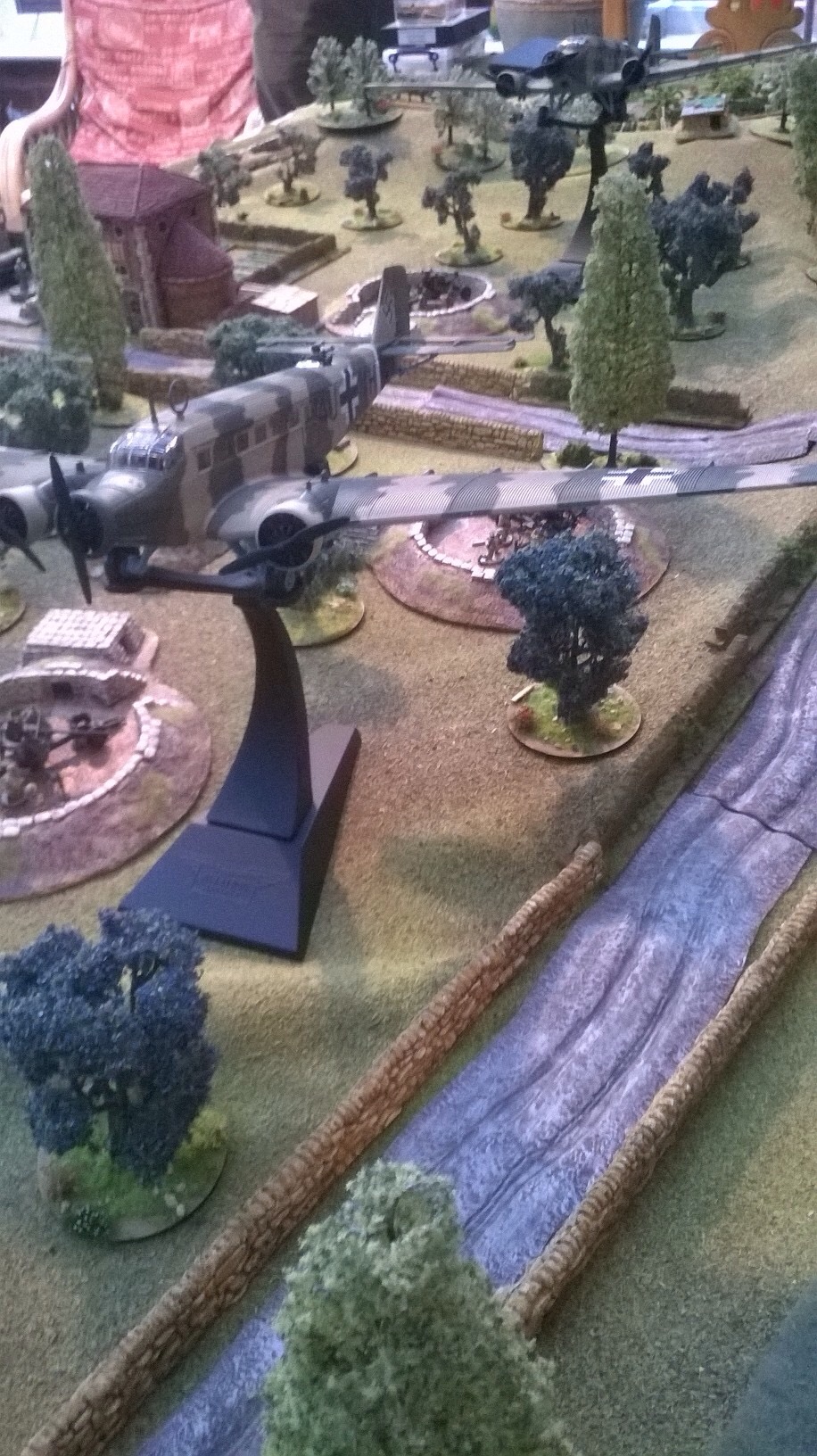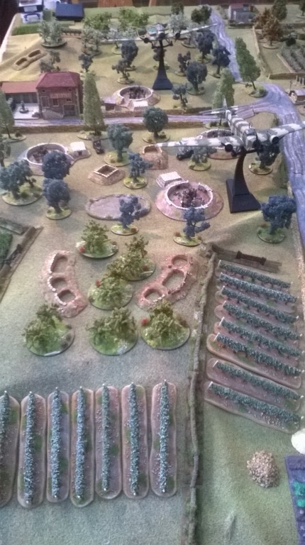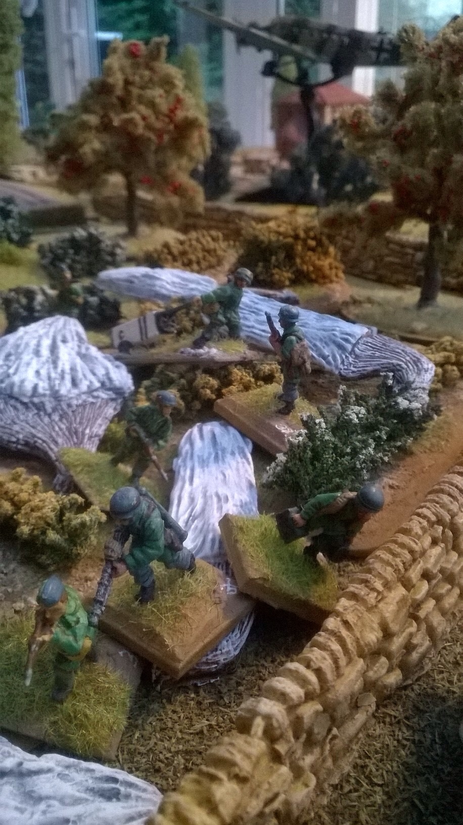 I chose the Fallshirmjager and elected to take a flight path along a low ridge that I calculated would save me from the Bofors below. My first section made a perfect descent and then took up position to cover the entrance to the ravine. My platoon headquarters were made of sterner stuff and landed almost right on the entrenched Tommmies at the road junction. Unfastentening belt buckles and finding the drop canisters wasn’t easy with rapid fire from the trenches.  With support from the first section in the orchard, we had a foothold. Third section vaulted the stone wall and charged Mikes dazed and battered defenders. We called it today or rather the night at this point. The battle was still in the balance even after two hours and the chip break that Mike insisted on.