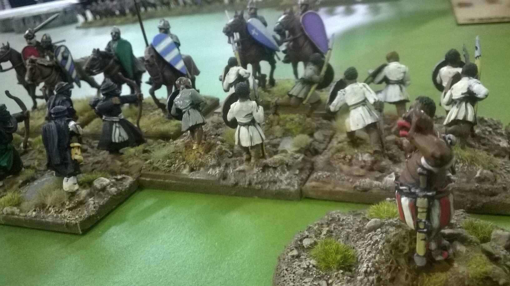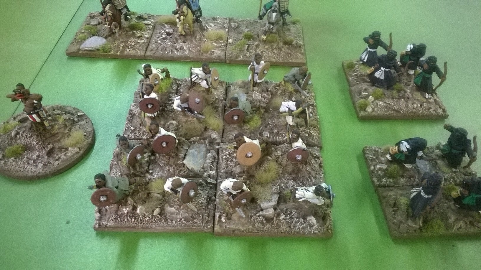 The charge caught my archers in the open but floundered against my African spears. Valuable time was gained by the stout defence of this wing. My right had advanced to within bow range of Steves second elite corps of cavalry but Steve wasn’t going to order another such charge. The elite of his army redeployed to the centre.