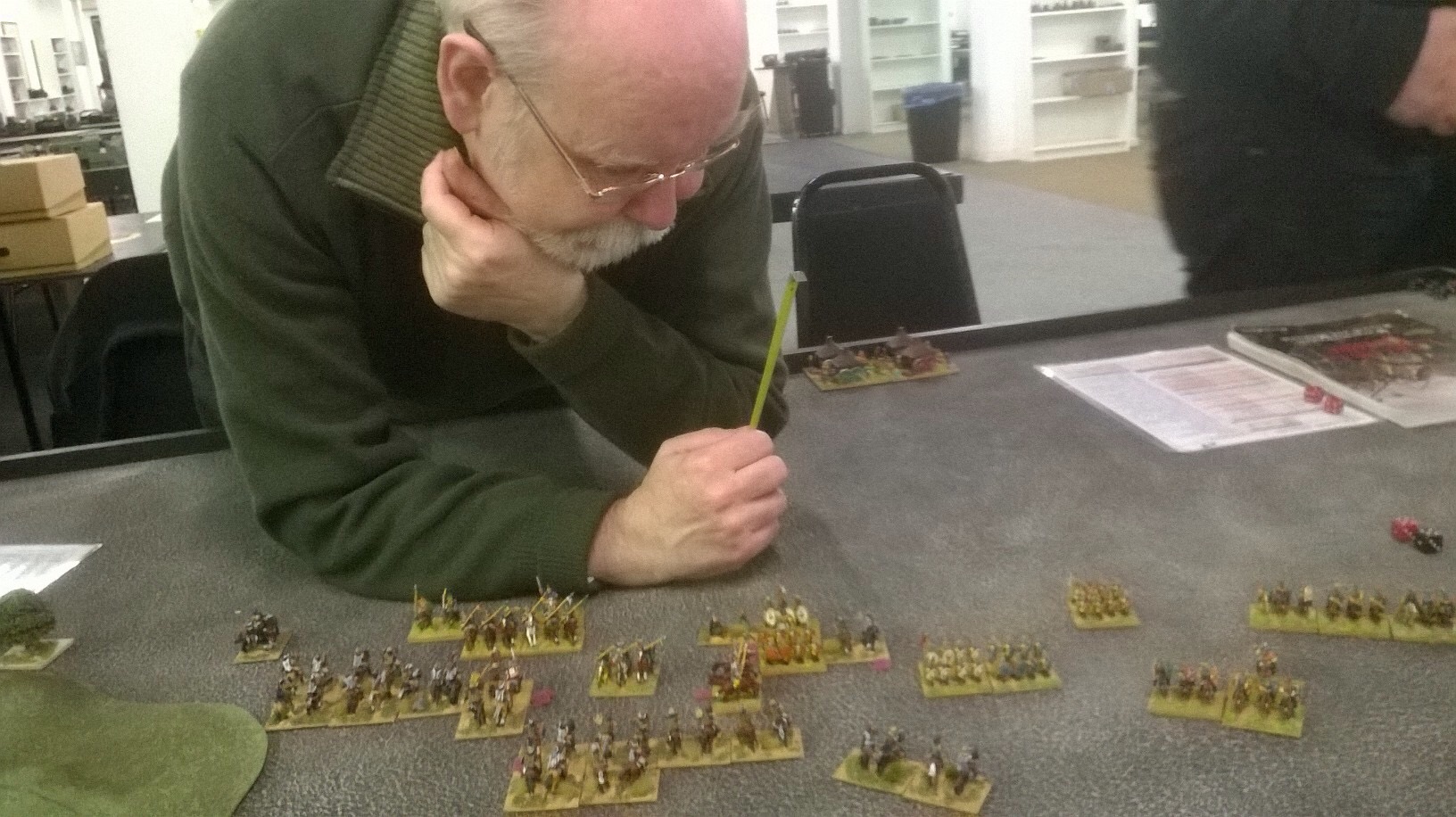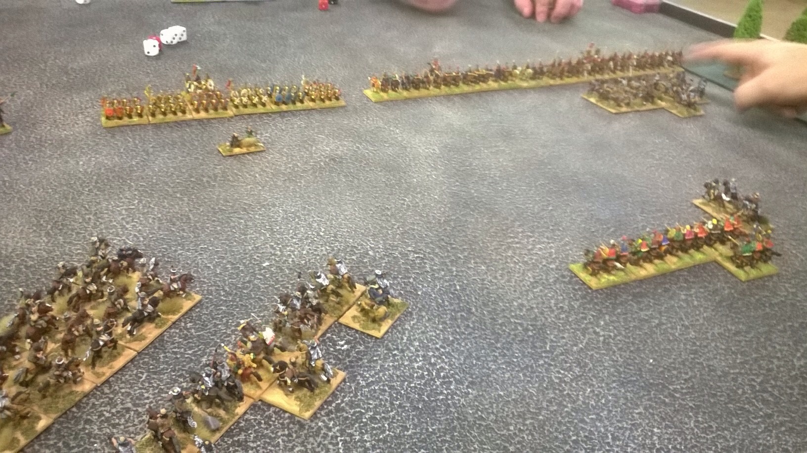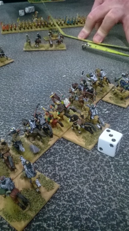 The light cavalry nearly broke the Roman centre. The archery from our Huns nearly broke the Alans. Mike Lane tried the “drop the six on the model tree” trick, followed by the “slide the dice over the back of your hand sideswipe”. Is anything beneath this old veteran? But wait a minute, who is this by our camp?