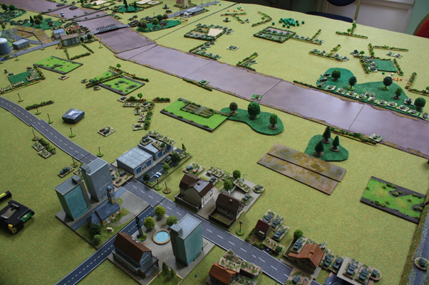 And so the battle progressed. The Soviets on the canal table continued to pound the Canadians in the ferry village with just about all the artillery they could muster, but dug in infantry in a Built Up Area (BUA) are really tough cookies. So whilst further Soviet infantry assaults were thrown in, again and again, the plucky Canadians held firm. Elsewhere, Soviet T72’s and T64 MBTs had hit the NATO hidden minefields but as their mine-roller tanks started to clear a path through, they were falling foul of more NATO 105mm AT rounds from hidden Leopard 1A3 MBTs dug-in at optimum range.