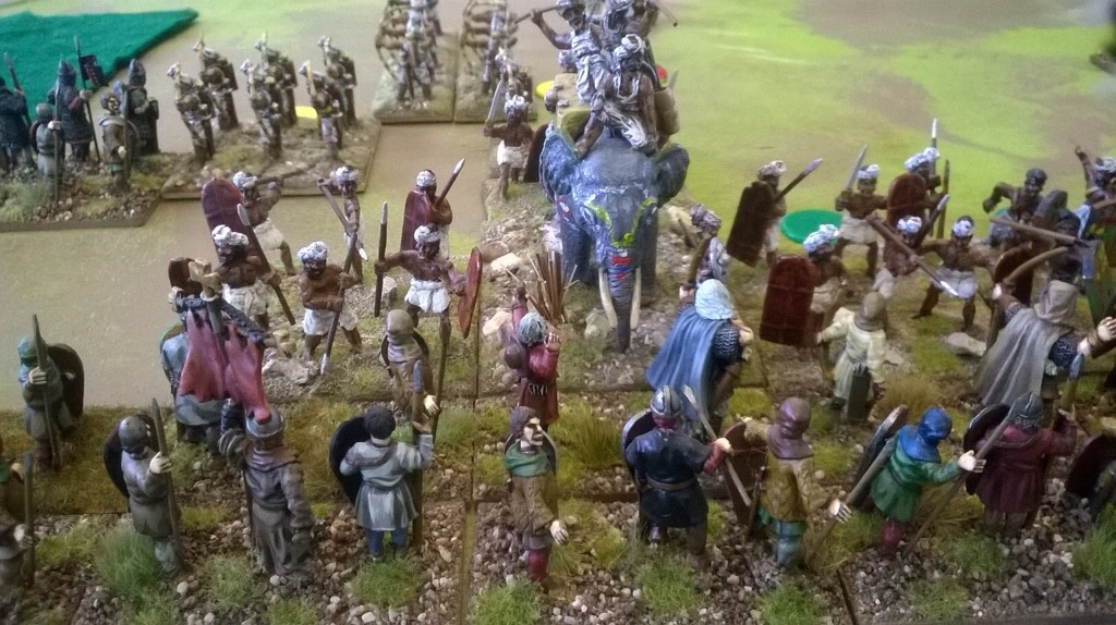 “Look what kebab boy has done! He thinks he has a longer line but he’s dependent on his right wing medium swordsmen standing up to the elephants in the scrub where elephants are not penalised”