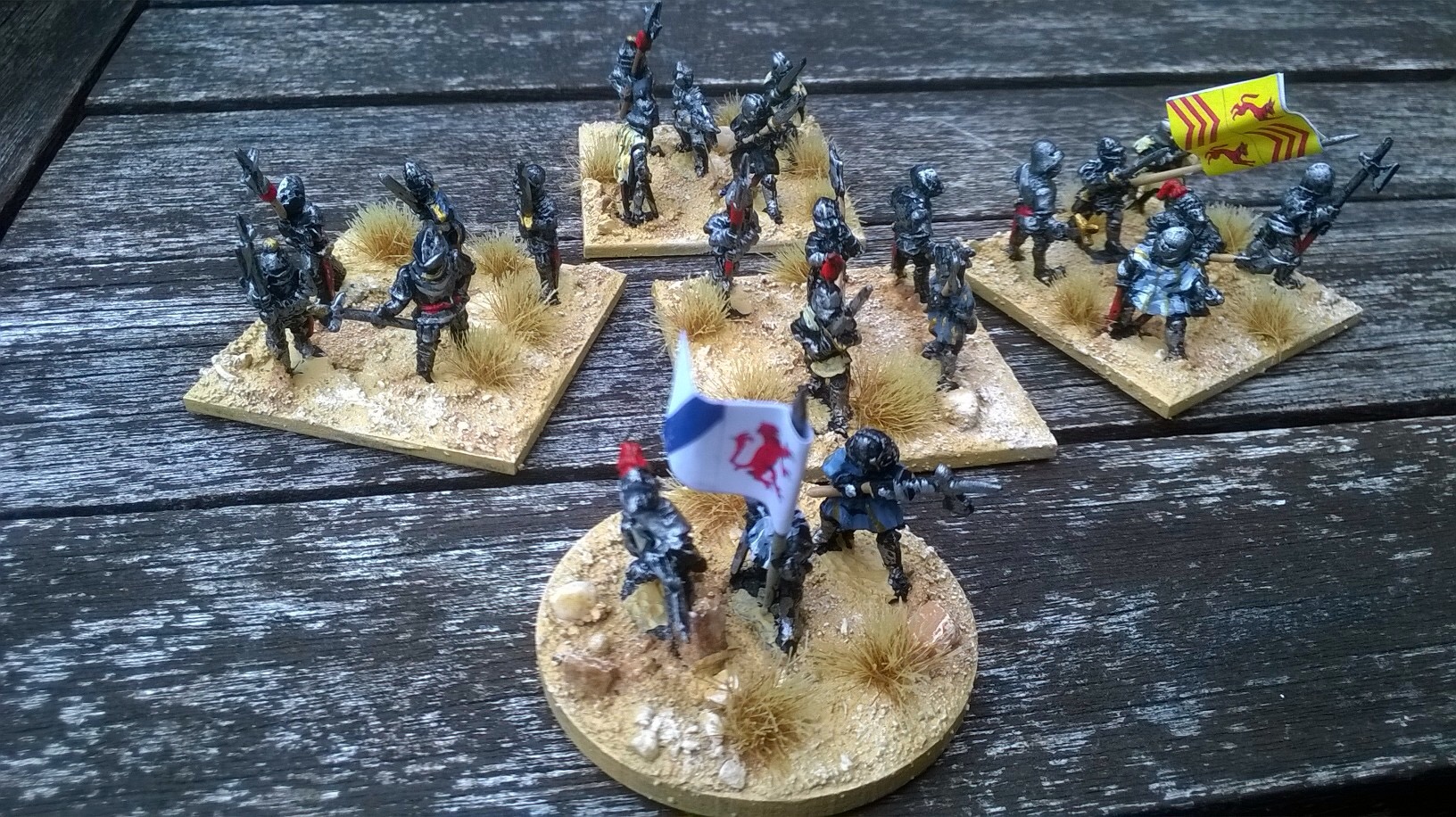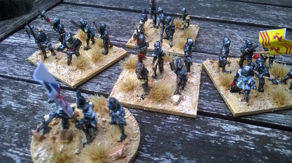 The next lot to get painted are from the Donnington New Era range. Damion got me to draw some initial sketches for this range s o I admit I’m a little biased. But, the figures are gems. They are as close to Xyston as you are likely to get. 18mm high and stocky. All these had weapons attached but I’m not looking forward to attaching the spears and lances to the next batch. Great minis and available singly. I’ve painted these as Gascons for the Hundred Years’ War. These beggars are two years late for Godendag 2015! Thanks for reading, 40k, Fall of Rome and Black Powder American Civil War so keep in touch.