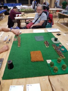 Game 2 – Republican Romans (Phil Mackie) – a winning draw to me – a good game but we both agreed we needed to pick up the pace of play for 100pts and remember that Strategist generals add +3 (not +1) to command rolls. As whilst we had inflicted reasonable casualties – I lost all my cavalry and Phil lost all his Velites – had the game gone on just one more turn I think the outcome could have been decisive (either way but probably in Phil’s favour). As always, Phil is a thoroughly pleasant opponent.