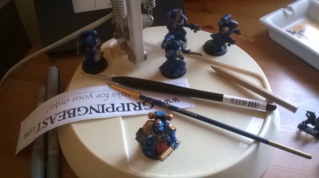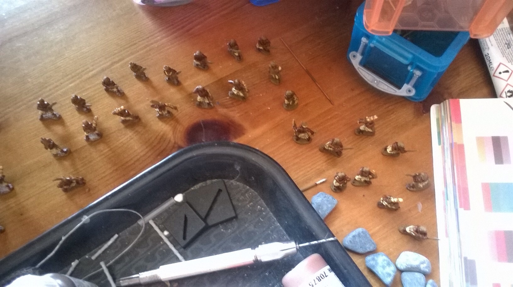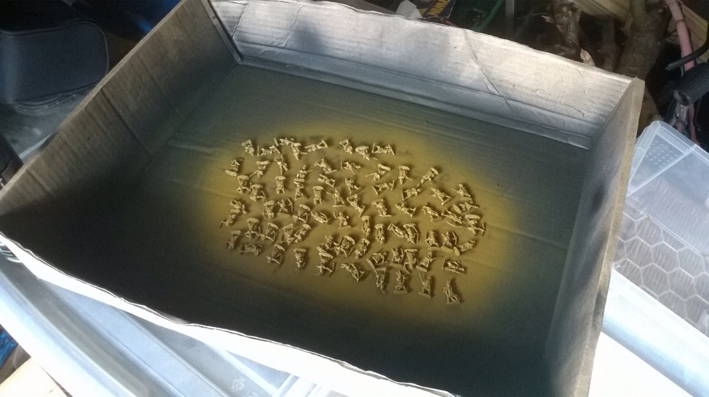 Day three, with a brush look for any bits the aerosol missed. The closest I got was Vallejho English uniform. Games Workshop chesnut ink was then washed over the whole lot….