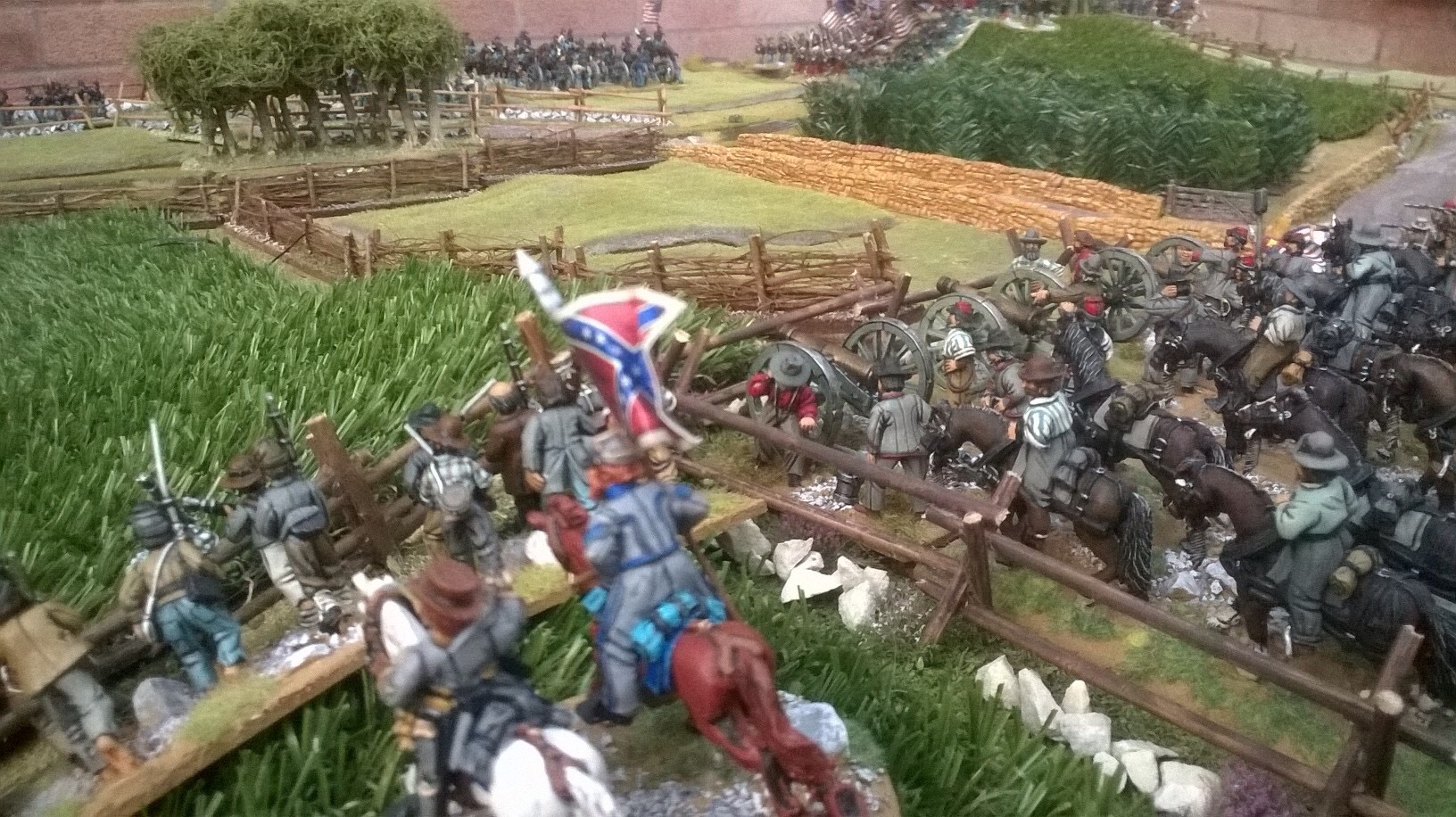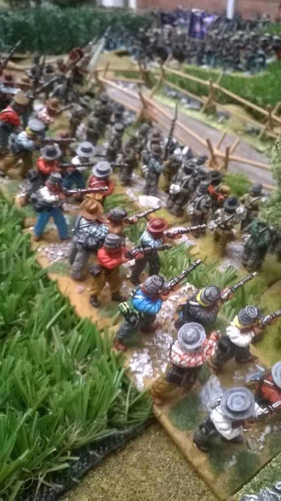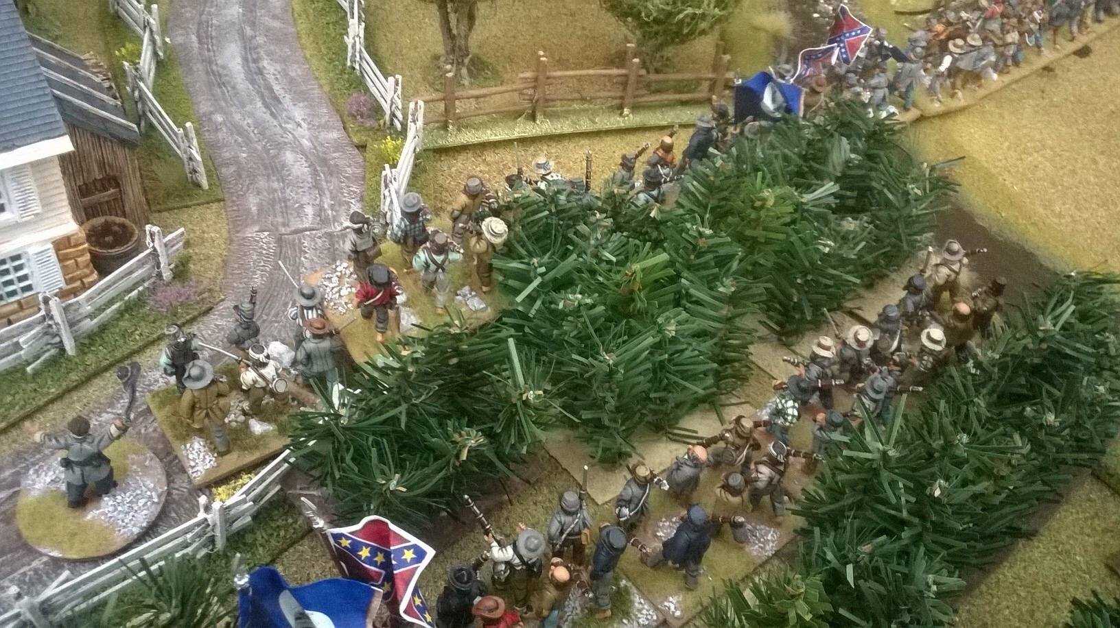 Sheltered from view by the left hand hill, my other column made rapid progress. Admittedly it was hard for the Rebs to defend when my rifles out ranged the defenders smoothbore muskets and my artillery concentrated on the breastwork rather than counter-battery Fire.