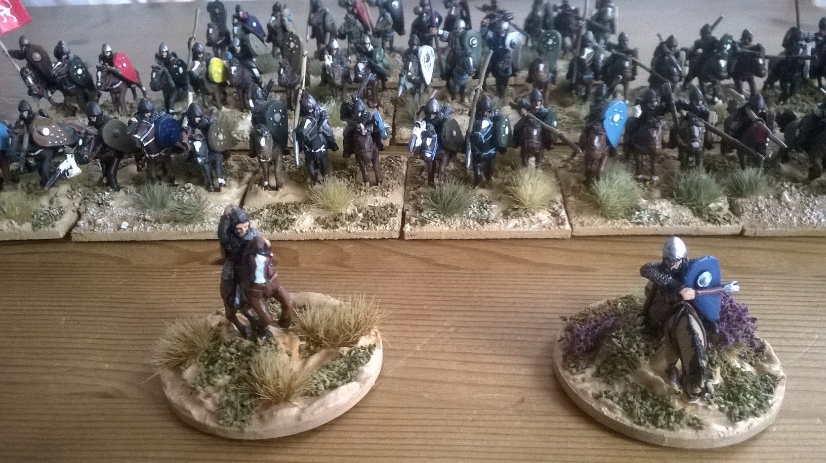 The Old Glory minis are well animated and characterful. Unfortunately they are pre- shield transfer and the shields were a task. Steve Porter once thought me “tight’ for not wanting to waste paint. I usually have the next batch of minis on the painting table and any excess paint goes on the next in line. In this case I had too much red and that became the Norman shields. Big mistake, all my others are in the authentic Tapestry colours( including the “odd” green horse. The two ranges seem to mix well. The others and Duke William are below;