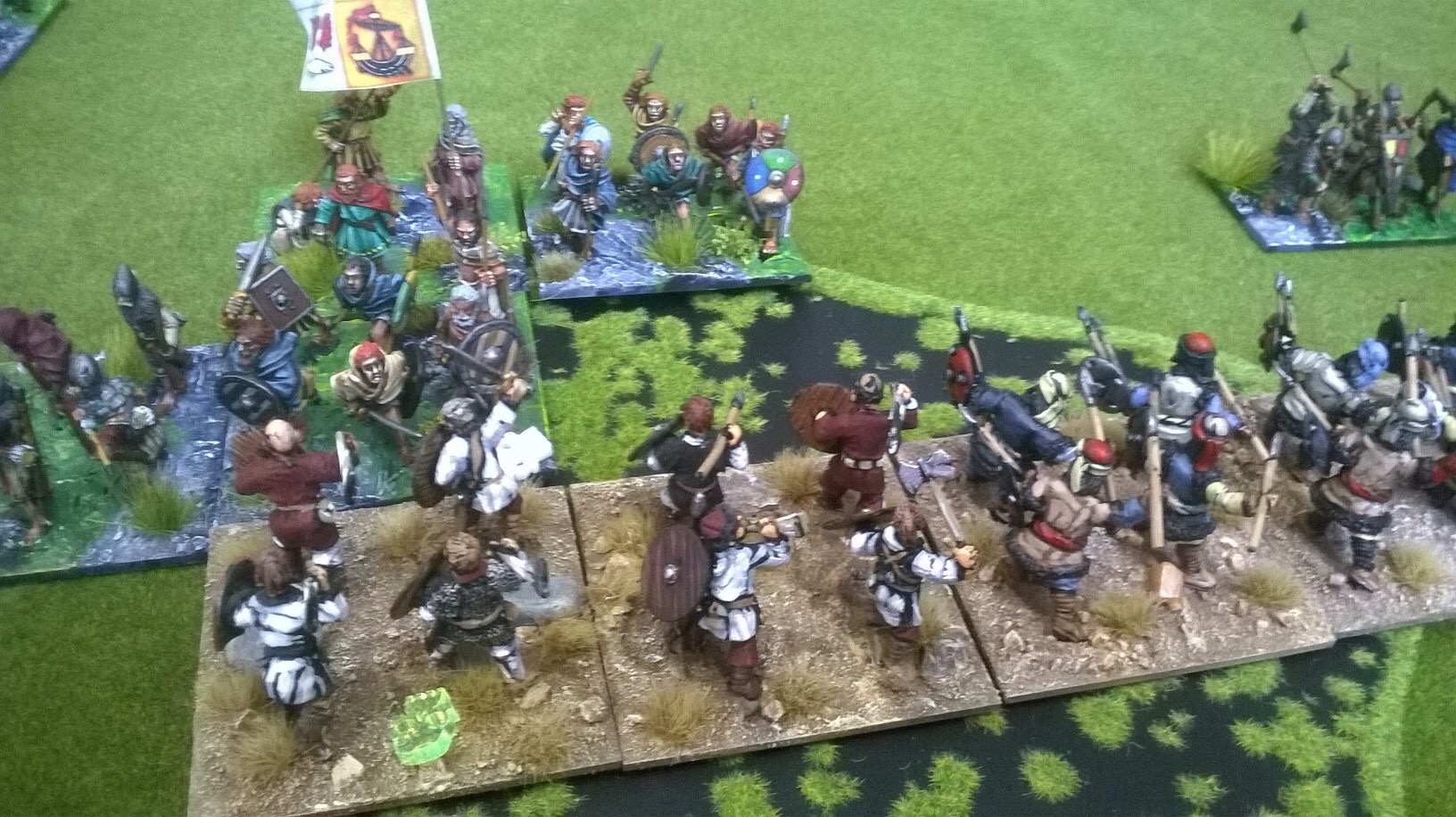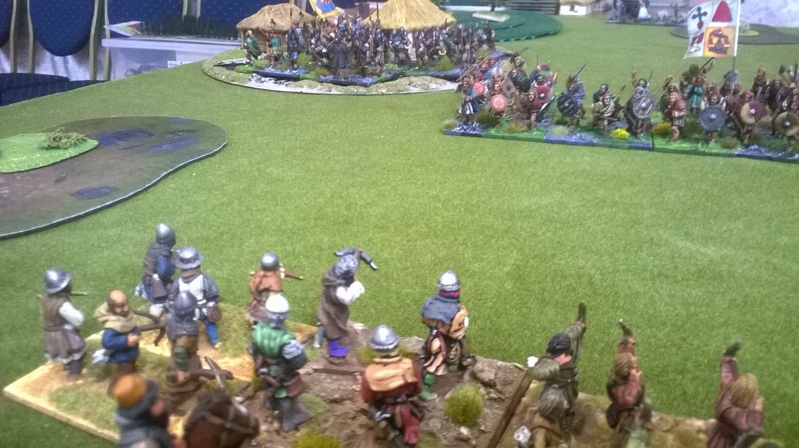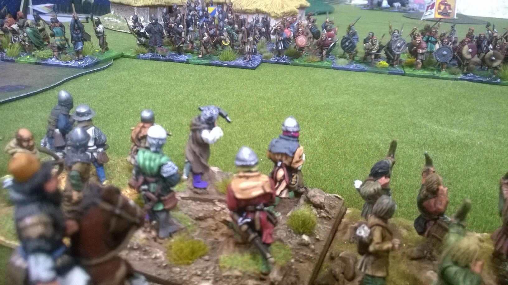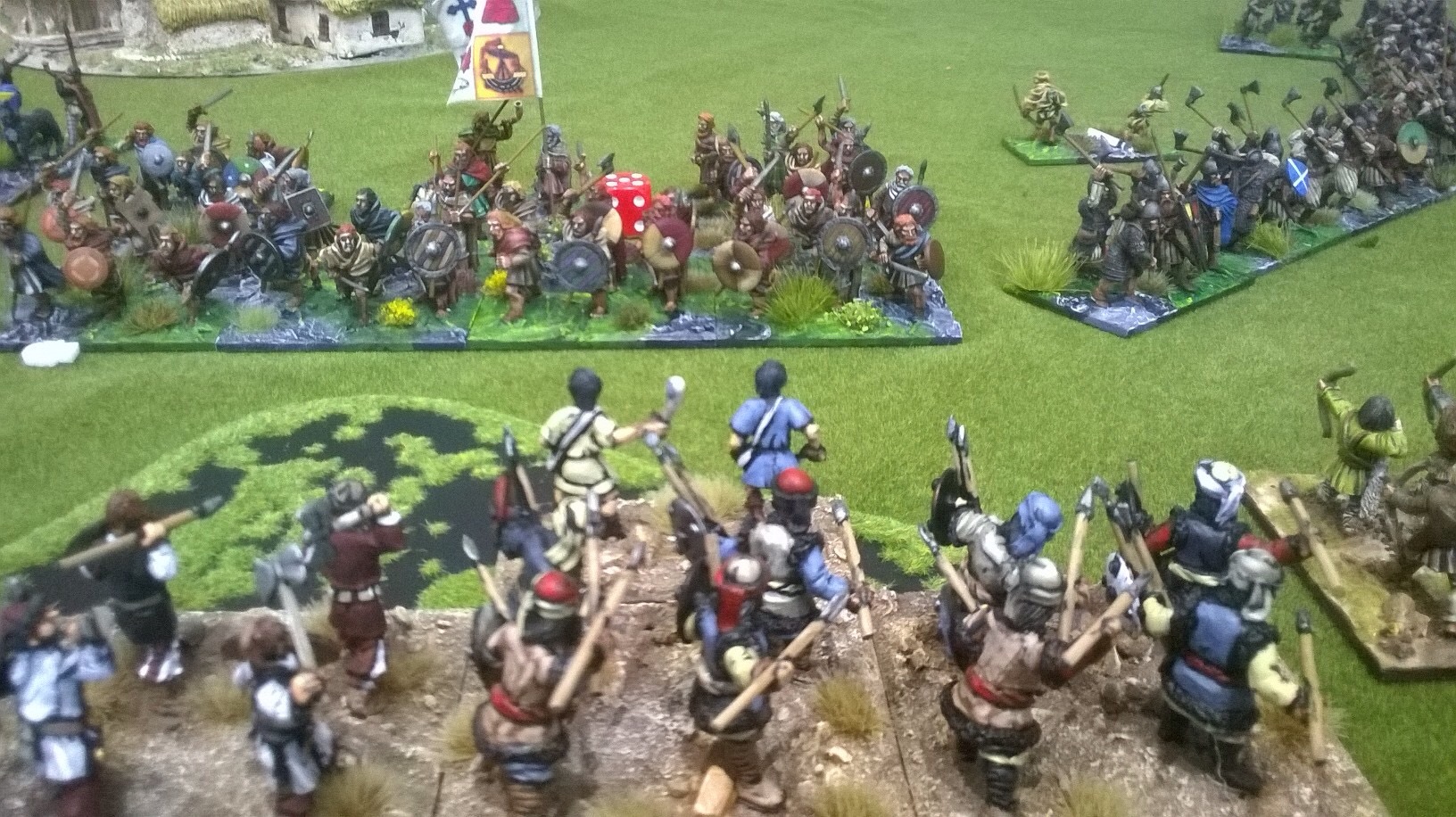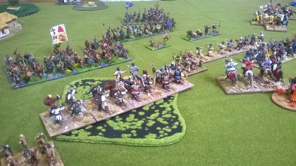 My longbowmen let loose a few shots and then retreated behind the spearmen in the marsh. They were hastened on their way by a few Highland archers ( a nasty surprise to the unwary)