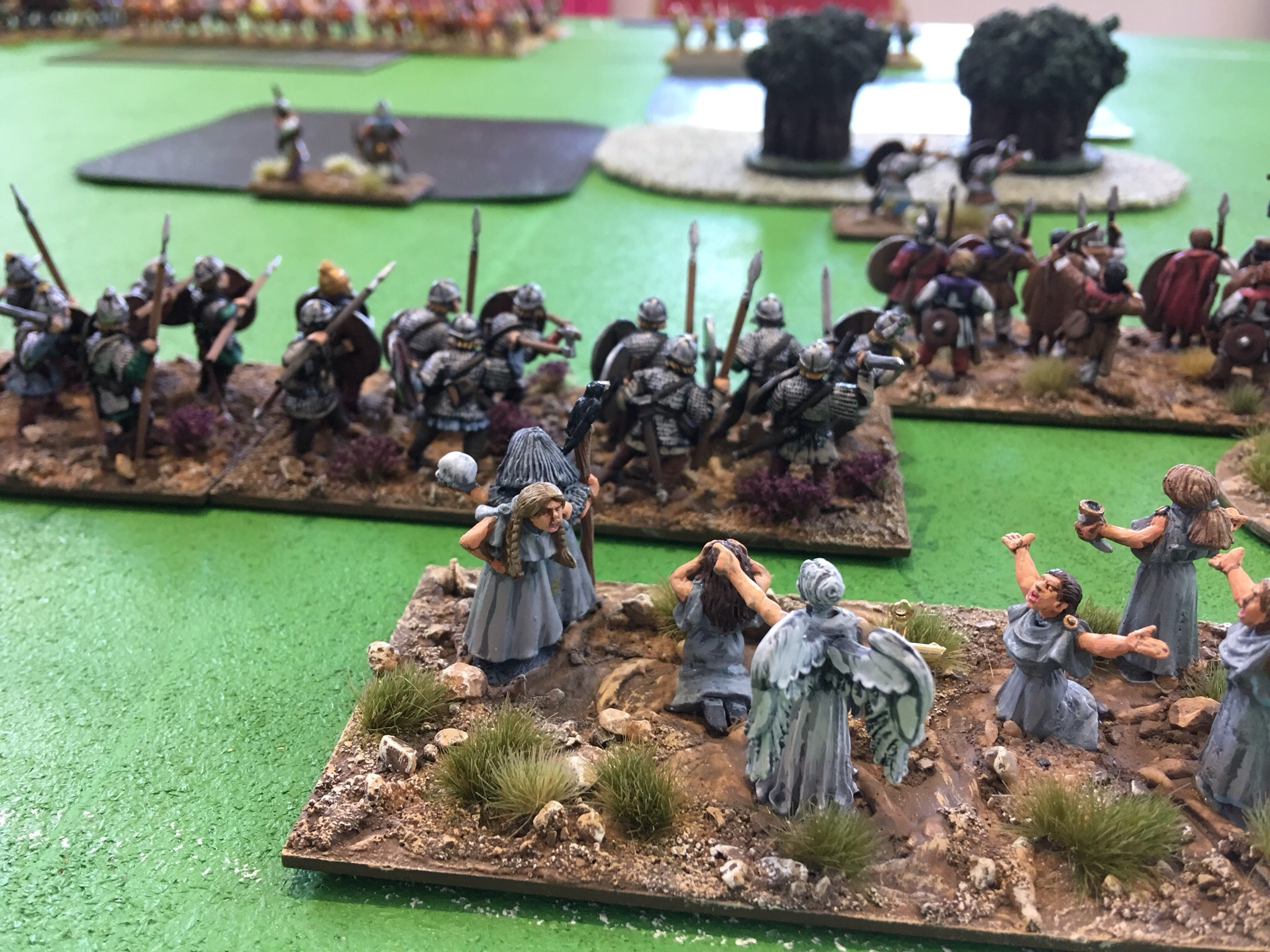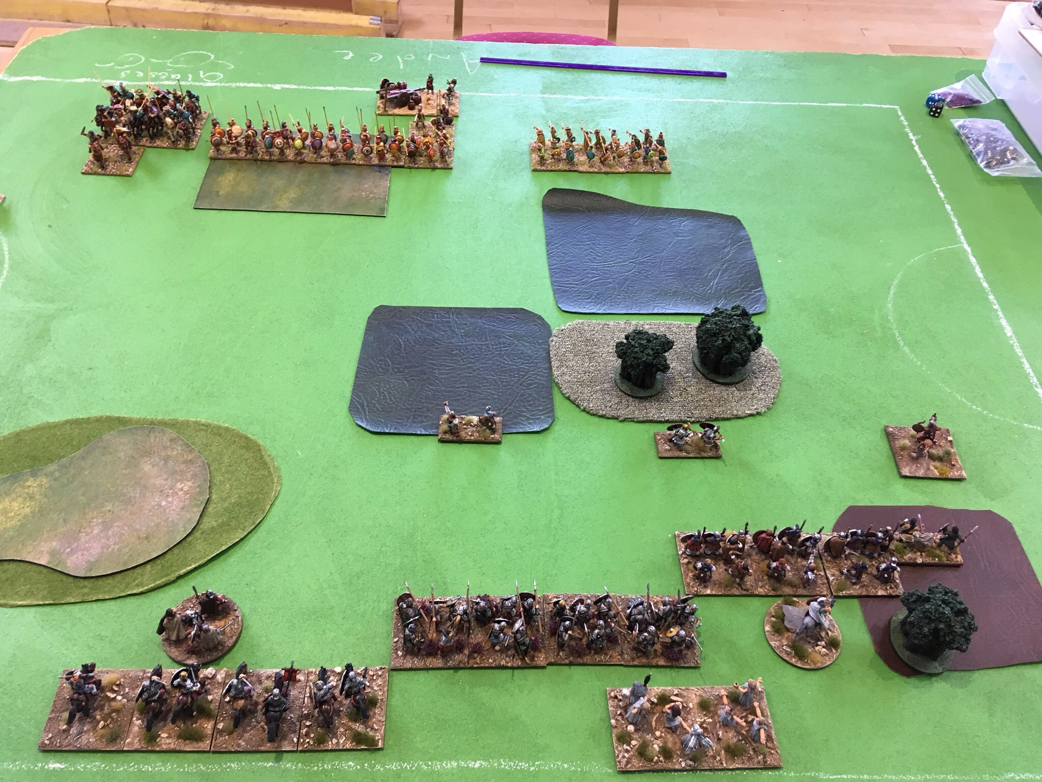 The first game was against the Elfin Unwin’s Lydians. Andy poured a whole corps worth of javelin units into the forest whilst his companions swept round on my left. As his spears moved forward in the centre, I attempted to slow him with my light infantry.