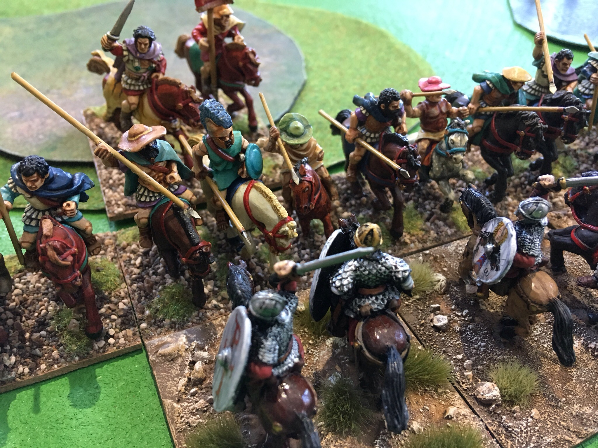 The Roman command dice held and our respective cavalry wings made a feeble demonstration against each other. A draw with the Patrician losing fewer than the Greeks. But then, Fry……….