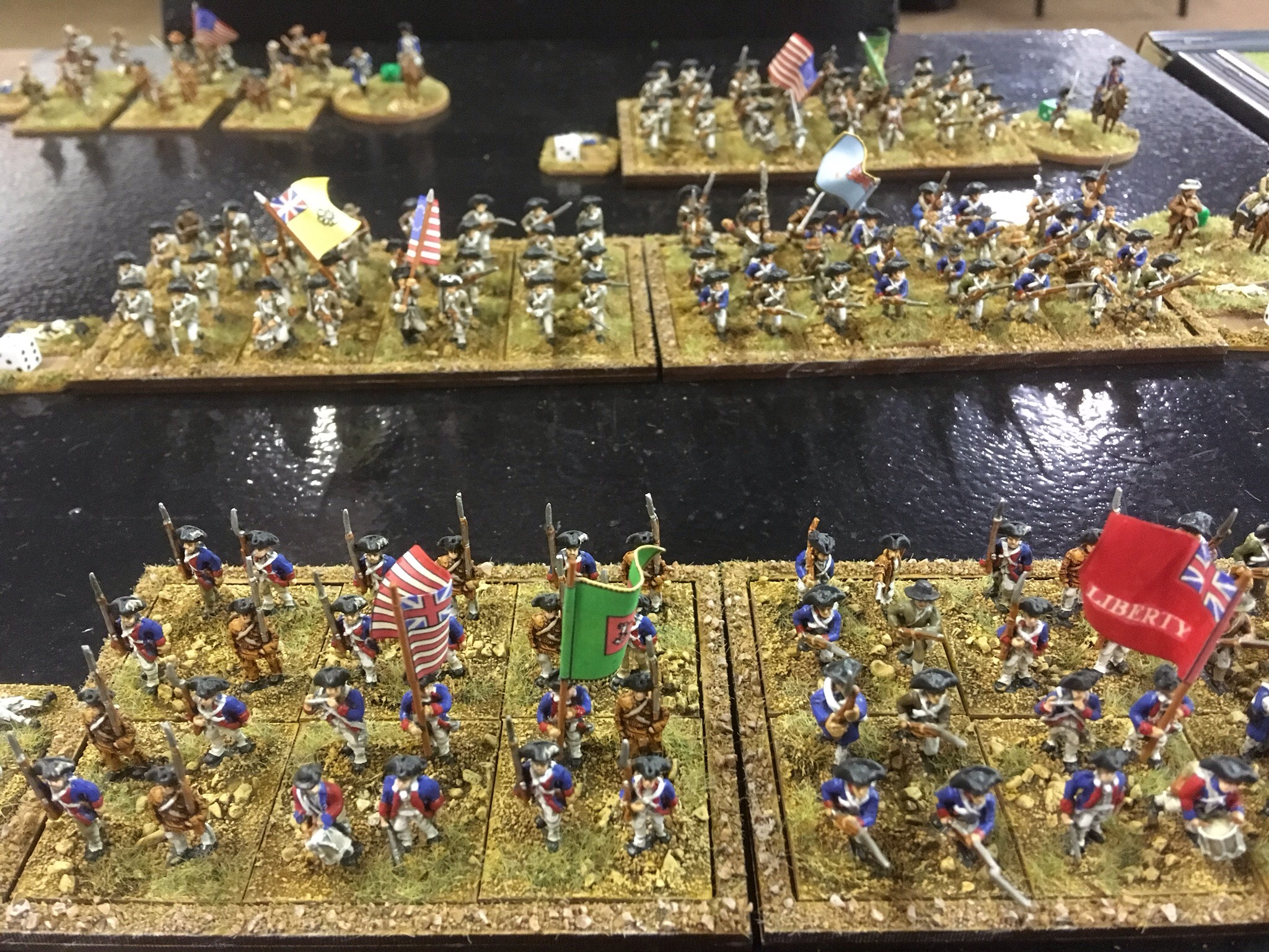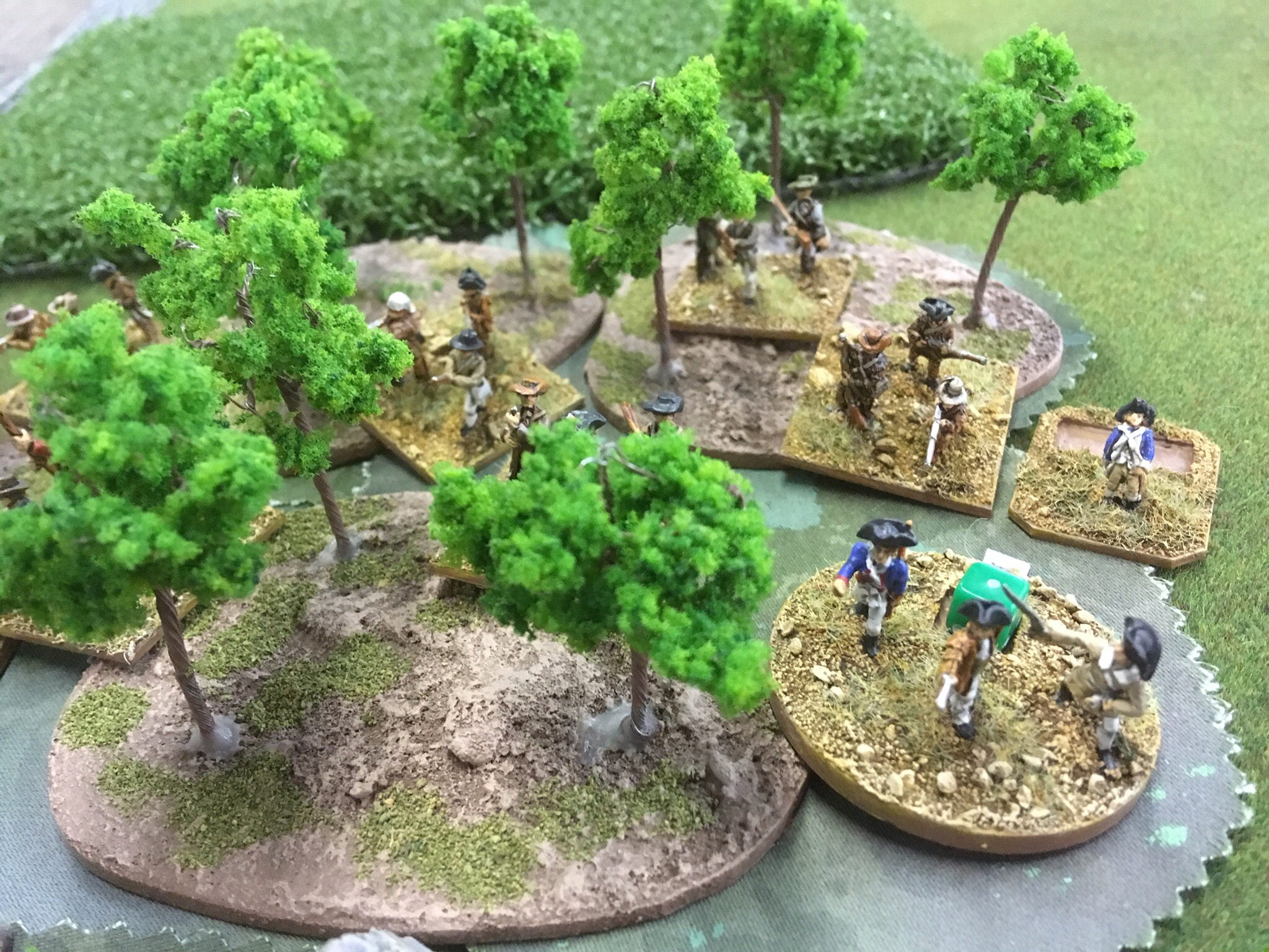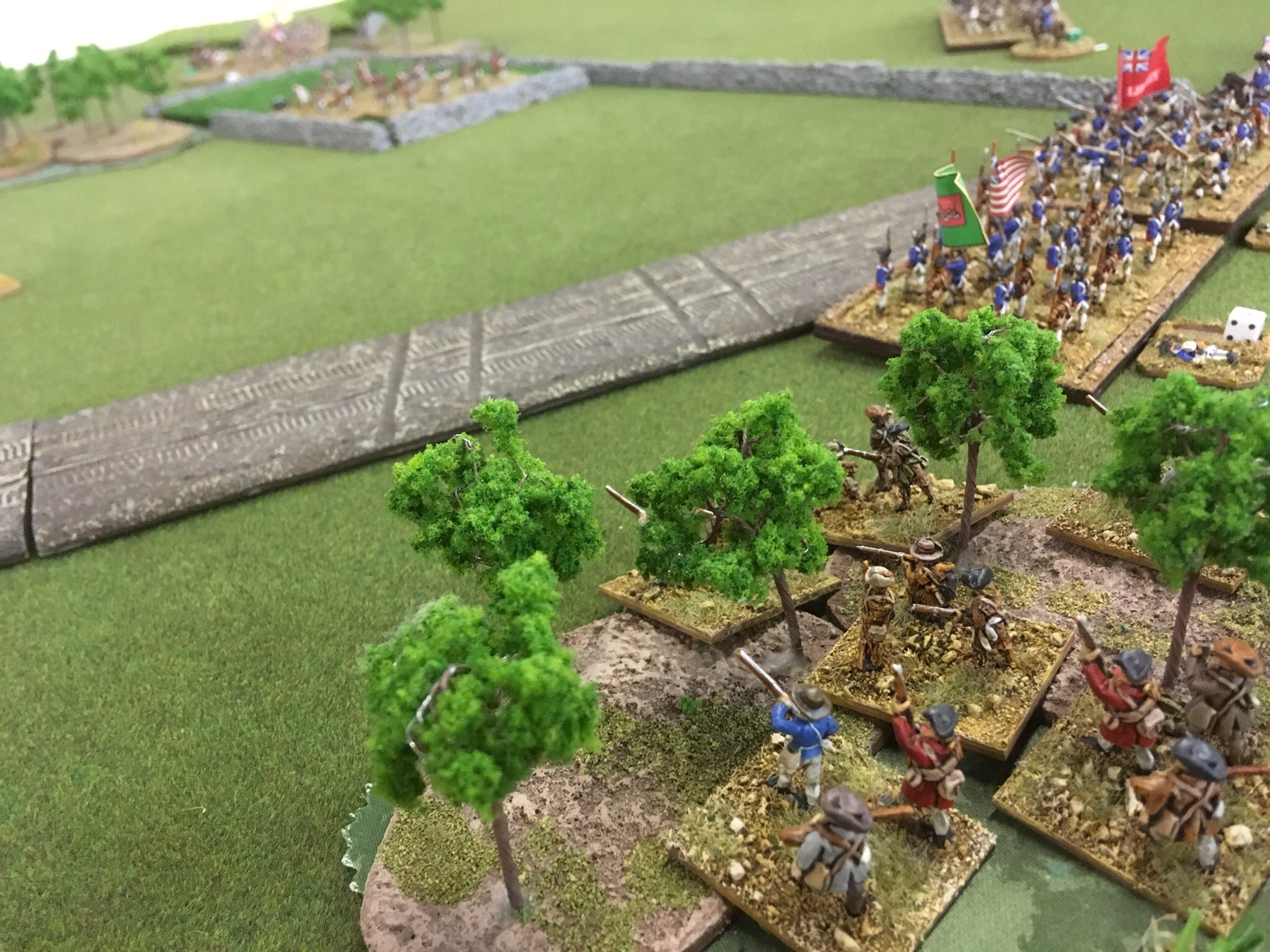 Turn one saw the Colonist militia skirmishers take to the central woods, whilst my own Light infantry skirmishers prowled the hayfield to my left. We used 15mm miniatures on multiple bases in place of the more usual 28mm miniatures. I must say, after seeing Steve’s collection, I was much impressed. The American infantry, militia and Continentals were next on and already in a battle line by the close of the turn- appropriately brought to a close by the Tiffin card.