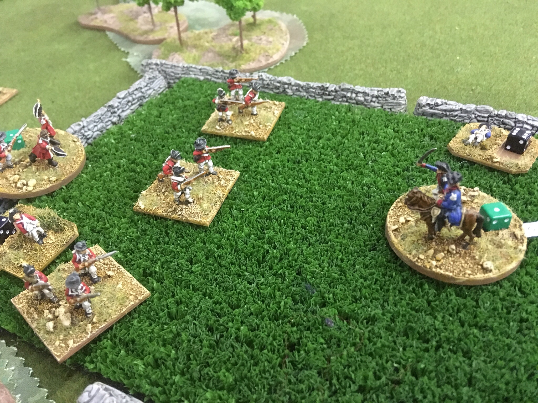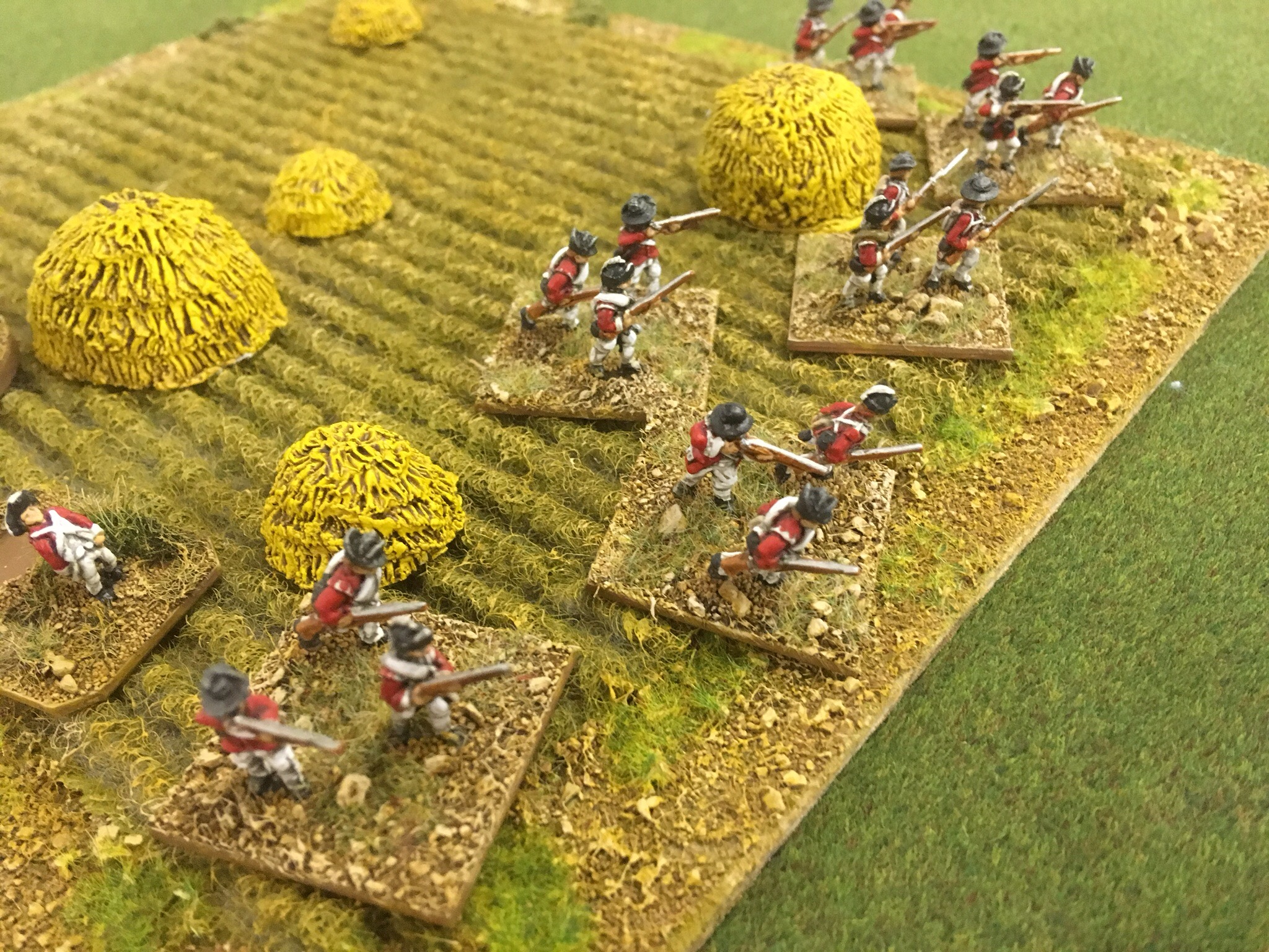 The British Light Infantry skirmishers made for the central sheepfold and the close formation Light infantrymen lined up amongst the corn stalks. British fire was quite telling but that may have been my mistake. Instead of taking the bayonets of my elite infantry into the militia before them, I chose a long range firefight. And, the sneaky Americans were already exerting a telling fire on the less numerous redcoats.