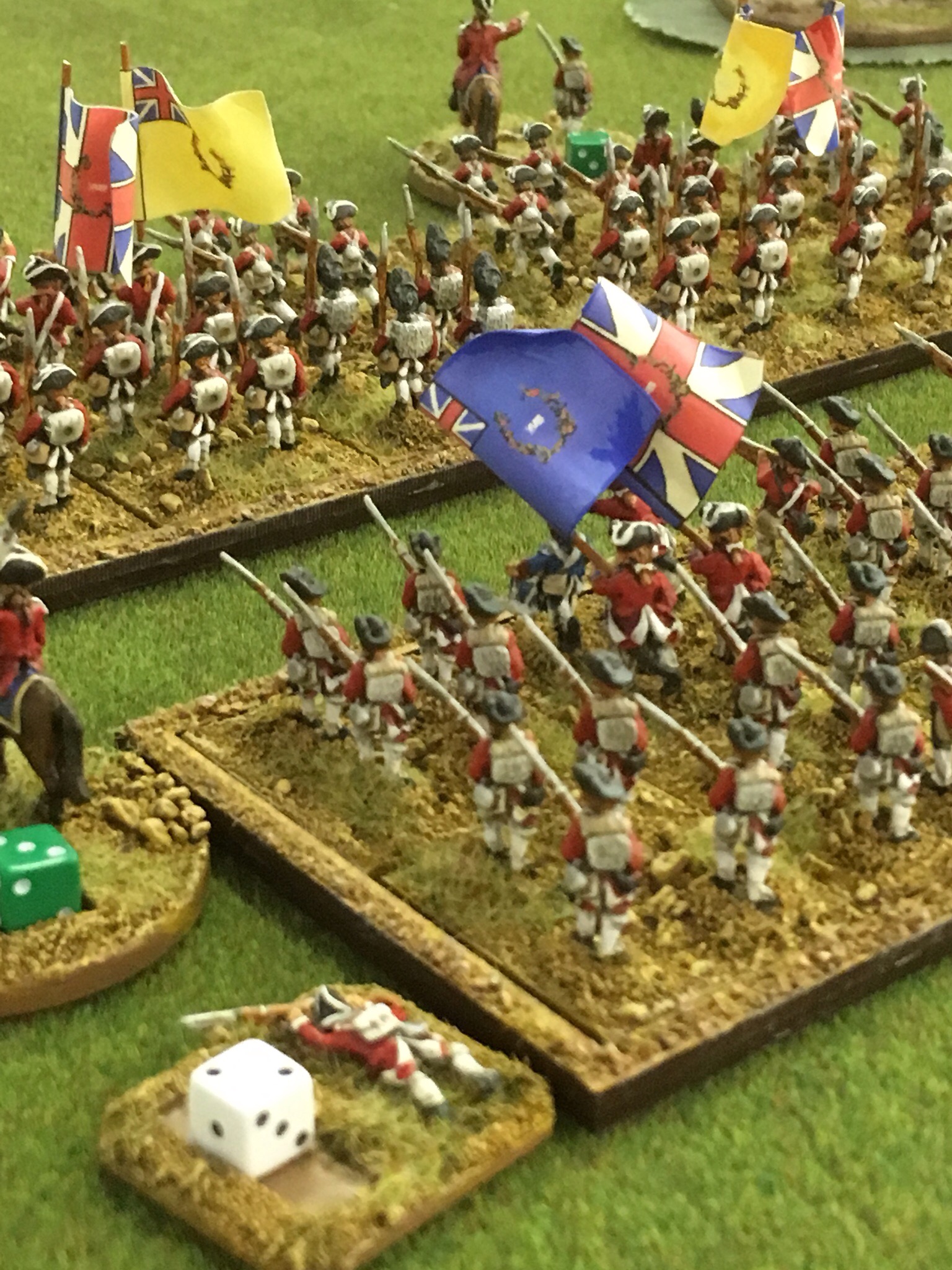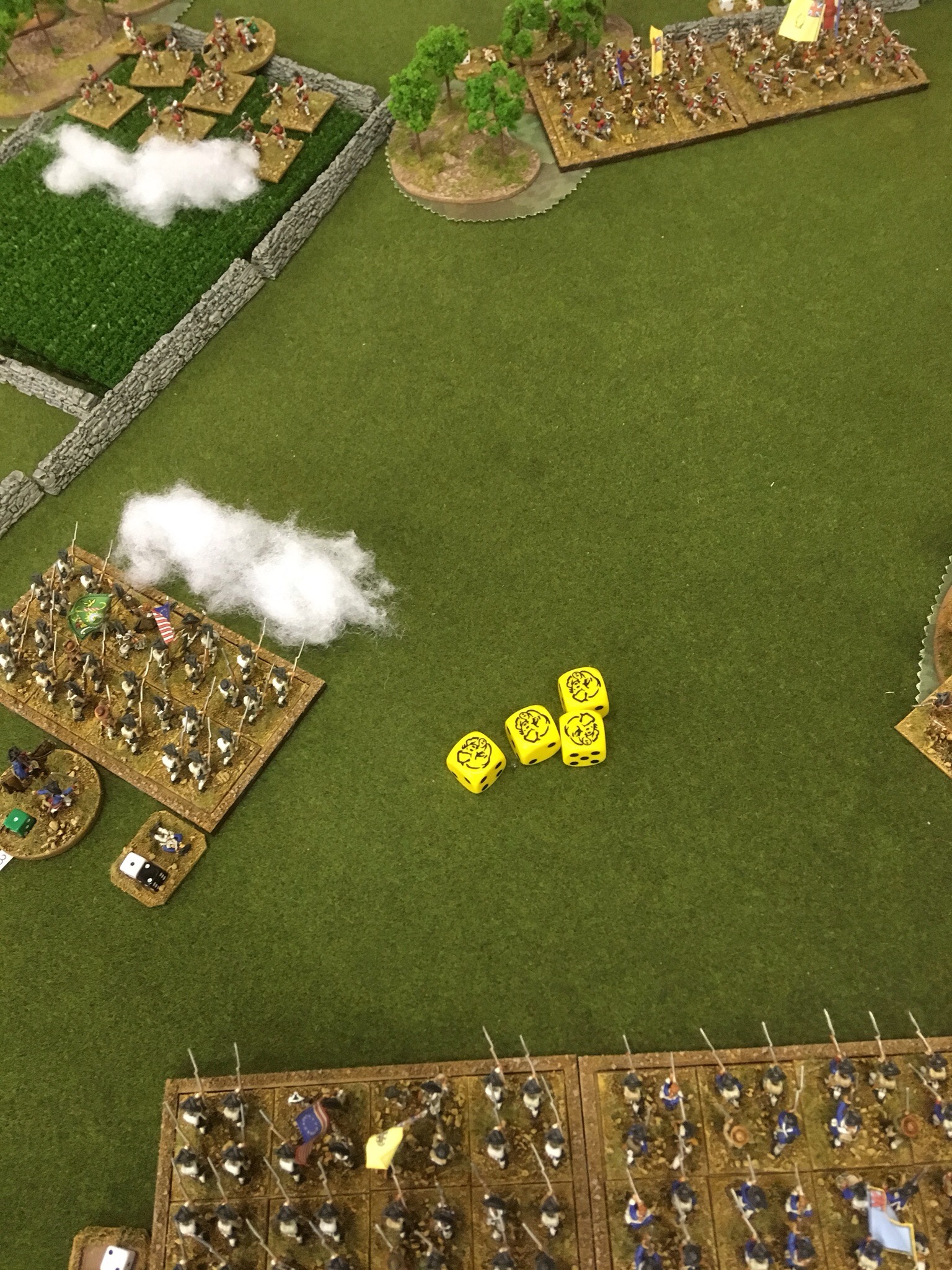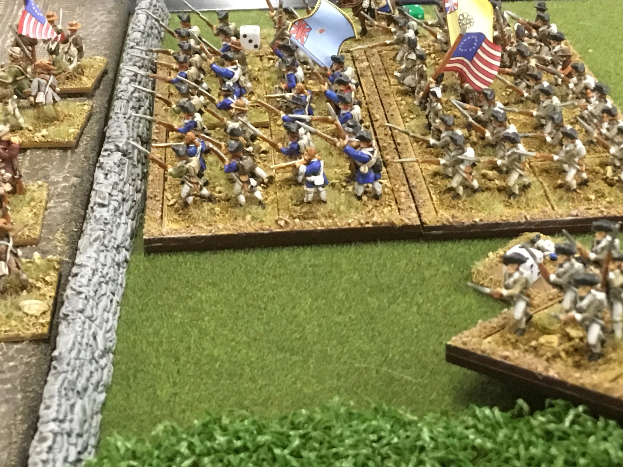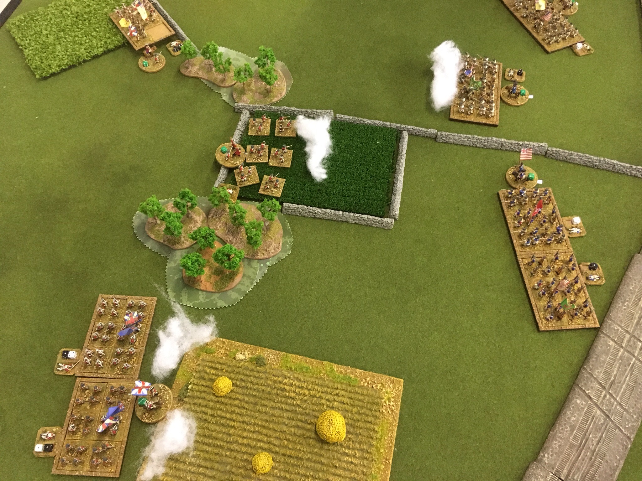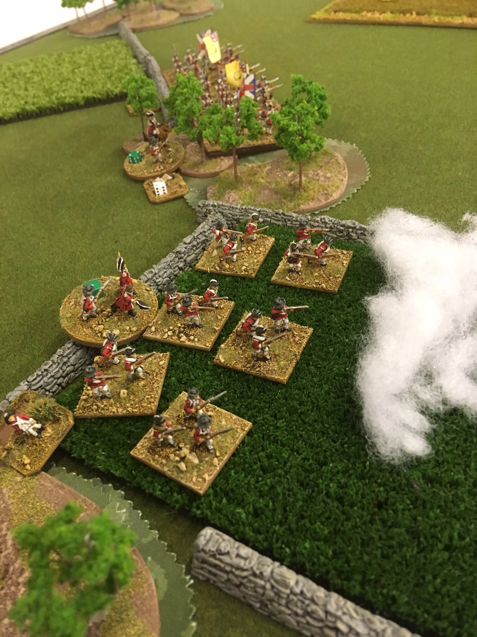 It was Major May who blundered. Stung by more skirmishers on the British left, the 10th line went over the boundary wall and into a hail of lead. Steve had stored his “flag card” and let go such a barrage of shot that the companies of the 10th were sent reeling.