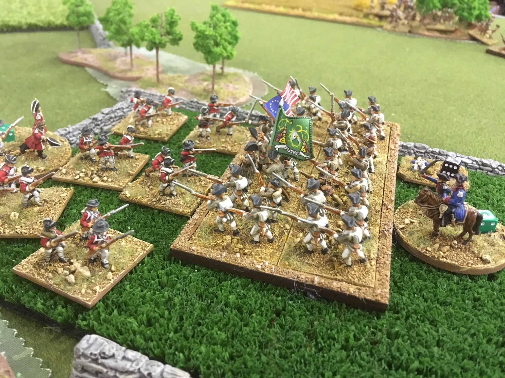 The British were now definately now forced on to the defensive. My two flag cards allowed me to hold the colonials at bay with disciplined musketry. The ability of ” sharp practice” is an important addition to any British force in this system. Perhaps too late in the day, I advanced my Light Infantry formed companies to cause the militia companies to fall back. Steve was aware of the danger and stormed his Contintentals into the sheepfold held by my stalwart skirmishers. The results were unexpected…..