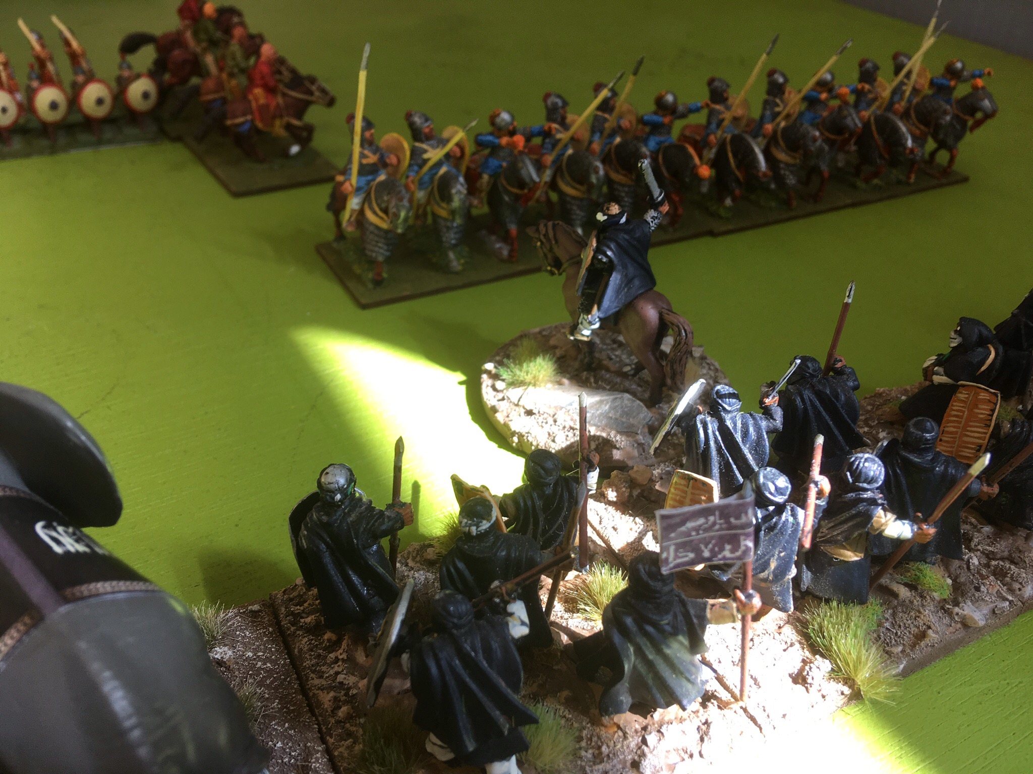Praise be! Abu Ubaidah ibn al Jarrah scares away the infidel heavy horse, whilst Khalid advances on the quivering cowards behind their pavises. The faithful could not be held back and the fighting spread all along the field. The “kettlemen”cataphracts martyred many but the ever – wise Khalid had sown confusion amongst the Infidel horsemen with his cleverly disguised camels.