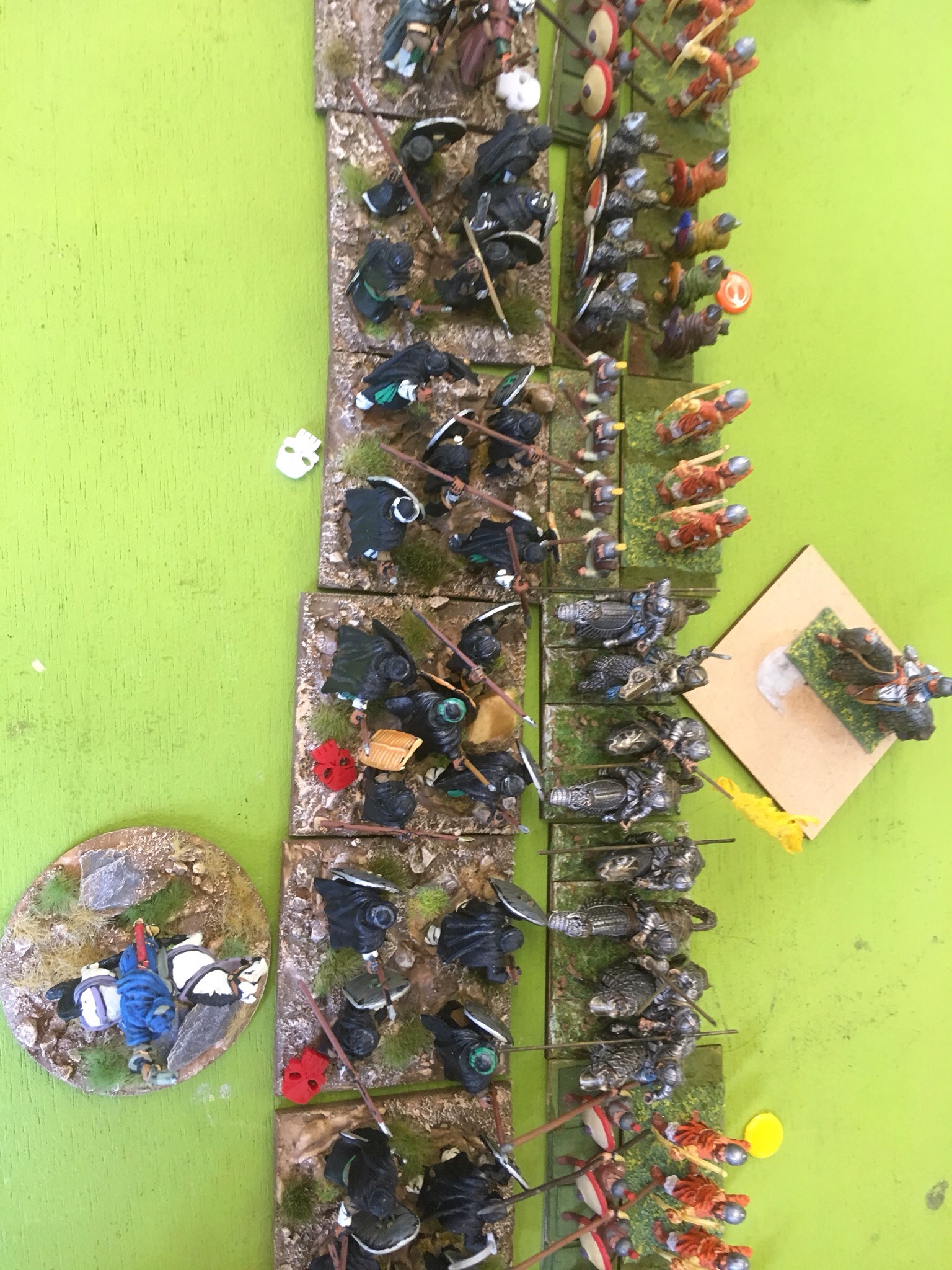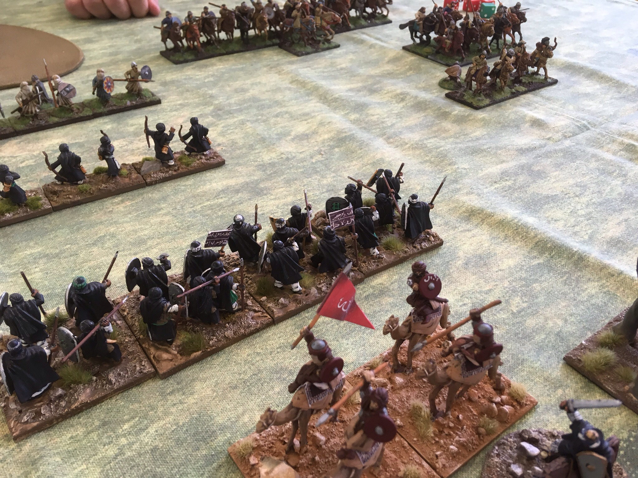 The army of choice for the weekend would appear to be Nikephorian Byzantines with its heady mix of quality foot and superb horse. Robin had brought quite a representative force, I always find near contemporary opponents more satisfactory. In later years, the Arab foot would adopt more defensive spear formations, but my impetuous troops could gain some time to decide on a plan by deploying well back.