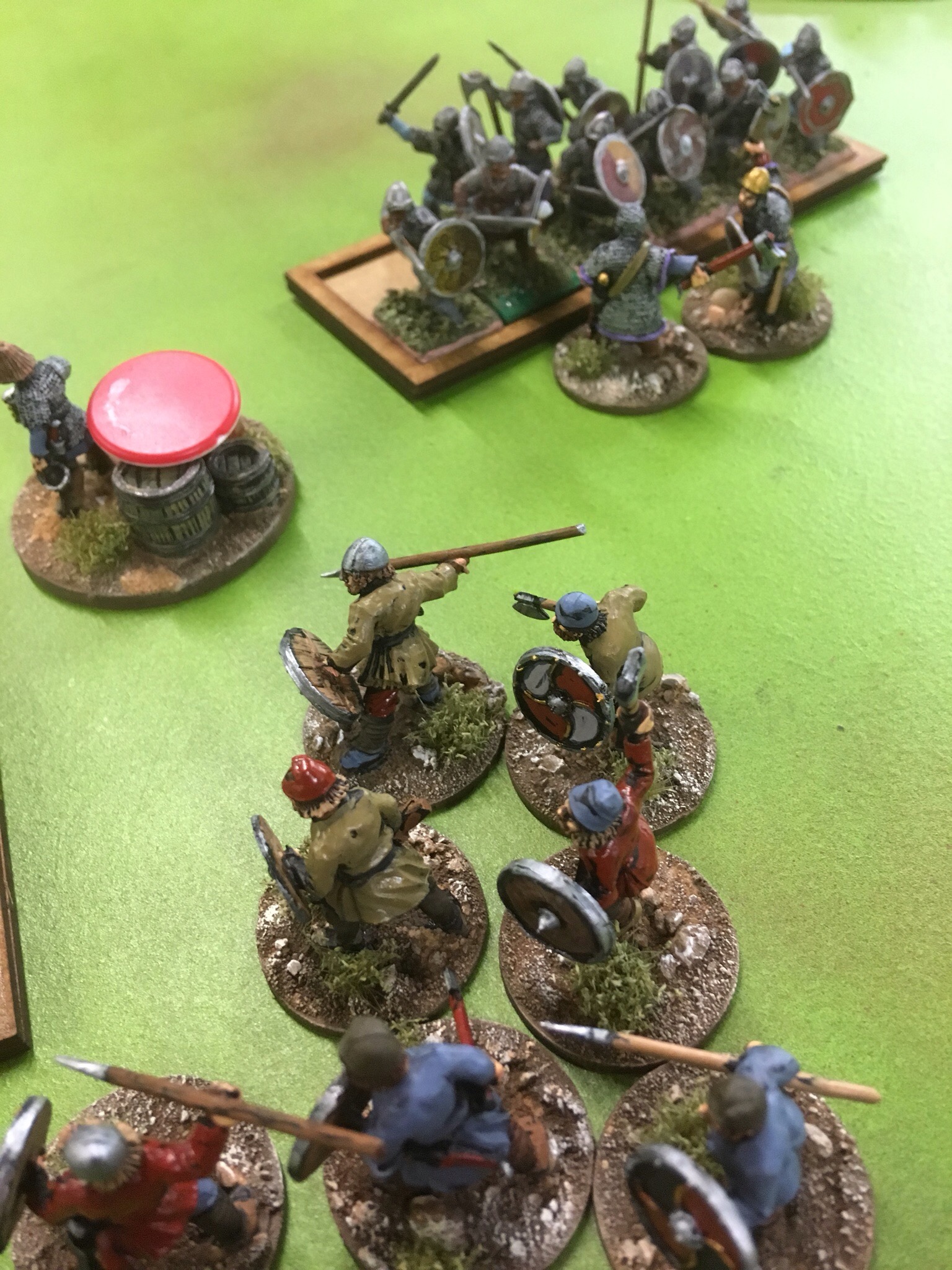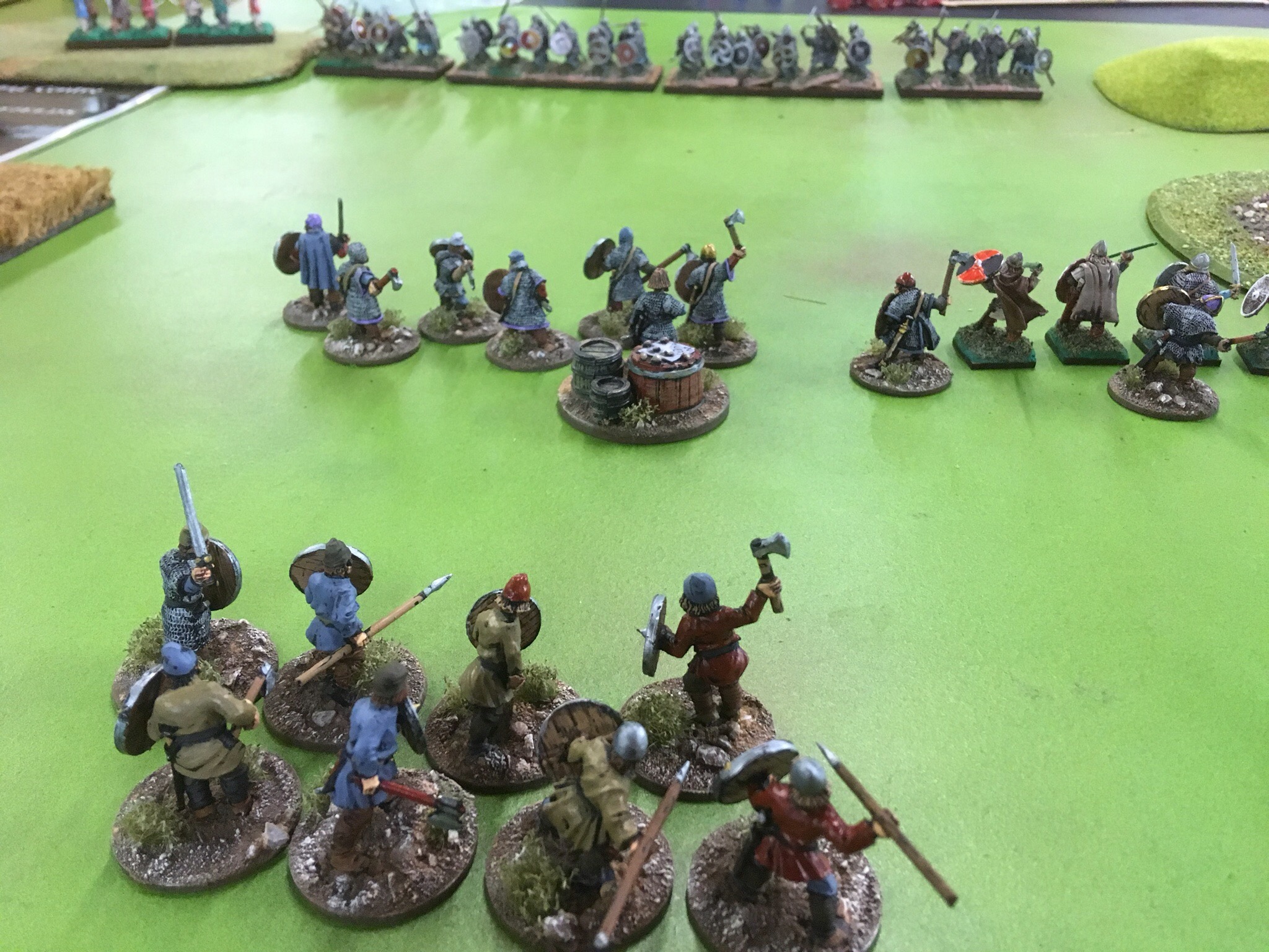 Then, Viking like, the commander who had sent so many of his own troops to their death, took back the move. His warriors came forward but then retired and looked to their flank. My Saxons had arrived behind them. Luckily, my taking the troops off the sabot, Chris’ Vikings were safe…out of range by a millimetre!