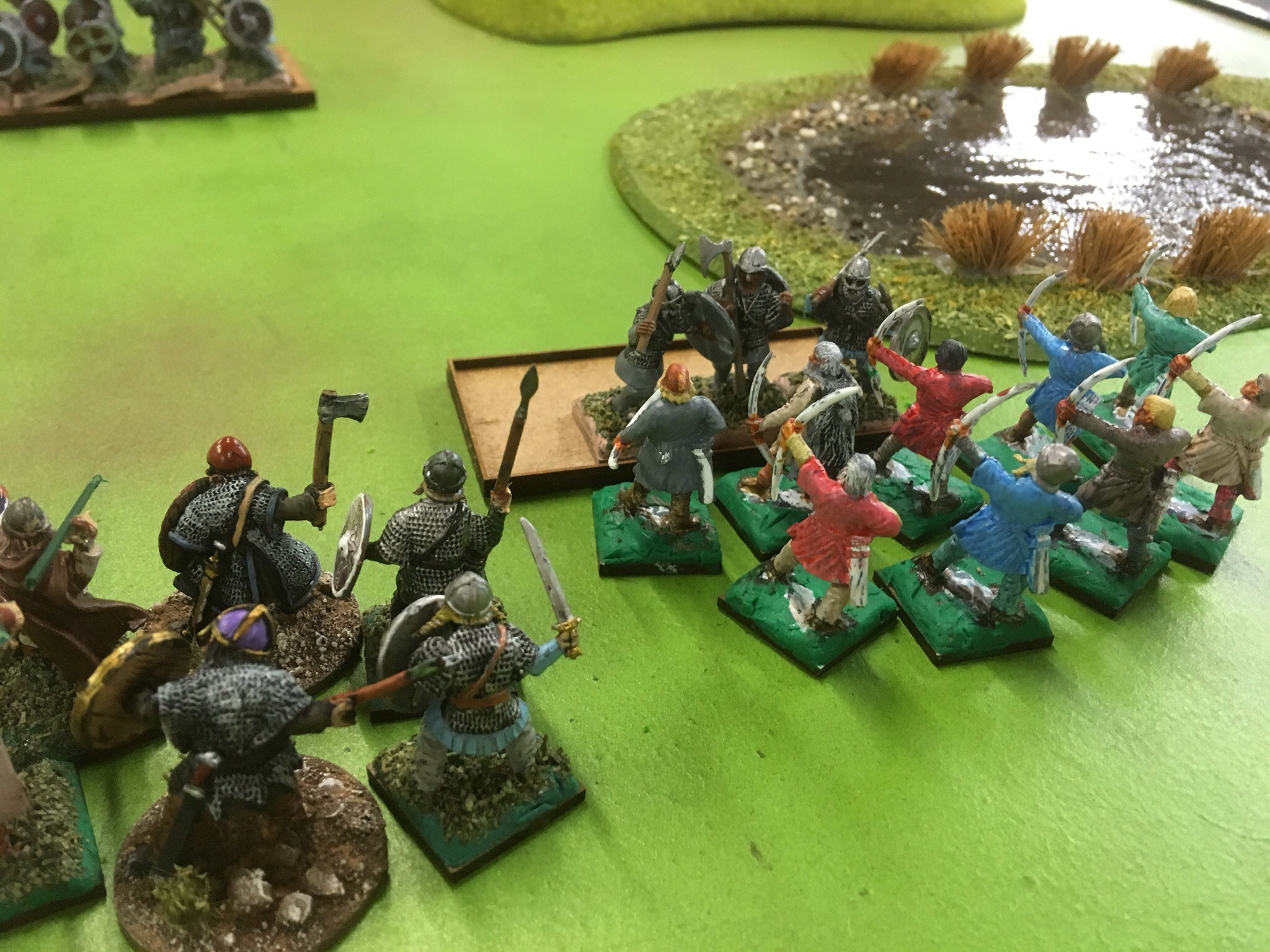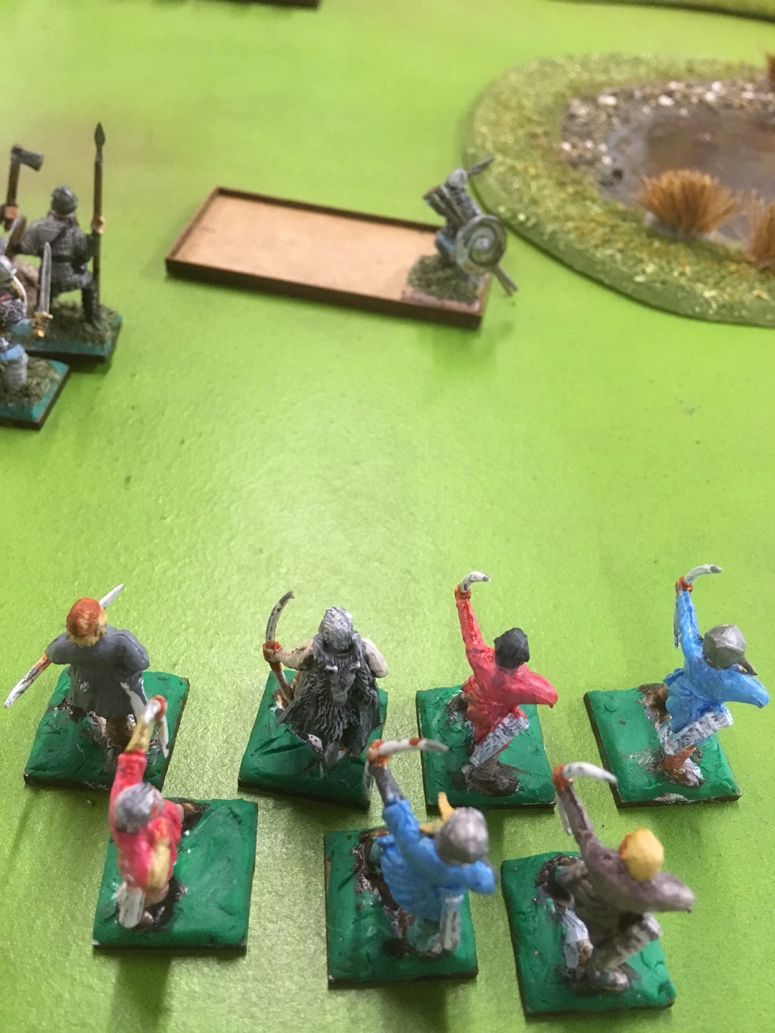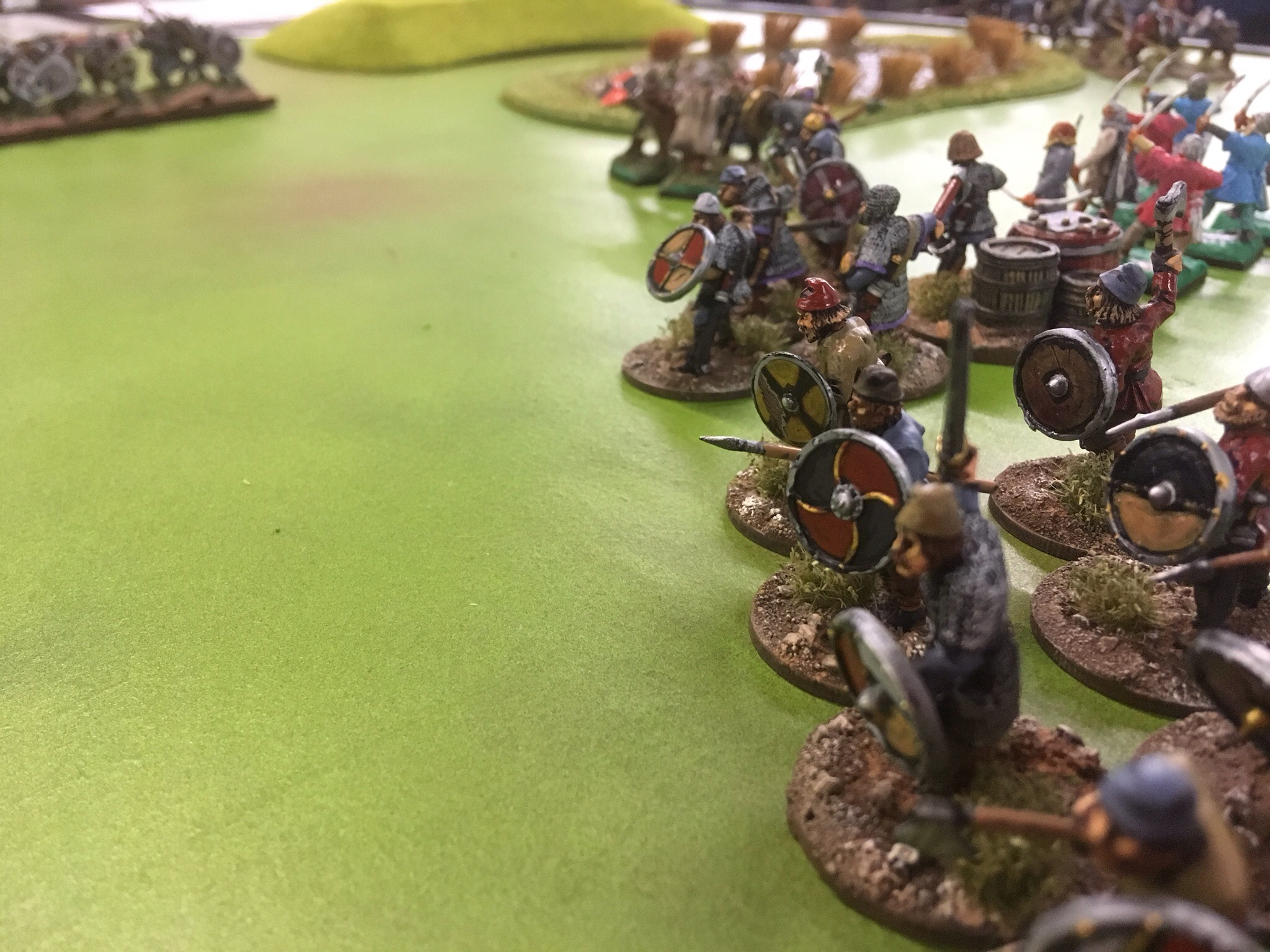 However, my great fyrd archers were made of sterner stuff. With a combination of reckless Viking sacrifices and great dice rolls, the Viking ” skateboard” sabot was looking very empty. Chris sacrificed the last three Vikings of this unit to bring down the Saxon hardmen.