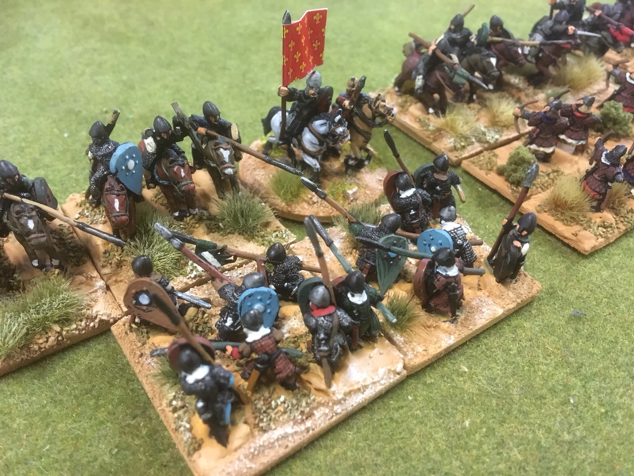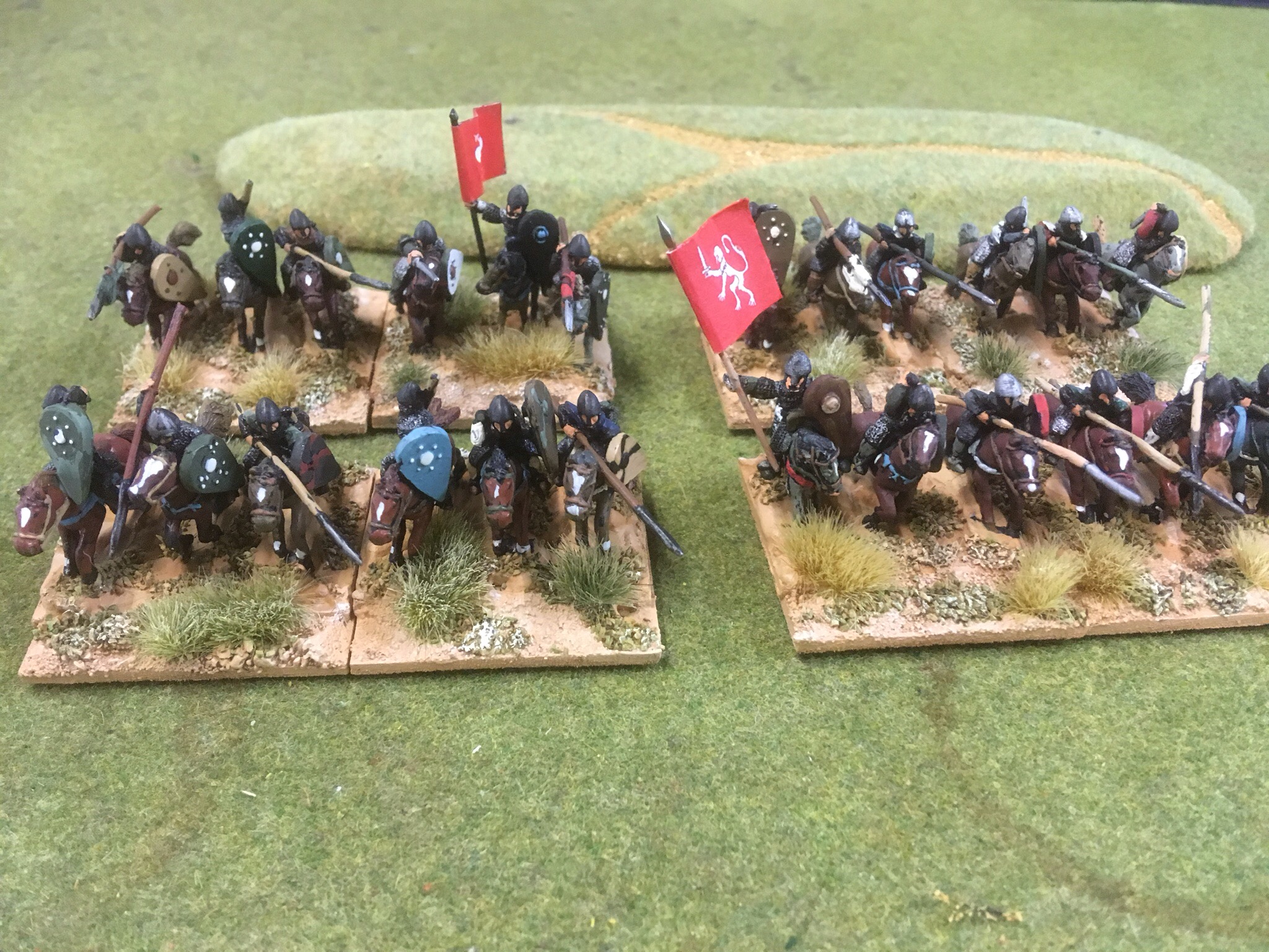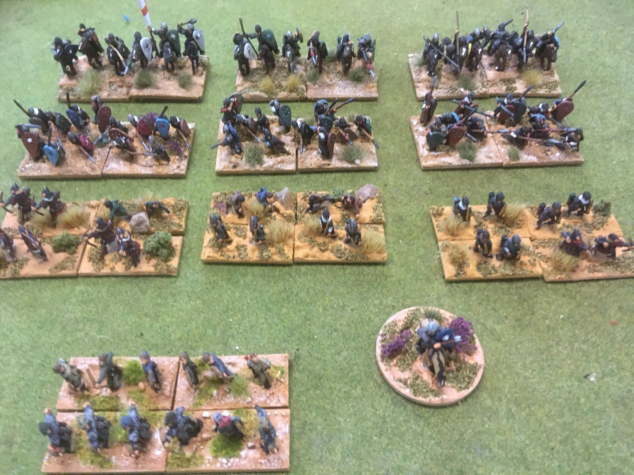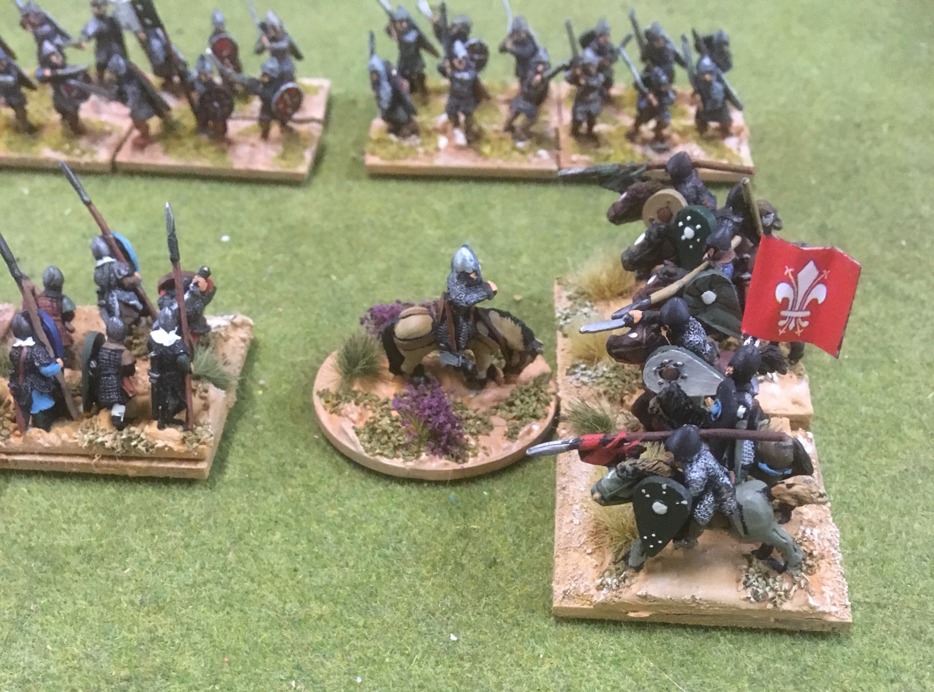 Replacing millimetre measuring and zones of control is Manticgames’ Kings of War historical. Old acquaintances mentioned the much loved Warmaster parentage but, it does give a super fast uncomplicated game. John brought a ten regiment army of four heavy milites, two dismounted Knights, two spear units and two crossbow units. After the briefest of introductions to the rules, he was off and deploying to fight with his brother over the rights to the ancestral homeland.