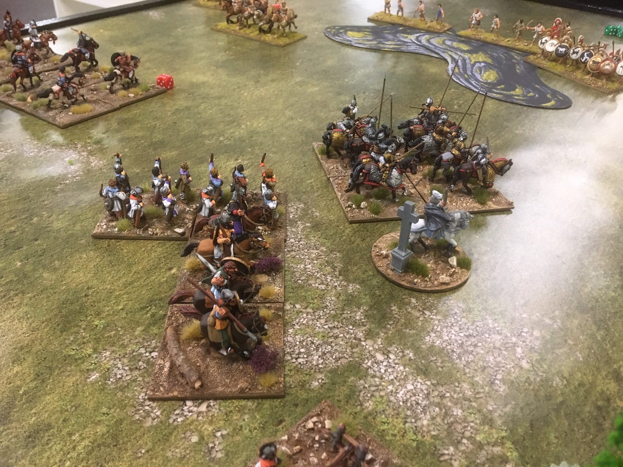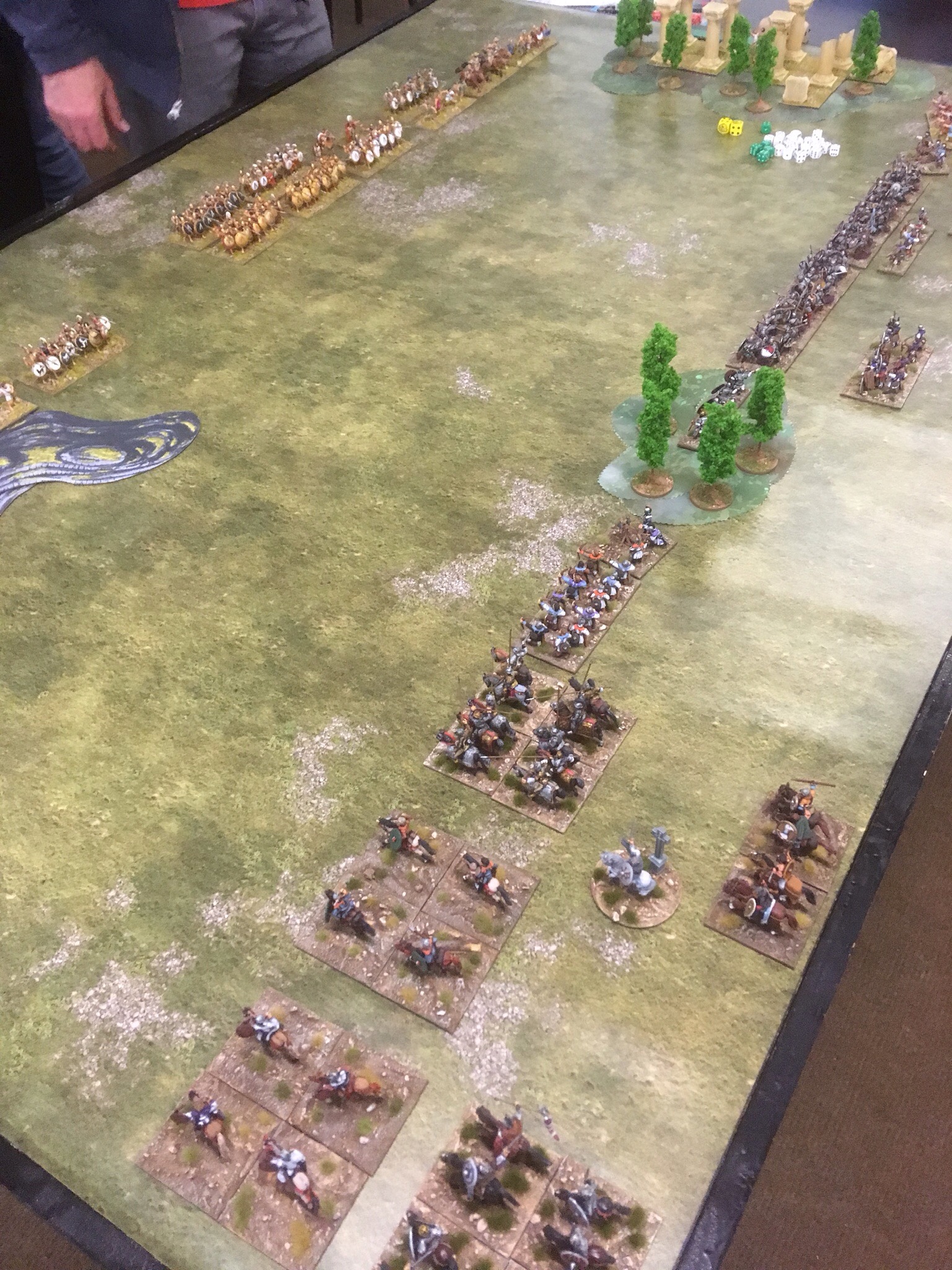 My cataphracts were to lead the assault, followed by two units of heavy horse to exploit the breakthrough. I was thinking opening scenes of Gladiator but it didn’t quite turn out like that. I got drawn into a missile fight between our mounted skirmishers and that drew me closer to Steve’s prepared killing ground.
