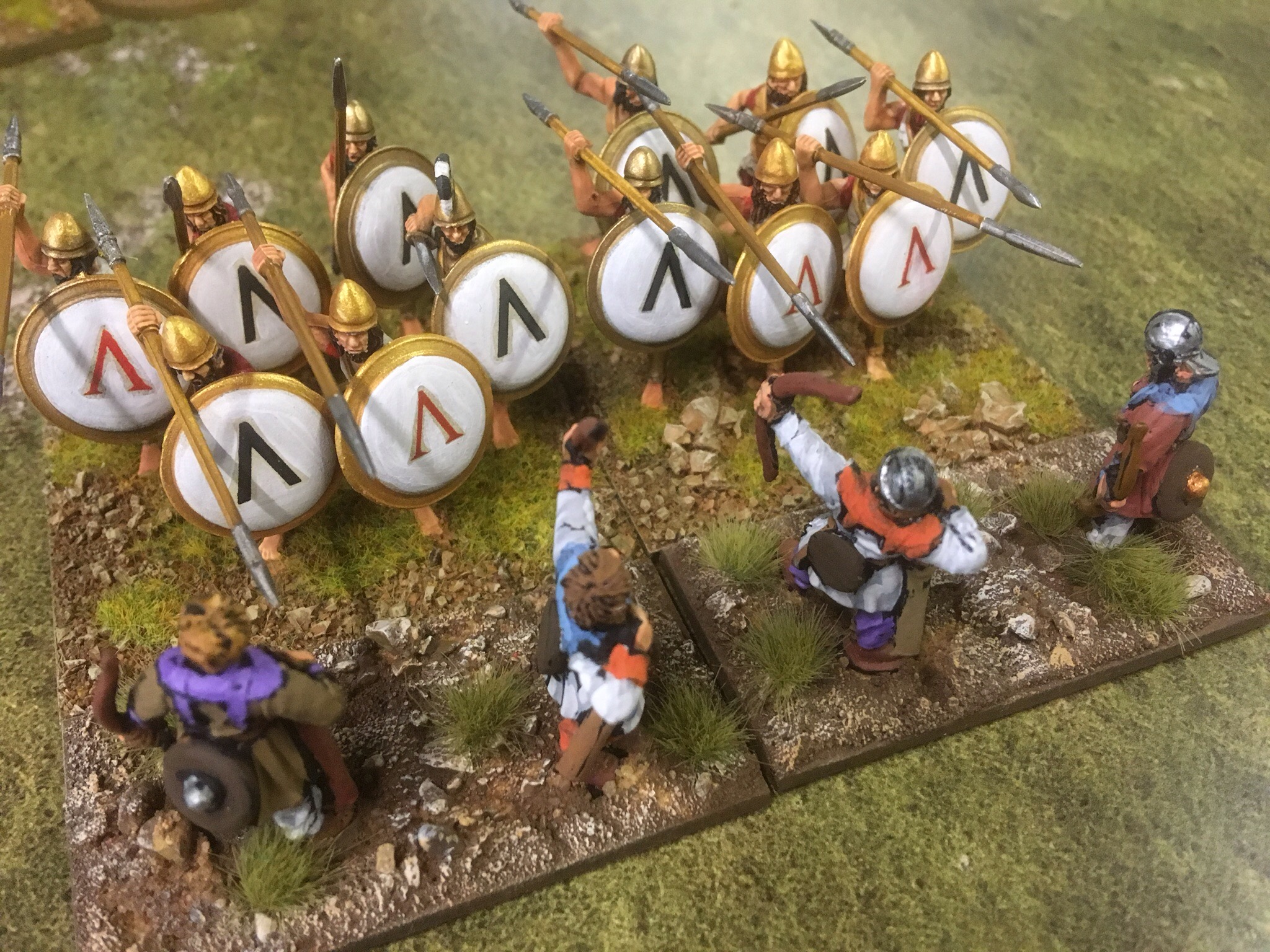 In the centre my skirmishers were tasked with holding up the Greek foot. After on volley, they were pounced on by the Hellenistic vanguard, with no evade move!