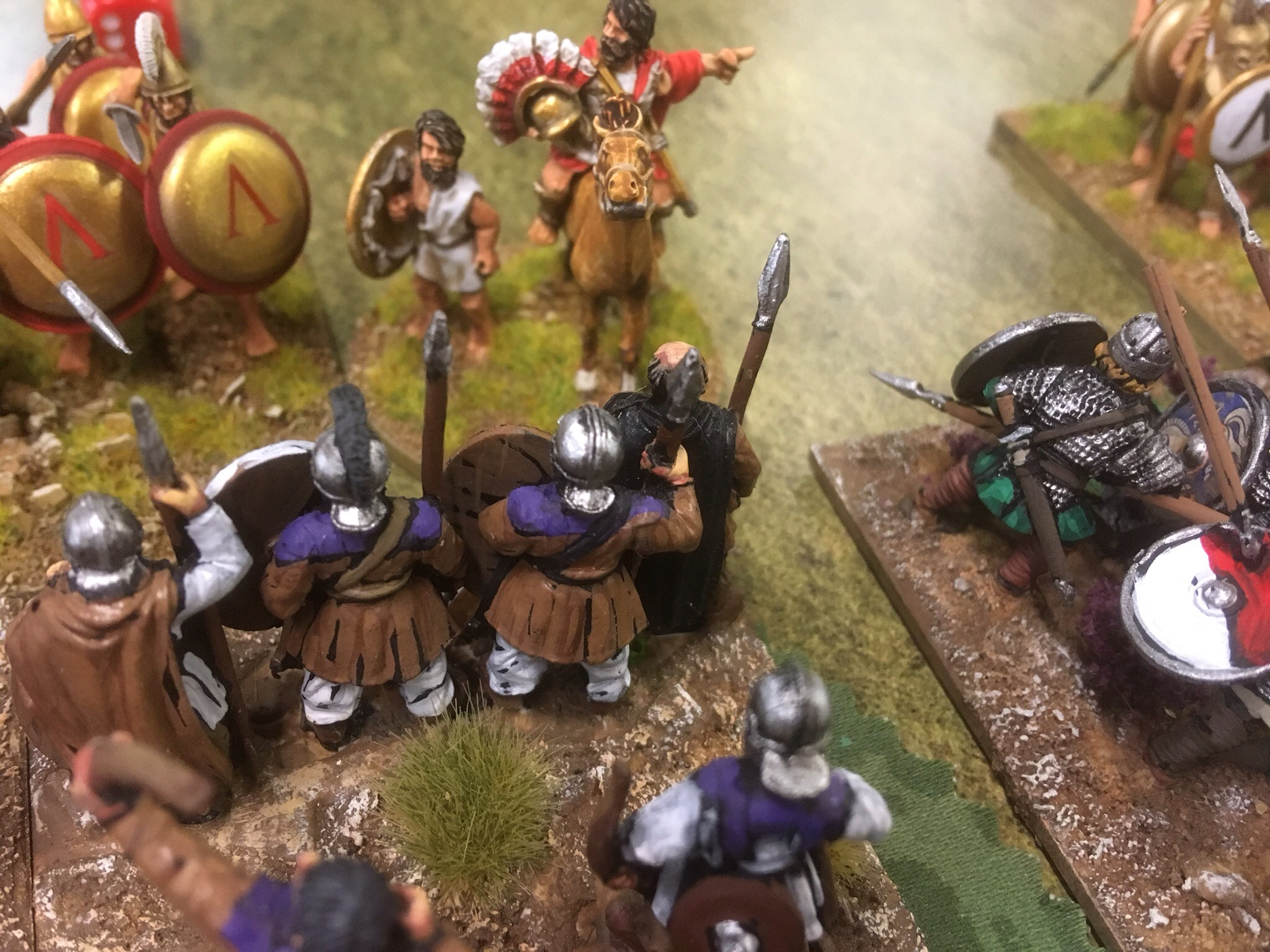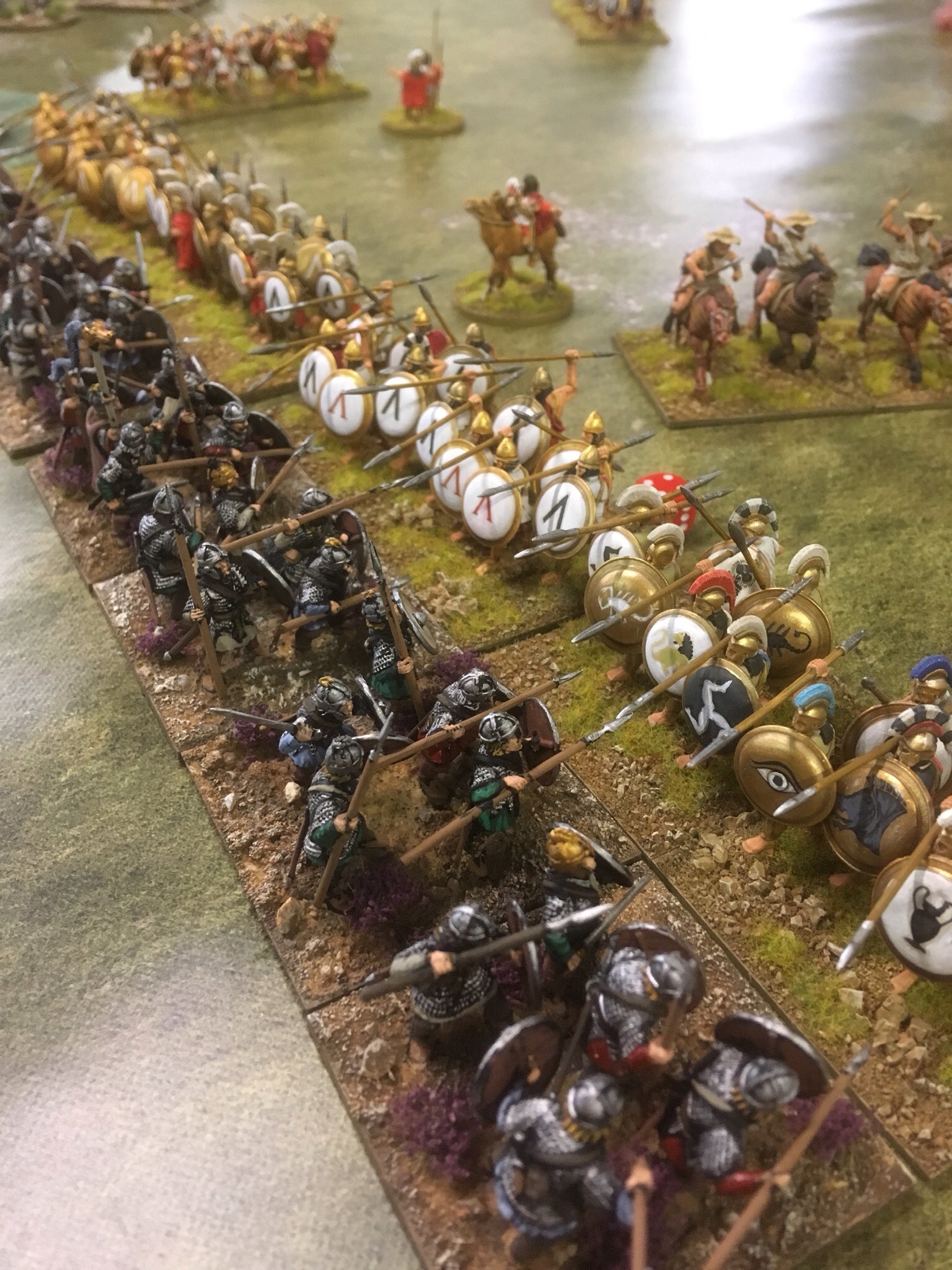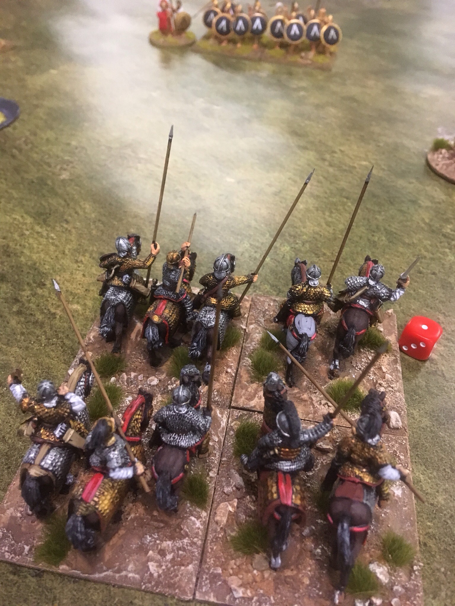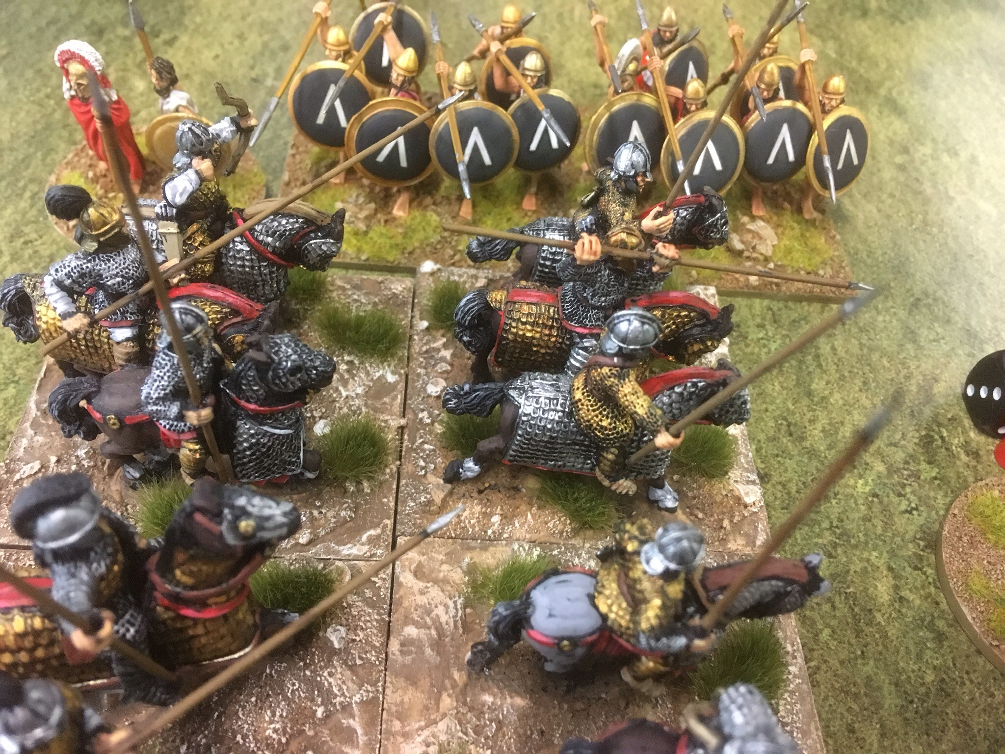 On my left, the Greek light horse were gone but a storm of slingshots started to land. First a few and then a whole storm of slingshots. I rashly stayed in position to finish off his skirmishers but the shots from the bushes were costing me dear. It also meant that I could not complete my movement across the table to roll up the hoplites. They even had the audacity to unhorse one of my cataphracts!