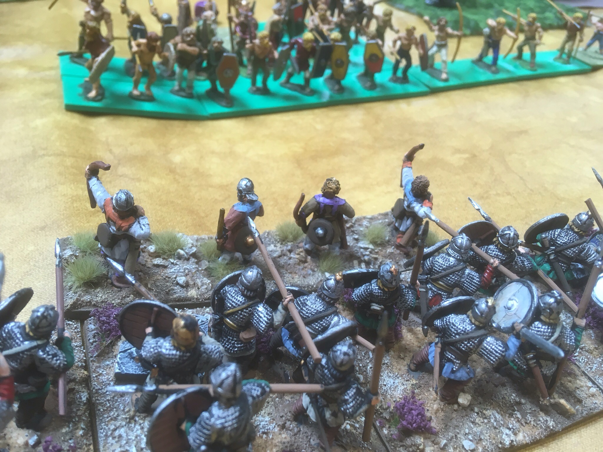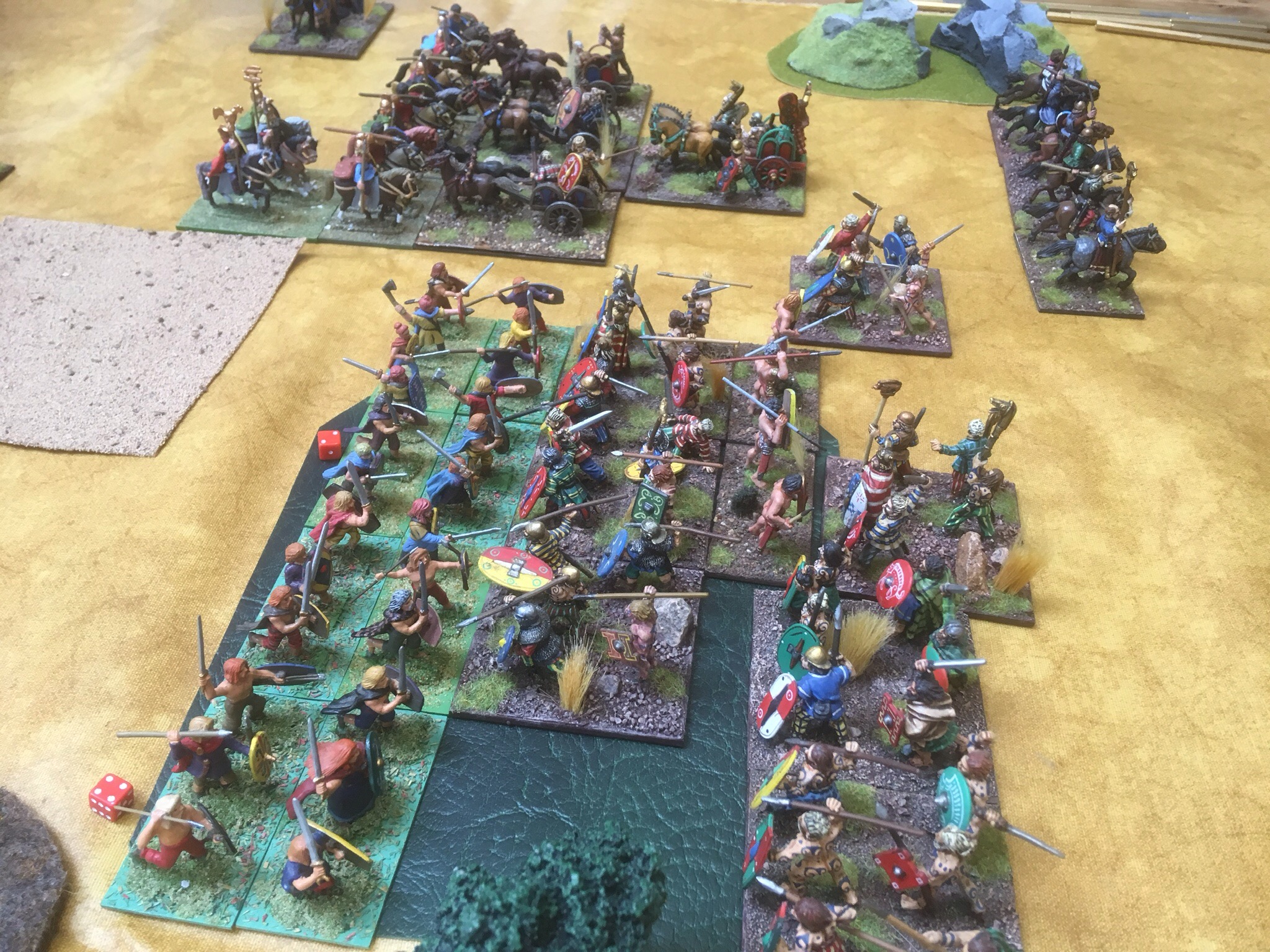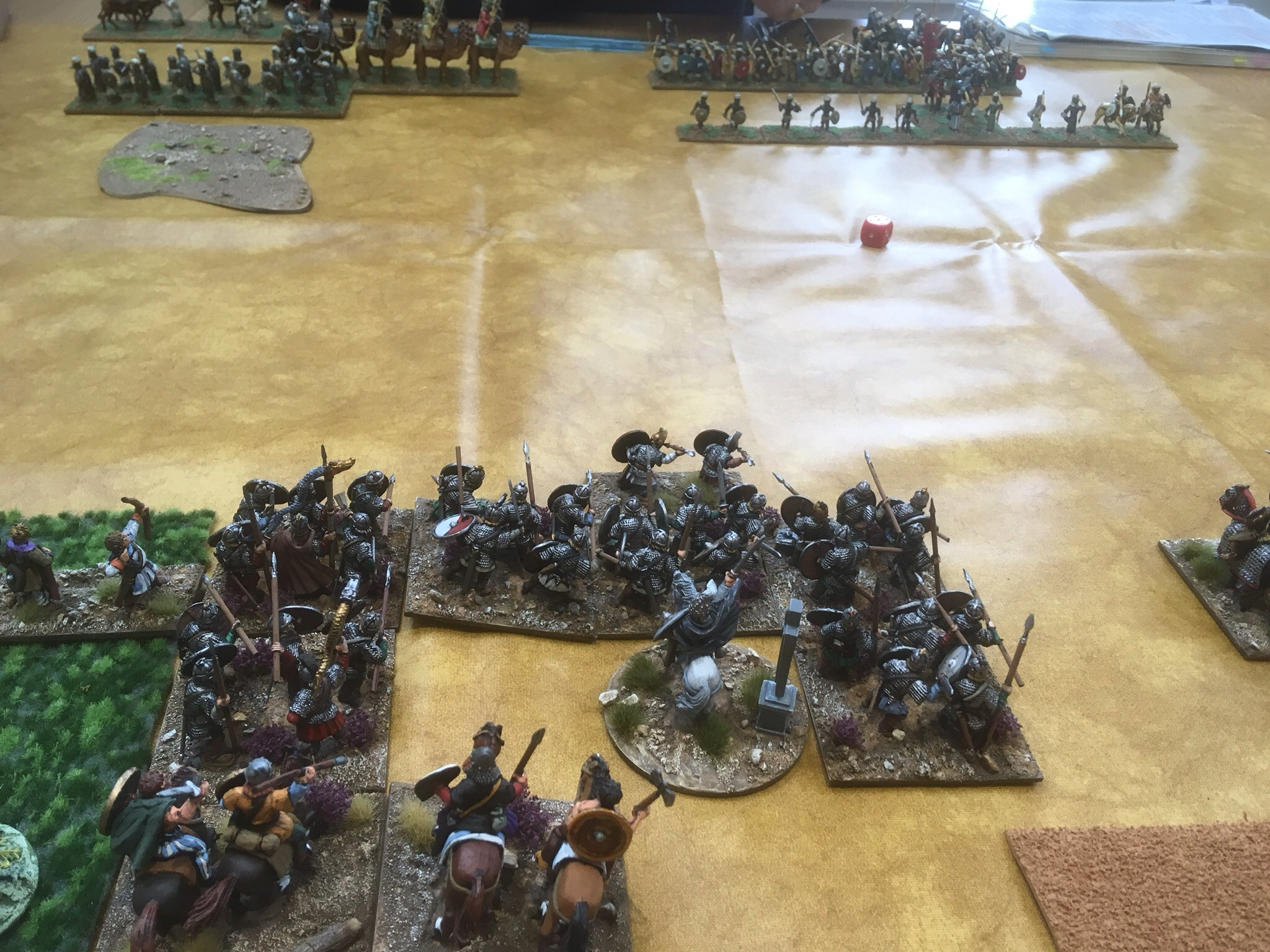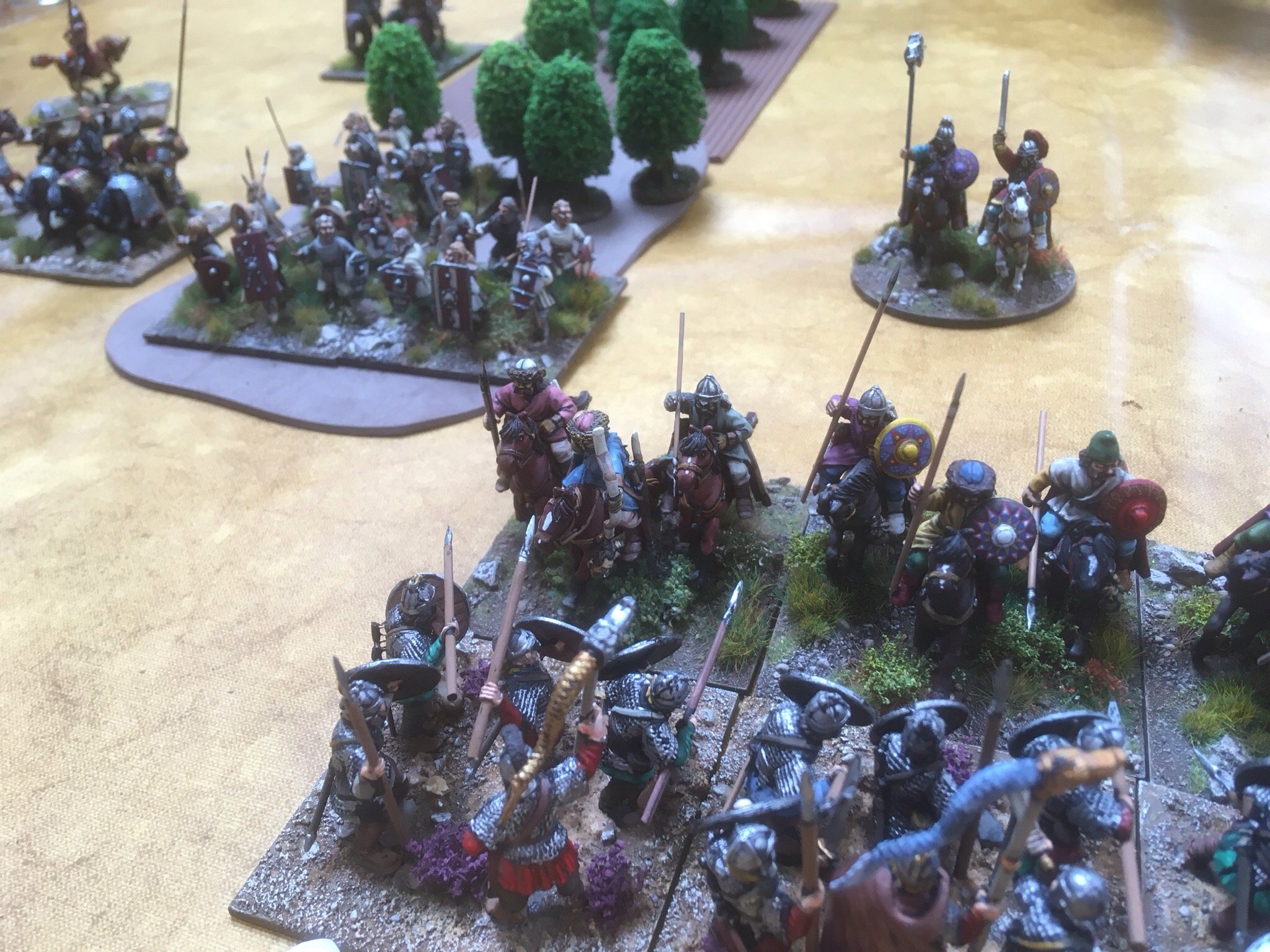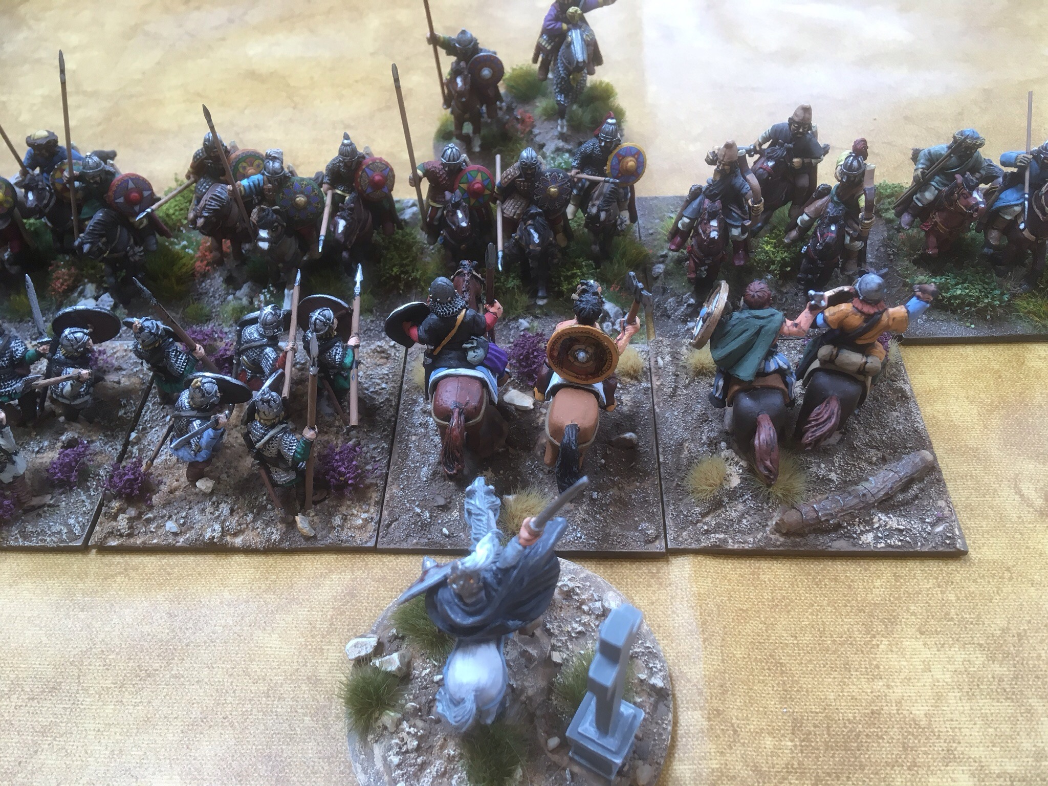 Game two was against Adrian’s Hunnic host. This army is one of the best I have ever seen! Muted colours but such an eye for detail. From the moment he put down his camp, I knew it would be a delight to look at. While we recounted tales of football hooliganism from the Eighties, Adrian lay out a strong line of bow and lance armed nomads, but who was lurking in the woods?