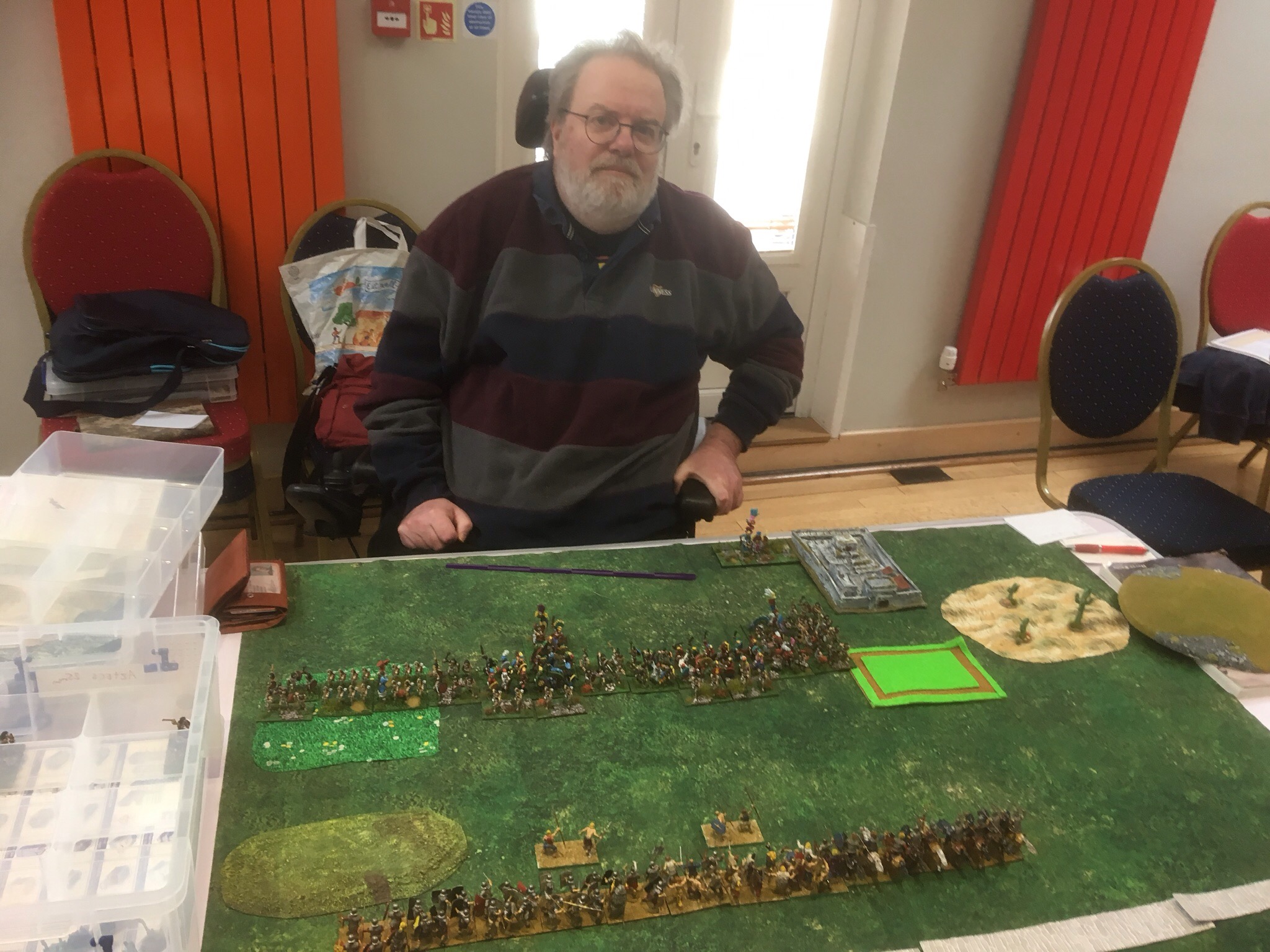 It was time to  draw breath  before the inevitable. Chris was manfully pitting his Vikings against Mr. Glew’s Early Germans. Martin was meanwhile busy trying to prise the coins out of the little invalid statue in the carpark.