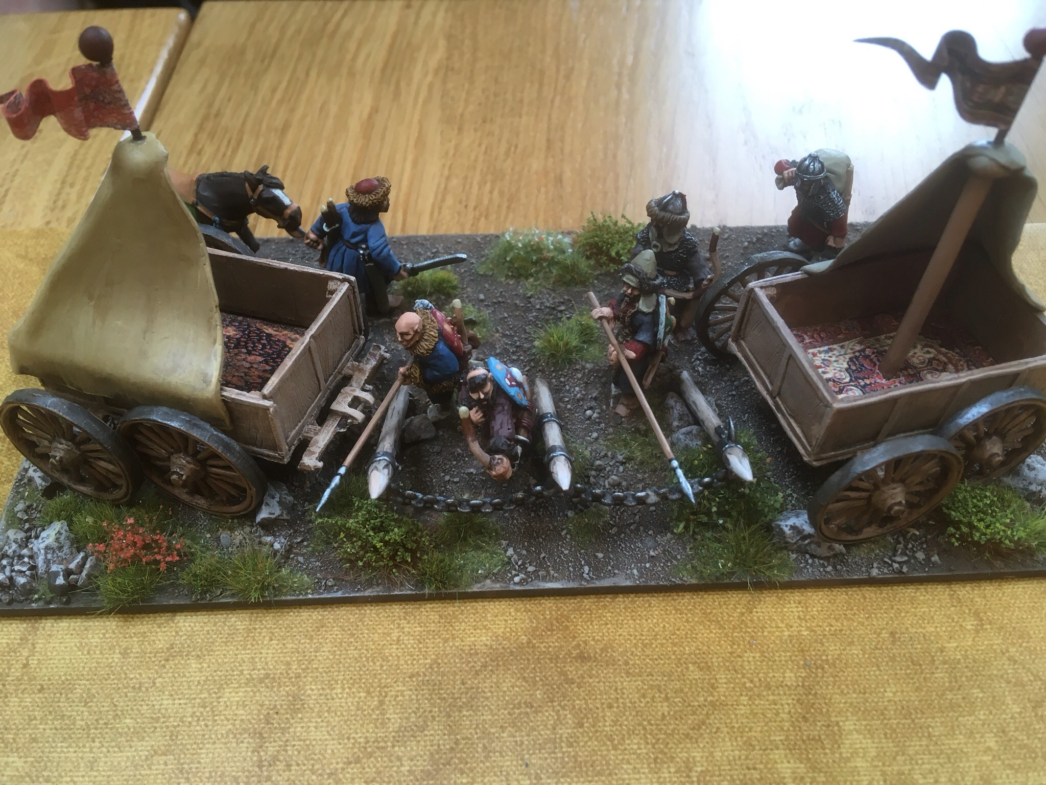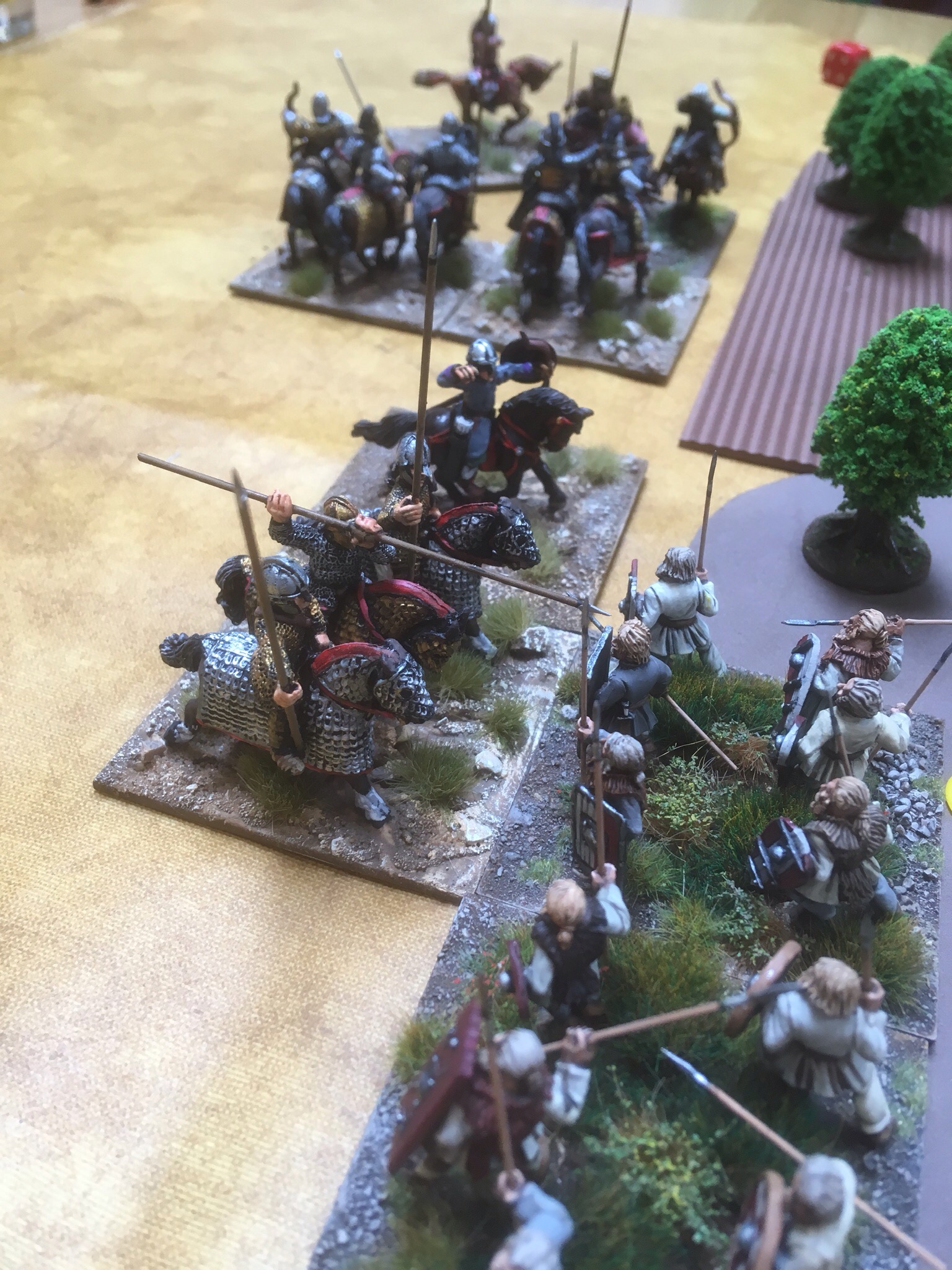 Game two was against Adrian’s Hunnic host. This army is one of the best I have ever seen! Muted colours but such an eye for detail. From the moment he put down his camp, I knew it would be a delight to look at. While we recounted tales of football hooliganism from the Eighties, Adrian lay out a strong line of bow and lance armed nomads, but who was lurking in the woods?