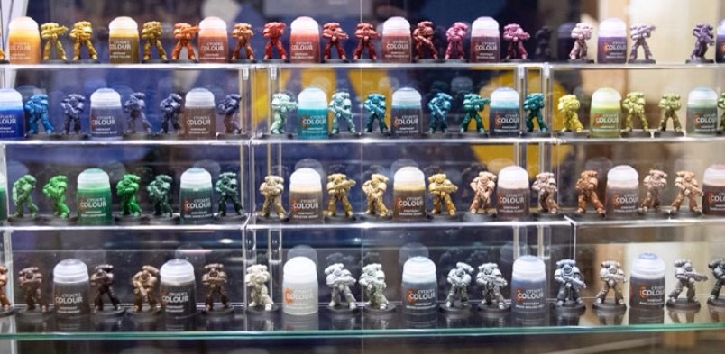 The base coat is either bone or light grey. There is a large range of ” contrast” paints that are added to the miniature and , wait for it, no other layer is needed! The “paint” is rather a mix of pigment and wash that covers the base coat but, is also oily enogh to define depth and raised areas. Clever heh?