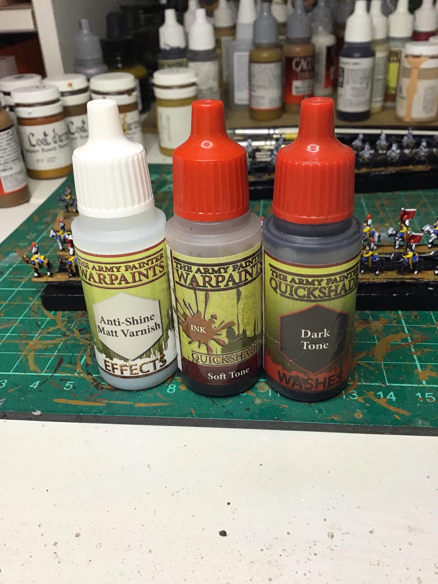 Stage fourteen.- Varnish is the main ingredient. This adds some nice shading and protects the models. The varnish thins the wash out beautifully so it doesn’t dull the colours or look too dirty.
