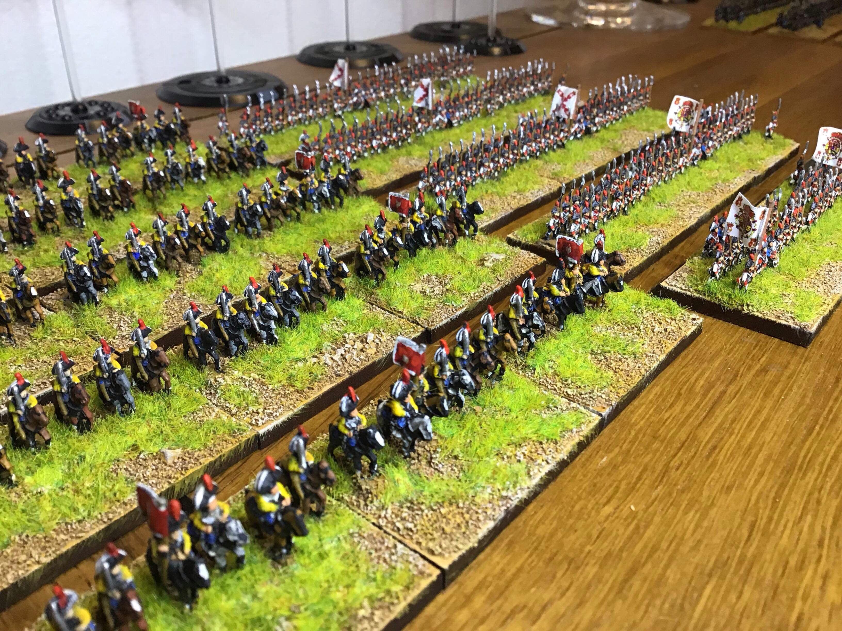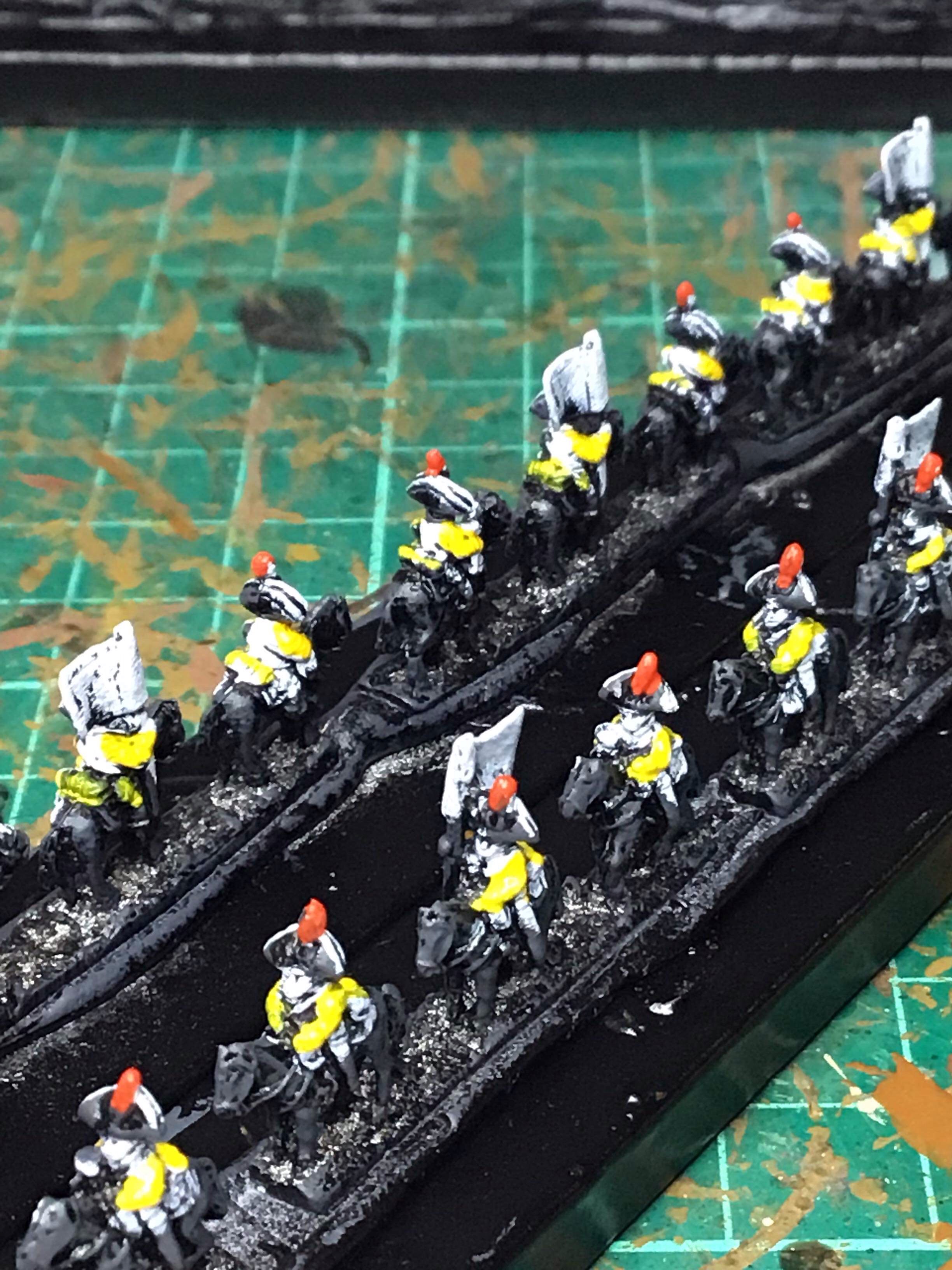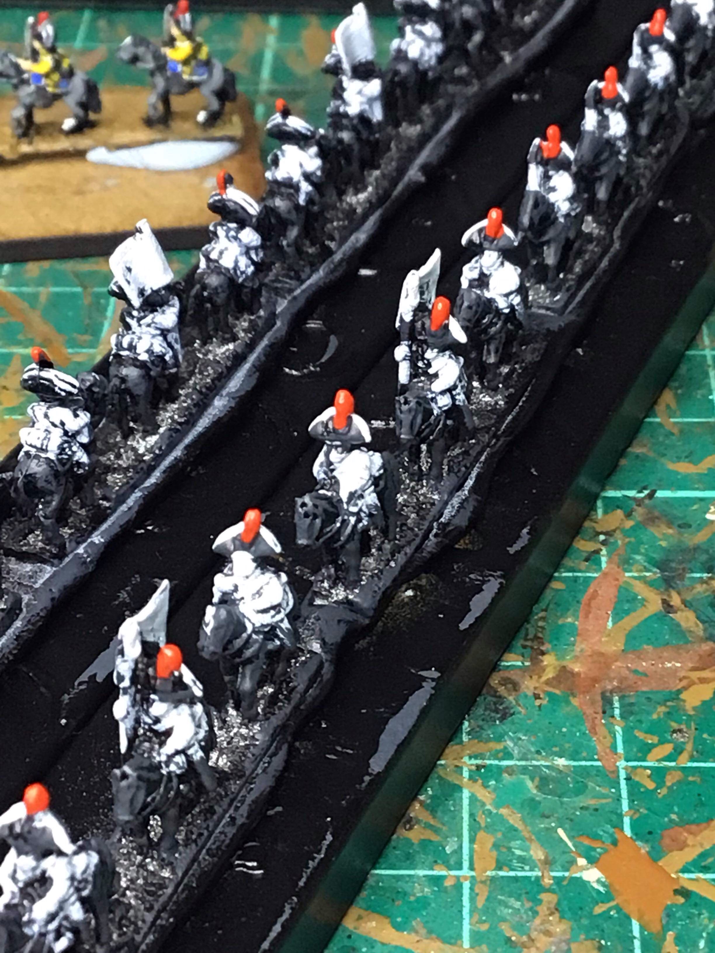 Stage three- Then White drybrush over areas that will be white or yellow on these Spanish dragoons. The white helps out with dotting in the colour later, as it covers better.