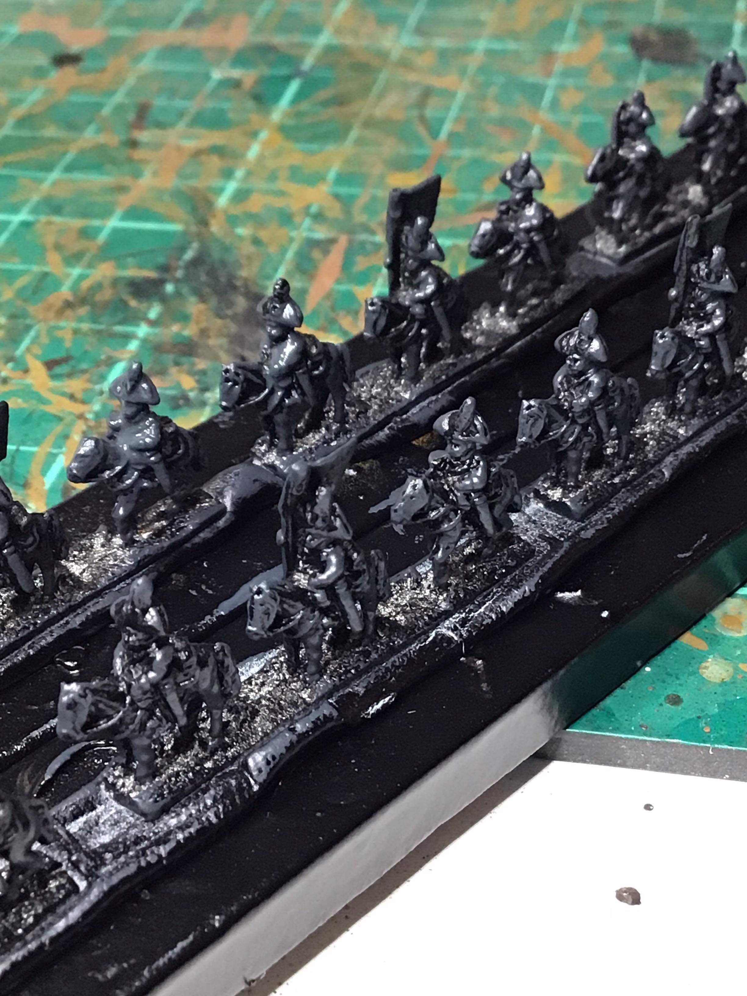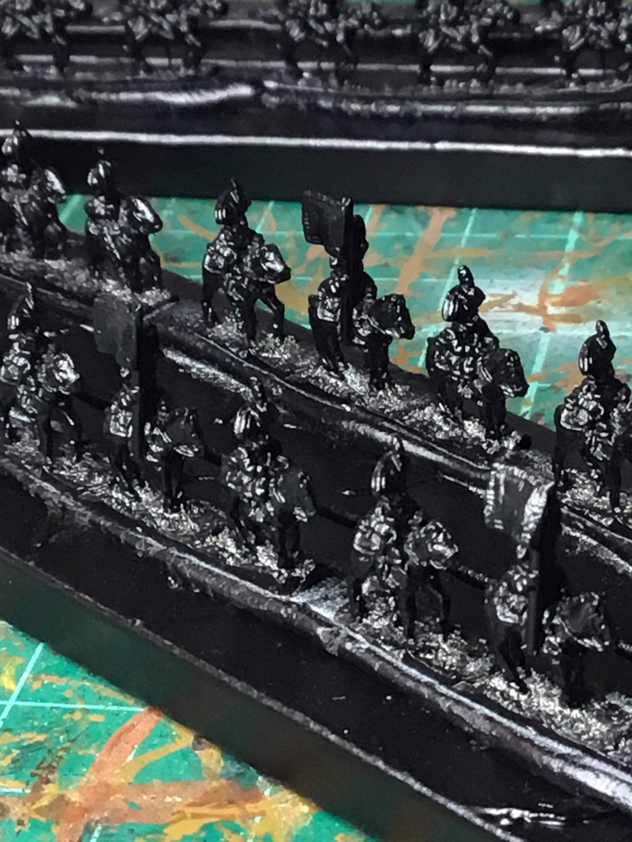 Stage two- Drybrush dark grey over minis to bring out detail. Note to beginners- dry brushing is when you load the brush up with thick paint, remove most of the paint into a tissue, then “drag” the brush over the minis. It does tend to ruin expensive brushed though.
