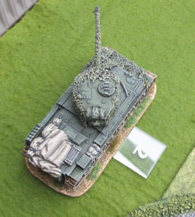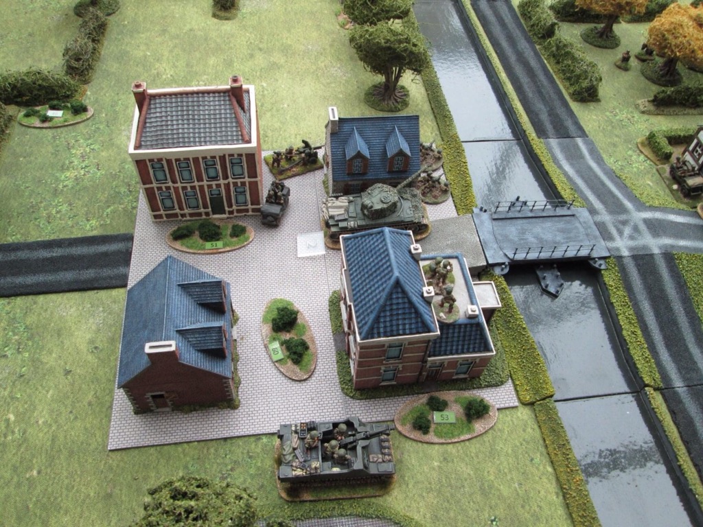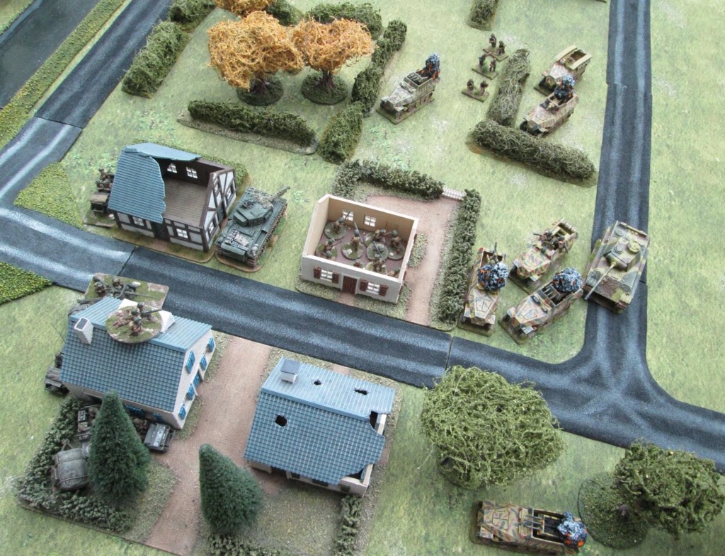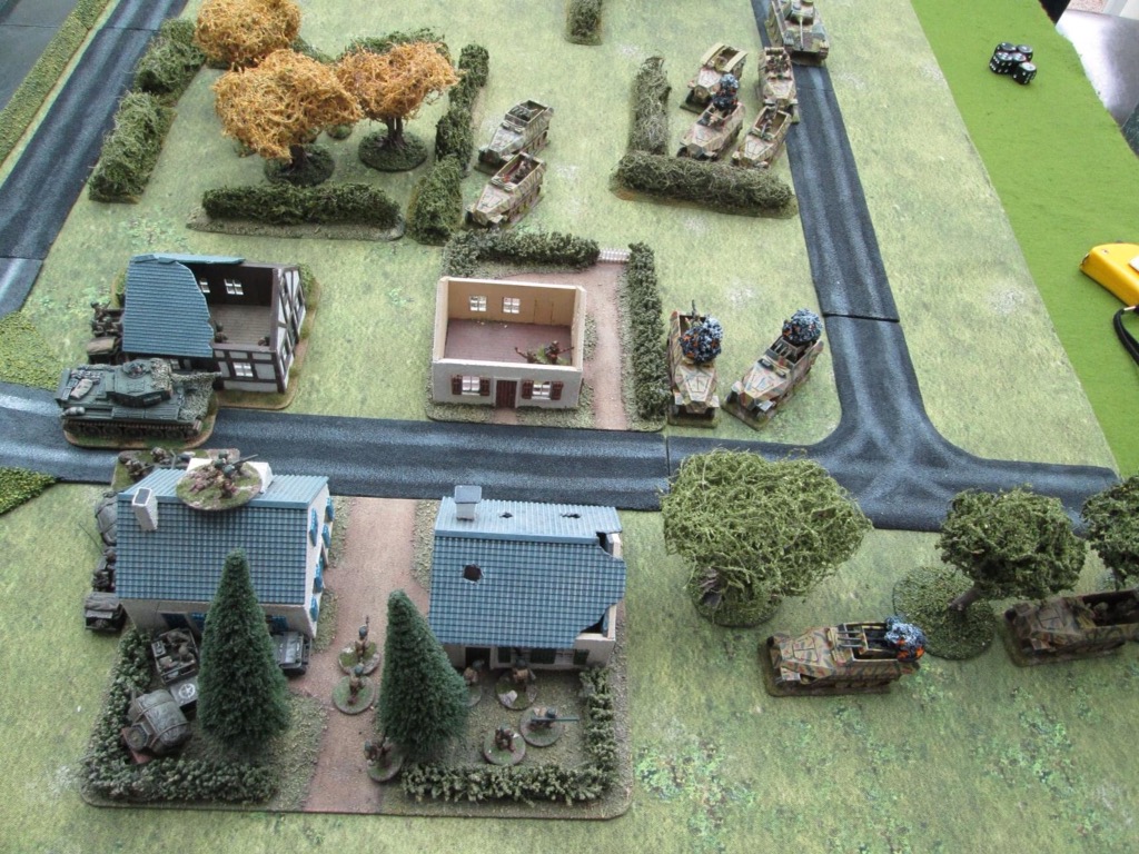 Three quarters of the buildings have been turned to ruins. In the house at the top left, only two figures from a ten strong company remain. The building on the bottom left is occupied by a jeep Bourne medium machine gun . The panzergrenadiers kompanie is also down to two figures, and it’s the second to occupy the exposed position! To the bottom left is the US company charged with defending the perimeter. It was their bazookas that stalled the German halftracks. Note the Cromwell tank that has come to aid the defence.