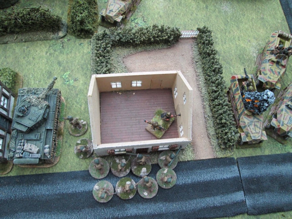 We left our gallant American heroes just hanging on to the village as the Panzerbrigade closes in. Top right of the above photo, you can see the sneaky Nazis debus and enter the buildings. The Americans open fire in a desperate attempt to eject the visitors.